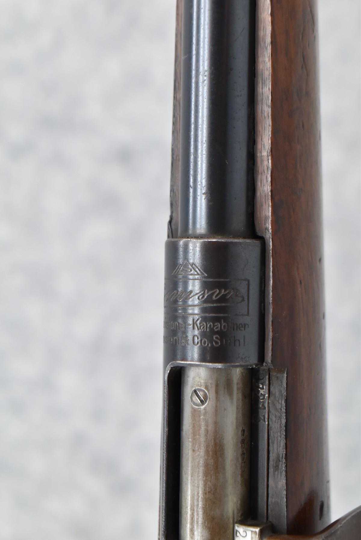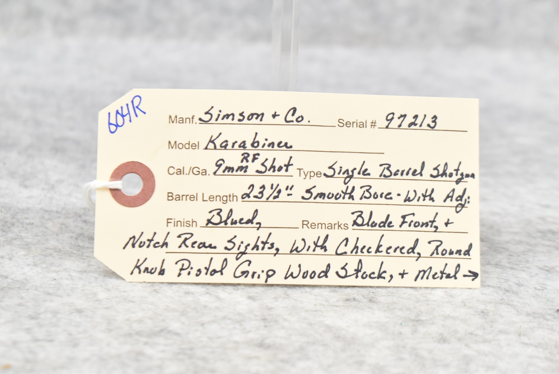 604R. Simson & Co. – Mod. Karabiner – 9mm RF Shot Cal. Single Barrel Shotgun – w/23 ½” Smoothbore Cal. w/Adj. Blade Front & Notch Rear Sights – Blued Finish – w/Checkered Round Knob Pistol Grip Wood Stock w/Metal Butt Plate