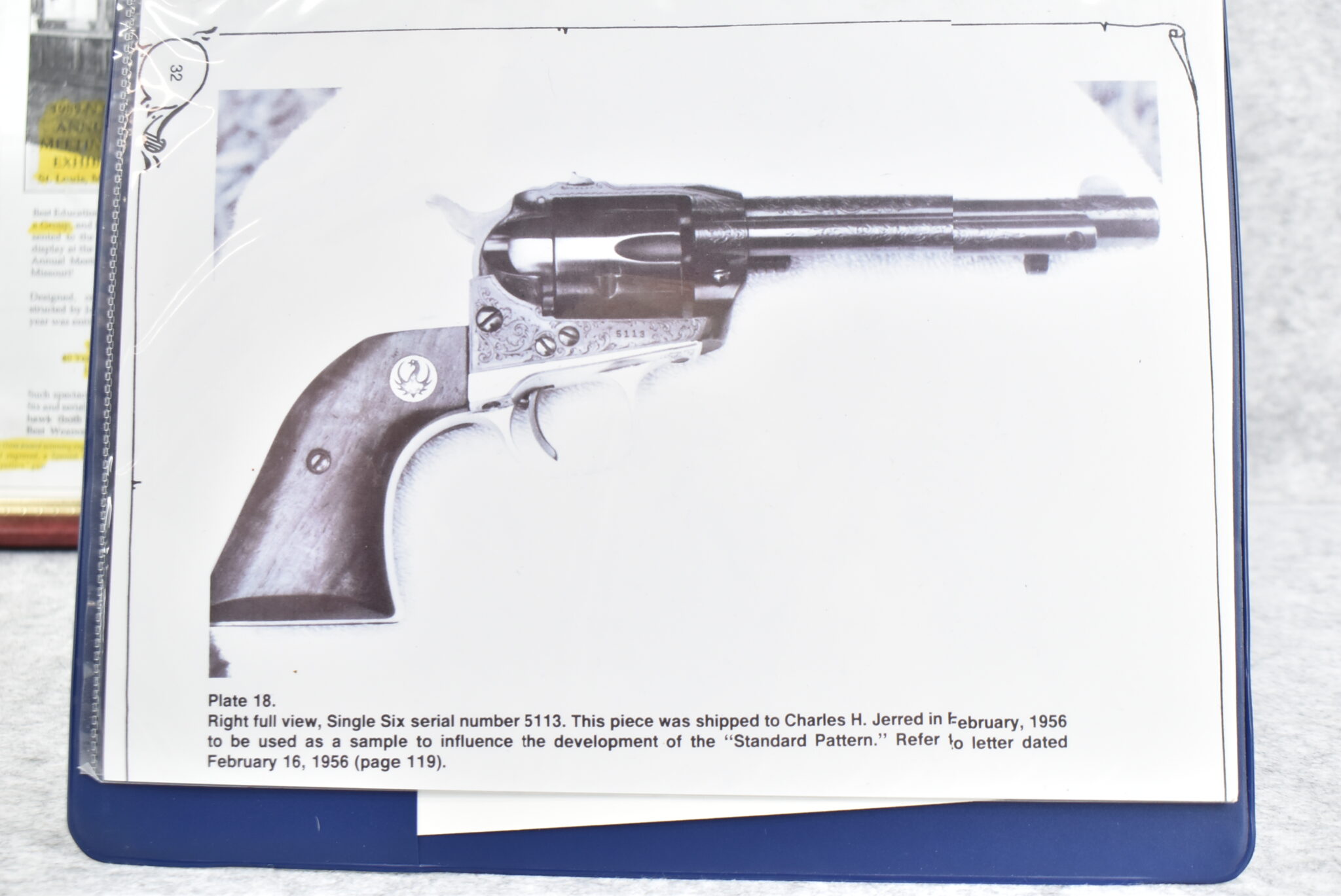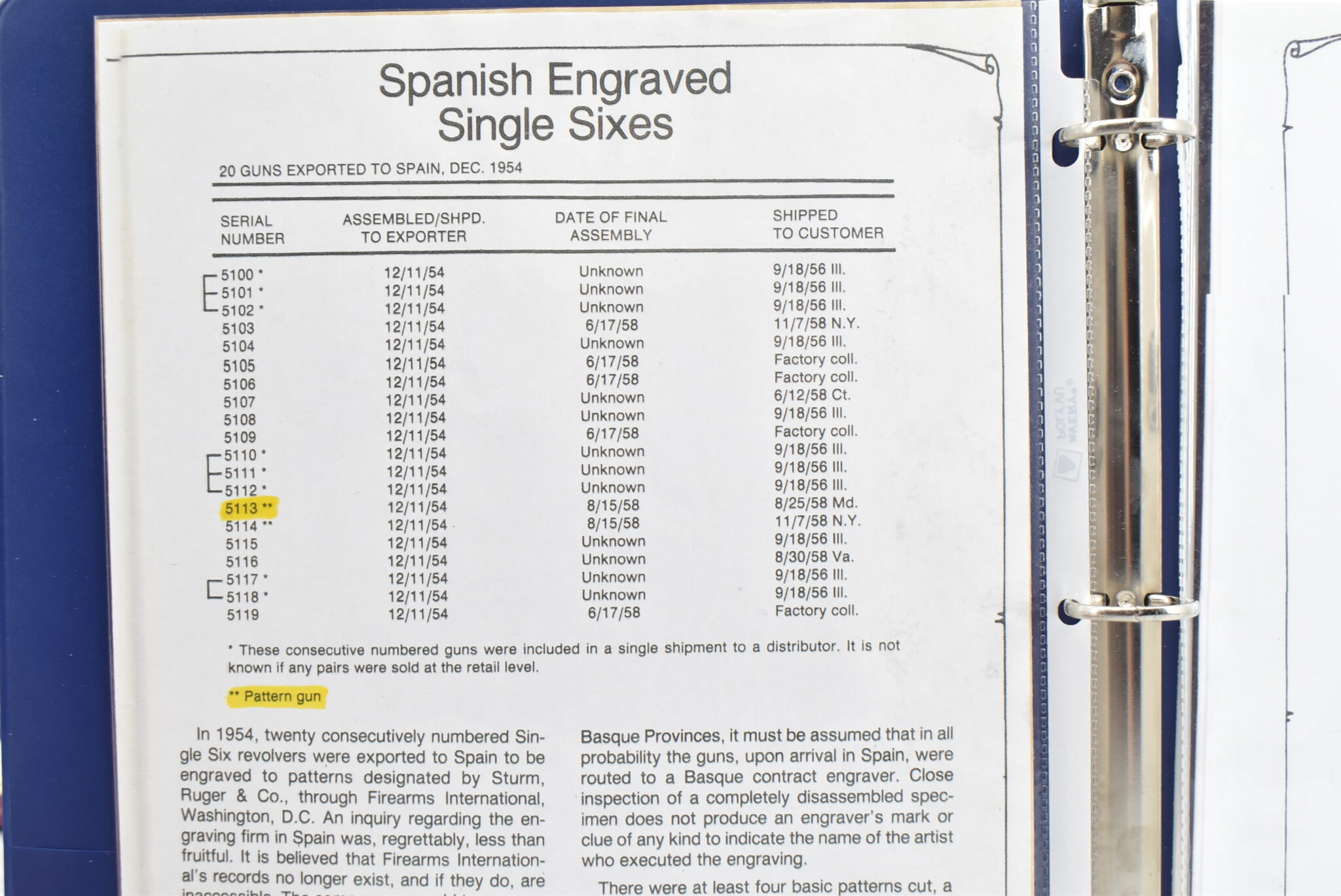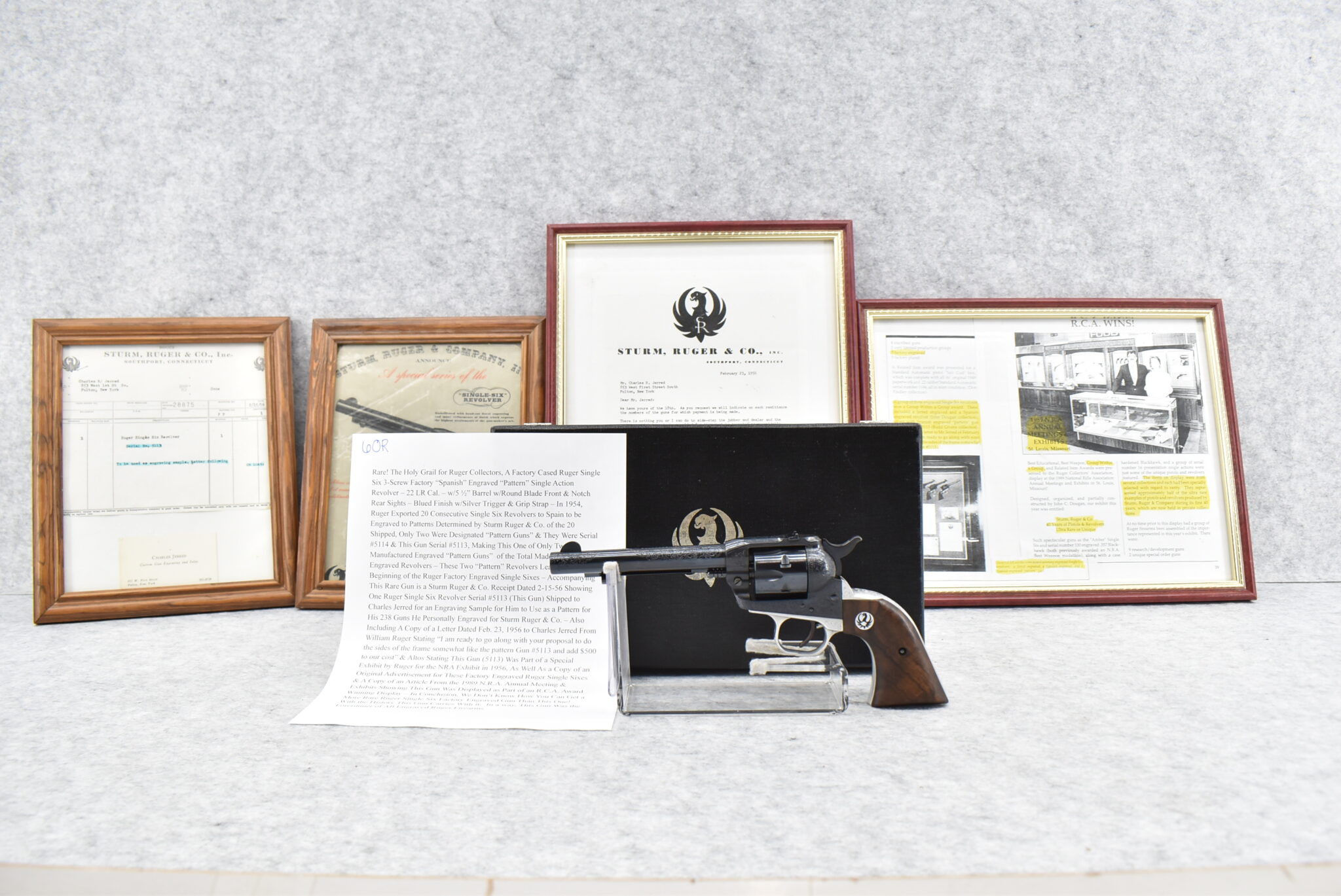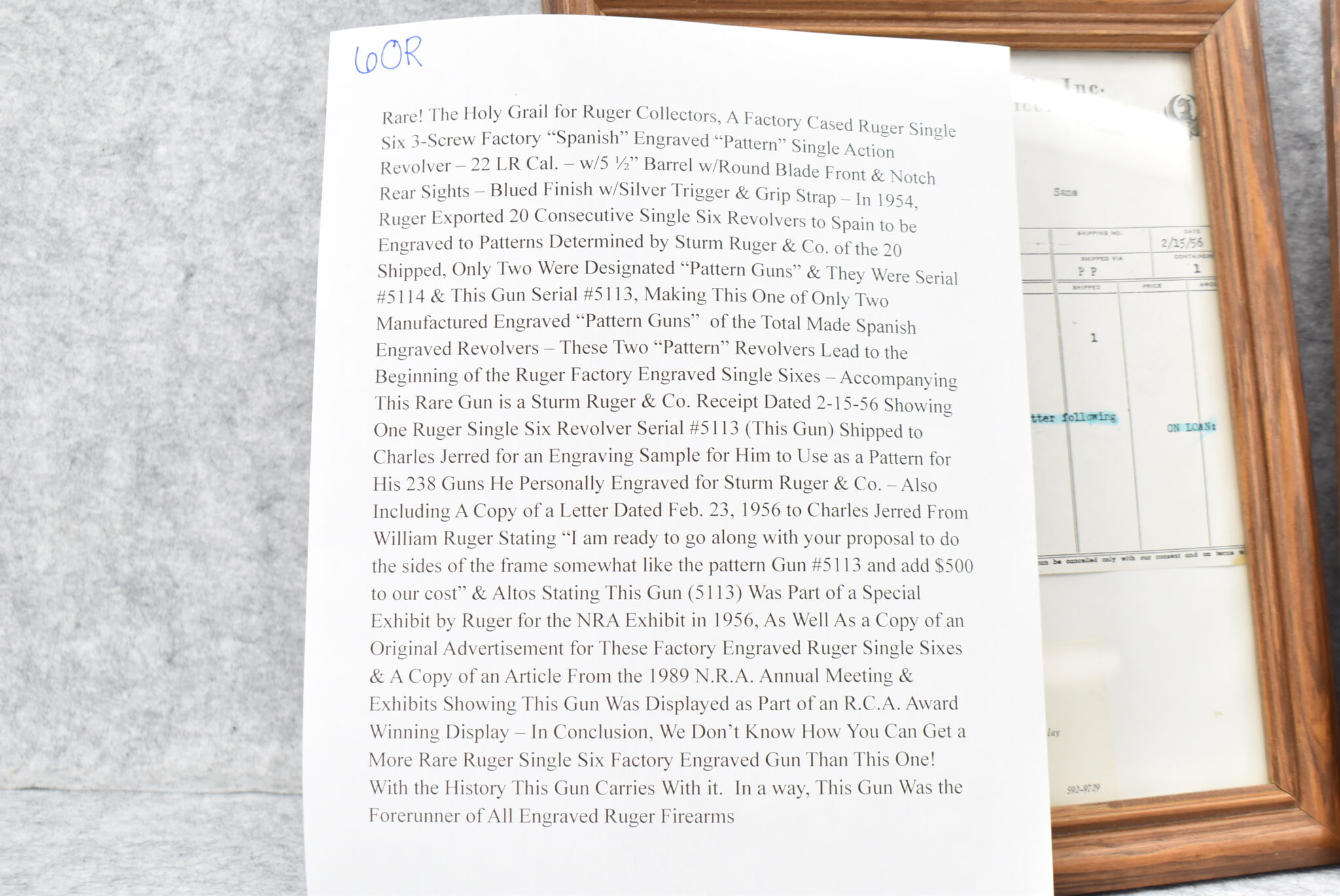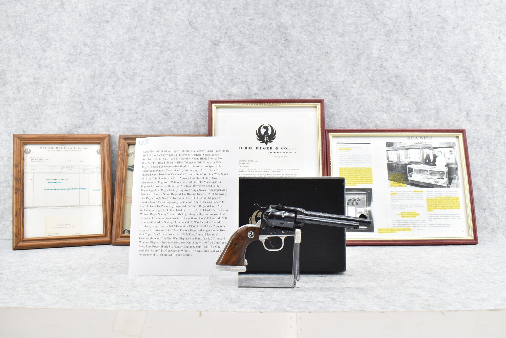 60R. Rare! The Holy Grail for Ruger Collectors, A Factory Cased Ruger Single Six 3-Screw Factory “Spanish” Engraved “Pattern” Single Action Revolver – 22 LR Cal. – w/5 ½” Barrel w/Round Blade Front & Notch Rear Sights – Blued Finish w/Silver Trigger & Grip Strap – In 1954, Ruger Exported 20 Consecutive Single Six Revolvers to Spain to be Engraved to Patterns Determined by Sturm Ruger & Co. of the 20 Shipped, Only Two Were Designated “Pattern Guns” & They Were Serial #5114 & This Gun Serial #5113, Making This One of Only Two Manufactured Engraved “Pattern Guns” of the Total Made Spanish Engraved Revolvers – These Two “Pattern” Revolvers Lead to the Beginning of the Ruger Factory Engraved Single Sixes – Accompanying This Rare Gun is a Sturm Ruger & Co. Receipt Dated 2-15-56 Showing One Ruger Single Six Revolver Serial #5113 (This Gun) Shipped to Charles Jerred for an Engraving Sample for Him to Use as a Pattern for His 238 Guns He Personally Engraved for Sturm Ruger & Co. – Also Including A Copy of a Letter Dated Feb. 23, 1956 to Charles Jerred From William Ruger Stating “I am ready to go along with your proposal to do the sides of the frame somewhat like the pattern Gun #5113 and add $500 to our cost” & Altos Stating This Gun (5113) Was Part of a Special Exhibit by Ruger for the NRA Exhibit in 1956, As Well As a Copy of an Original Advertisement for These Factory Engraved Ruger Single Sixes & A Copy of an Article From the 1989 N.R.A. Annual Meeting & Exhibits Showing This Gun Was Displayed as Part of an R.C.A. Award Winning Display – In Conclusion, We Don’t Know How You Can Get a More Rare Ruger Single Six Factory Engraved Gun Than This One! With the History This Gun Carries With it. In a way, This Gun Was the Forerunner of All Engraved Ruger Firearms