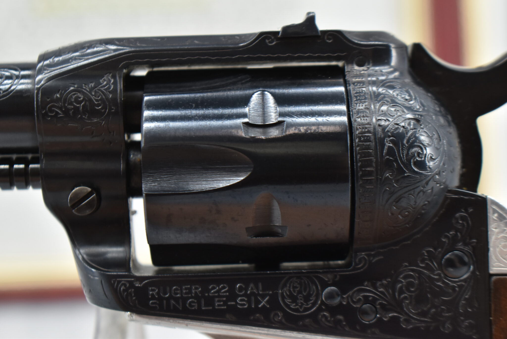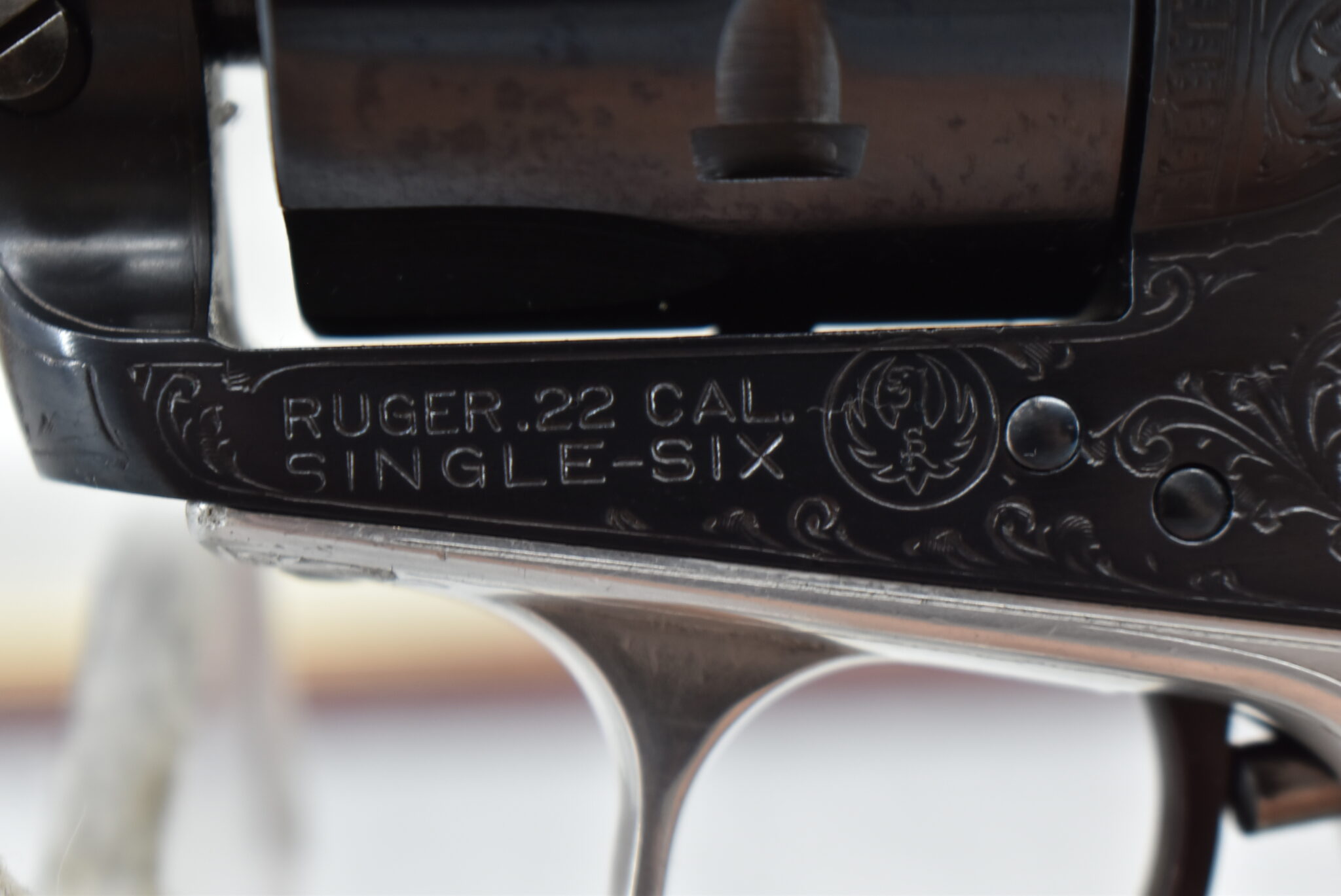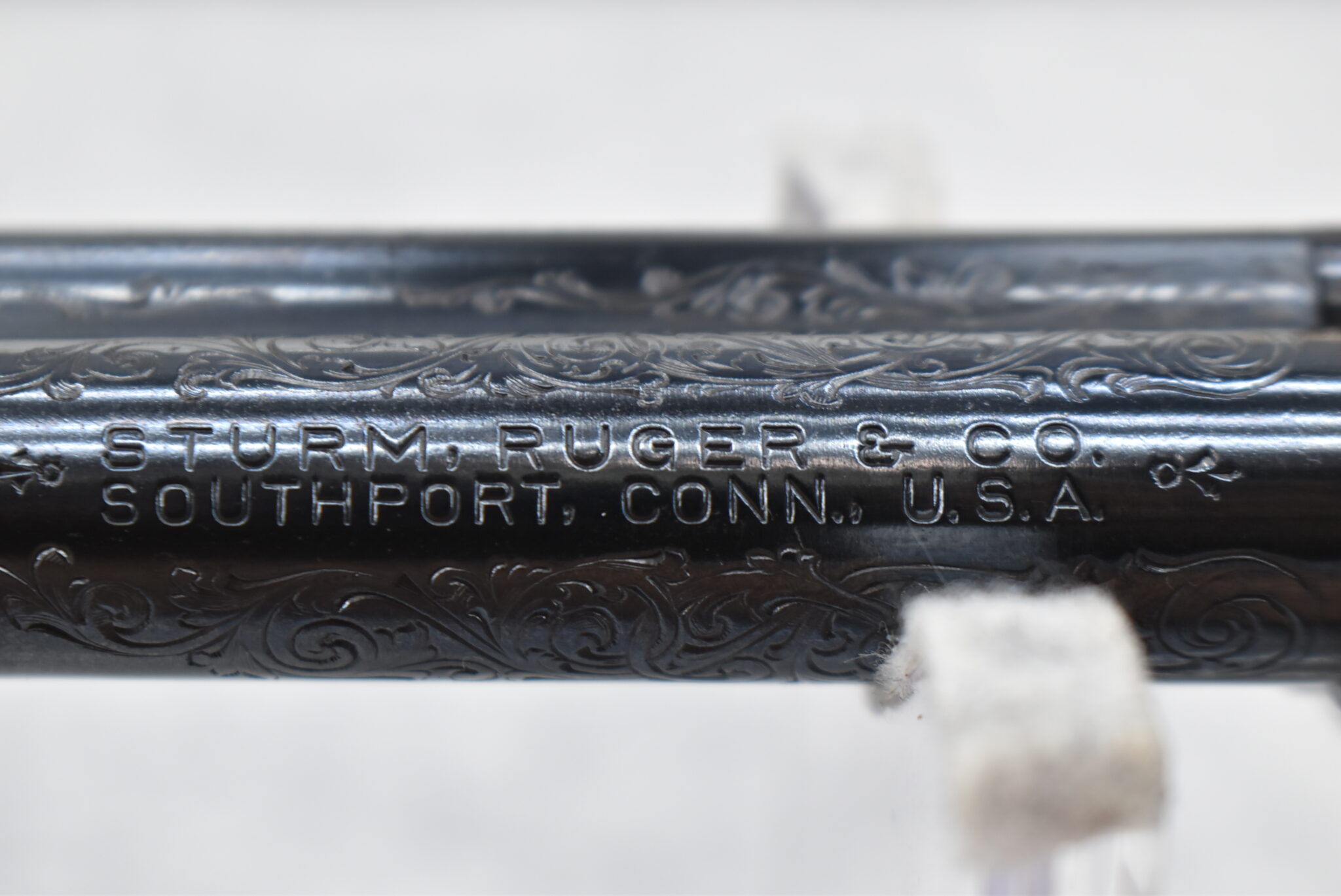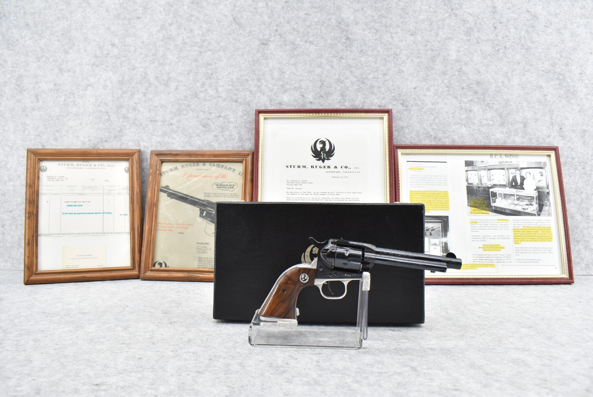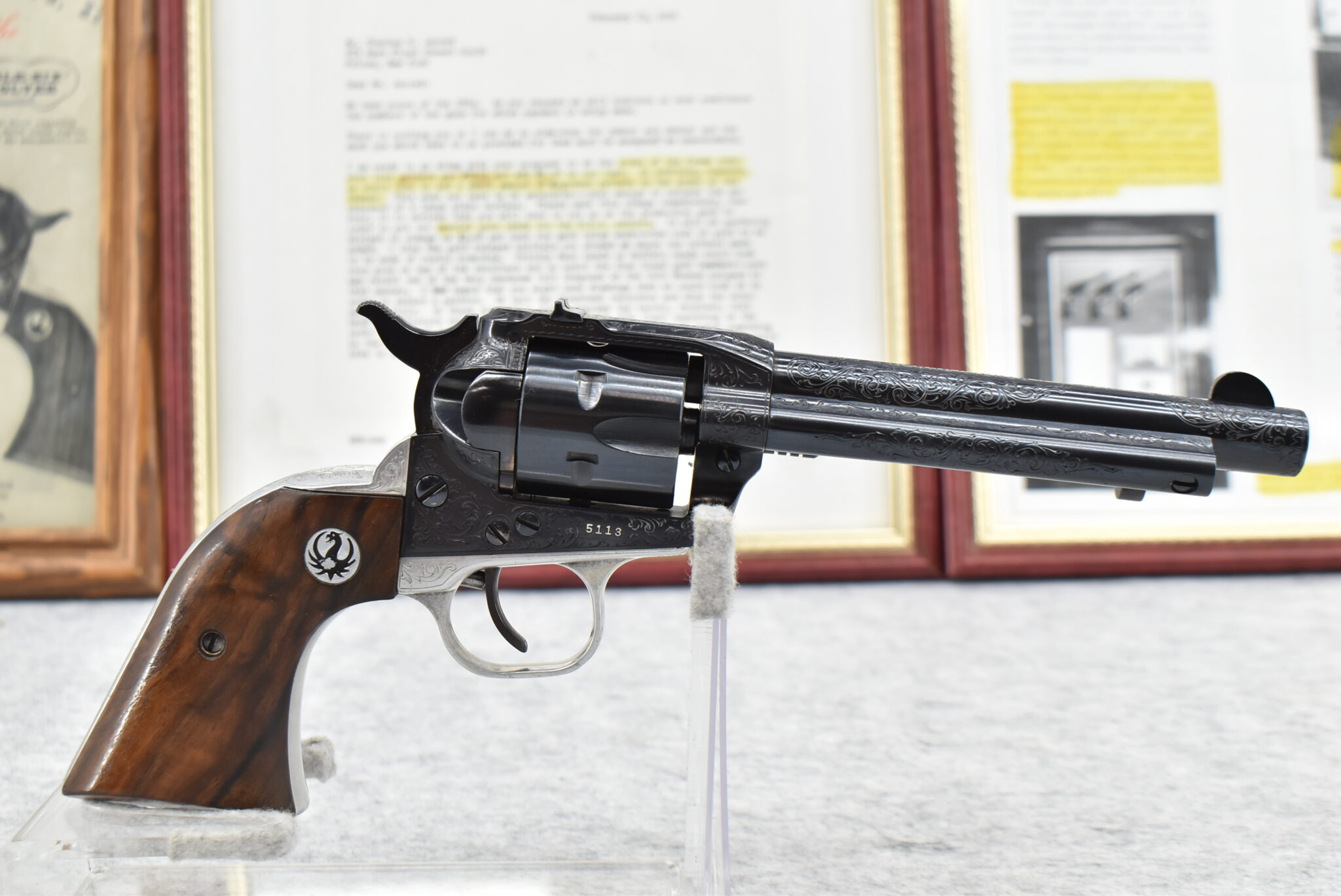 60R. Rare! The Holy Grail for Ruger Collectors, A Factory Cased Ruger Single Six 3-Screw Factory “Spanish” Engraved “Pattern” Single Action Revolver – 22 LR Cal. – w/5 ½” Barrel w/Round Blade Front & Notch Rear Sights – Blued Finish w/Silver Trigger & Grip Strap – In 1954, Ruger Exported 20 Consecutive Single Six Revolvers to Spain to be Engraved to Patterns Determined by Sturm Ruger & Co. of the 20 Shipped, Only Two Were Designated “Pattern Guns” & They Were Serial #5114 & This Gun Serial #5113, Making This One of Only Two Manufactured Engraved “Pattern Guns” of the Total Made Spanish Engraved Revolvers – These Two “Pattern” Revolvers Lead to the Beginning of the Ruger Factory Engraved Single Sixes – Accompanying This Rare Gun is a Sturm Ruger & Co. Receipt Dated 2-15-56 Showing One Ruger Single Six Revolver Serial #5113 (This Gun) Shipped to Charles Jerred for an Engraving Sample for Him to Use as a Pattern for His 238 Guns He Personally Engraved for Sturm Ruger & Co. – Also Including A Copy of a Letter Dated Feb. 23, 1956 to Charles Jerred From William Ruger Stating “I am ready to go along with your proposal to do the sides of the frame somewhat like the pattern Gun #5113 and add $500 to our cost” & Altos Stating This Gun (5113) Was Part of a Special Exhibit by Ruger for the NRA Exhibit in 1956, As Well As a Copy of an Original Advertisement for These Factory Engraved Ruger Single Sixes & A Copy of an Article From the 1989 N.R.A. Annual Meeting & Exhibits Showing This Gun Was Displayed as Part of an R.C.A. Award Winning Display – In Conclusion, We Don’t Know How You Can Get a More Rare Ruger Single Six Factory Engraved Gun Than This One! With the History This Gun Carries With it. In a way, This Gun Was the Forerunner of All Engraved Ruger Firearms