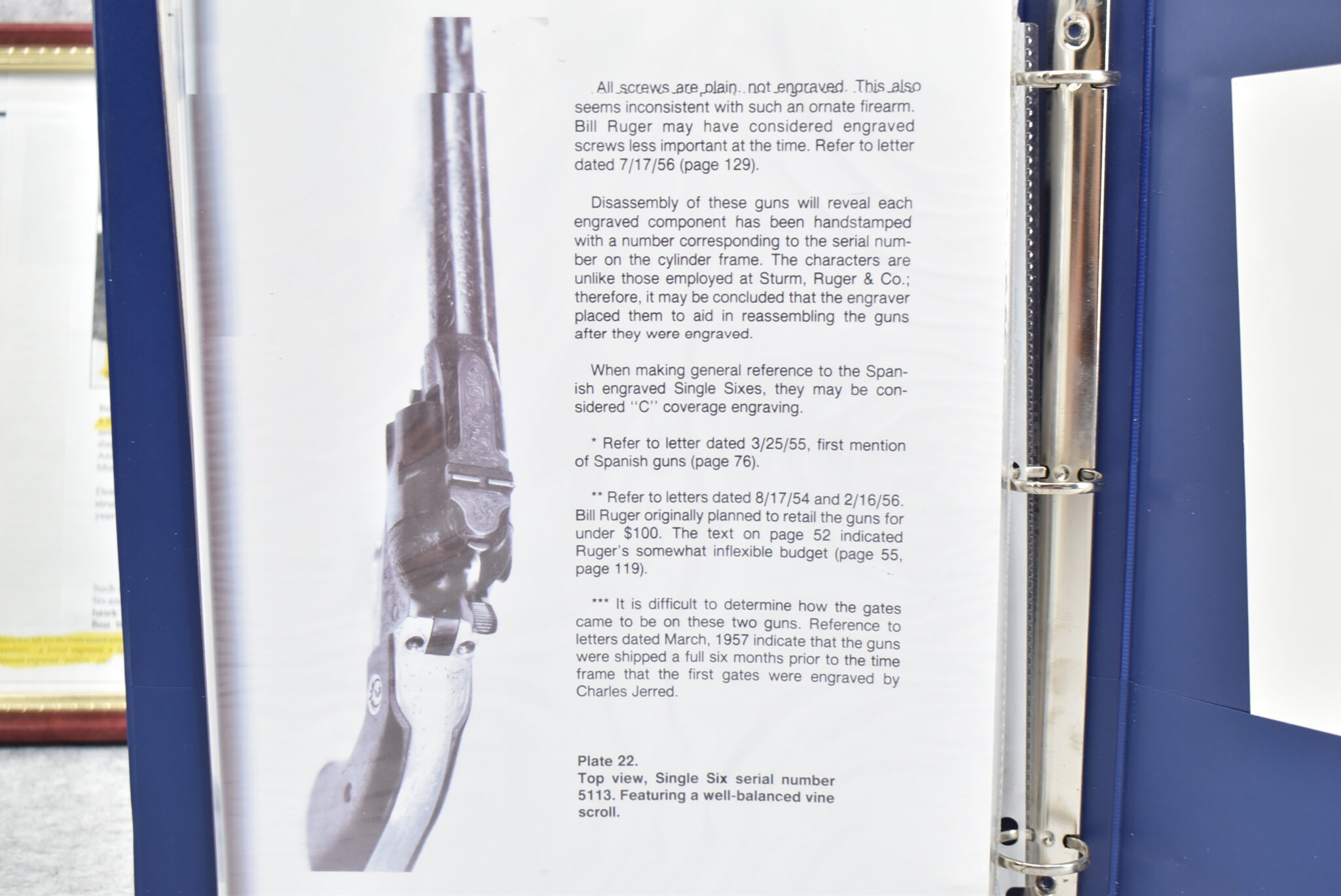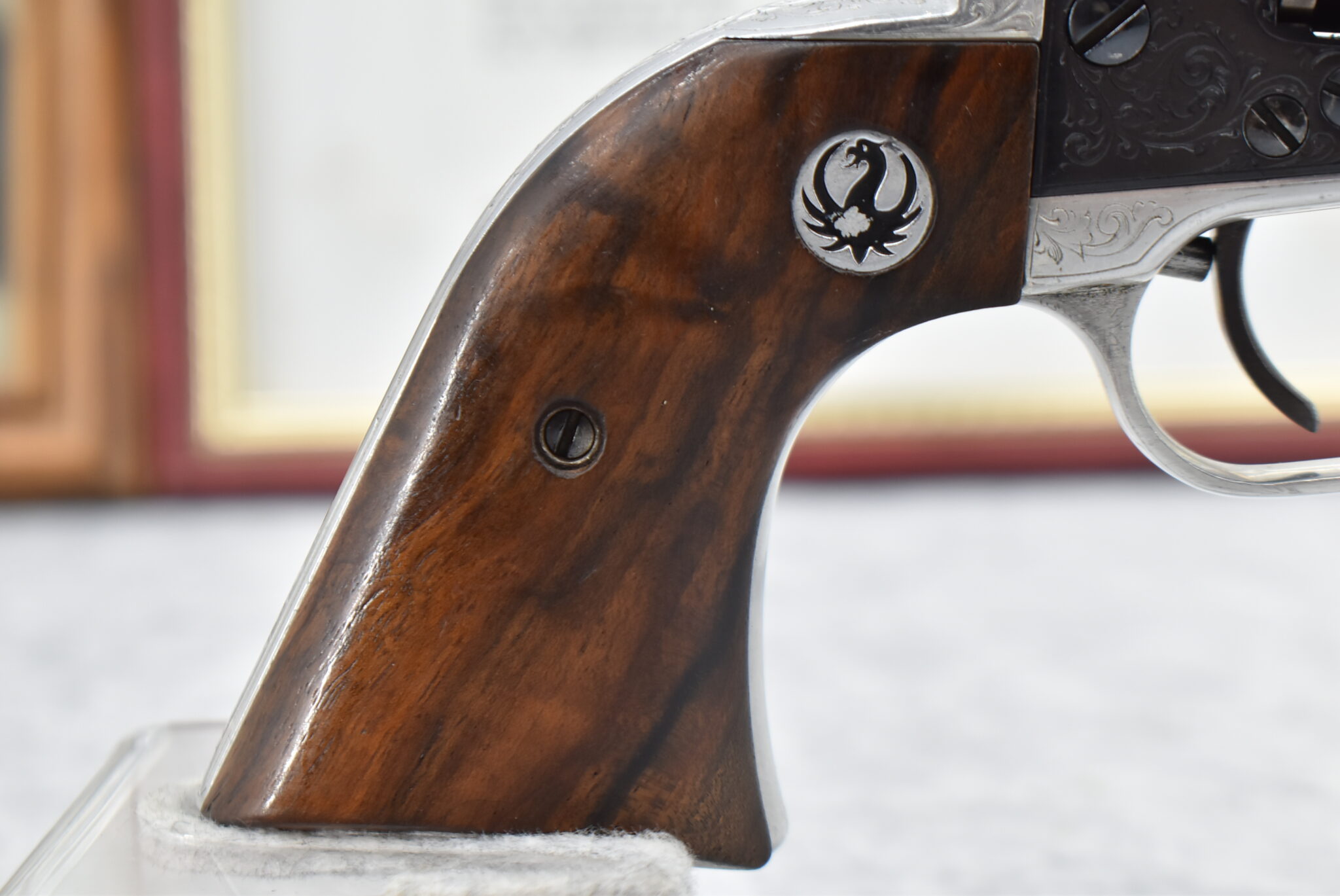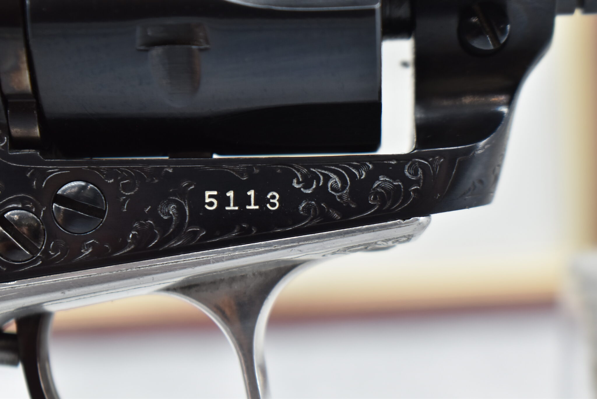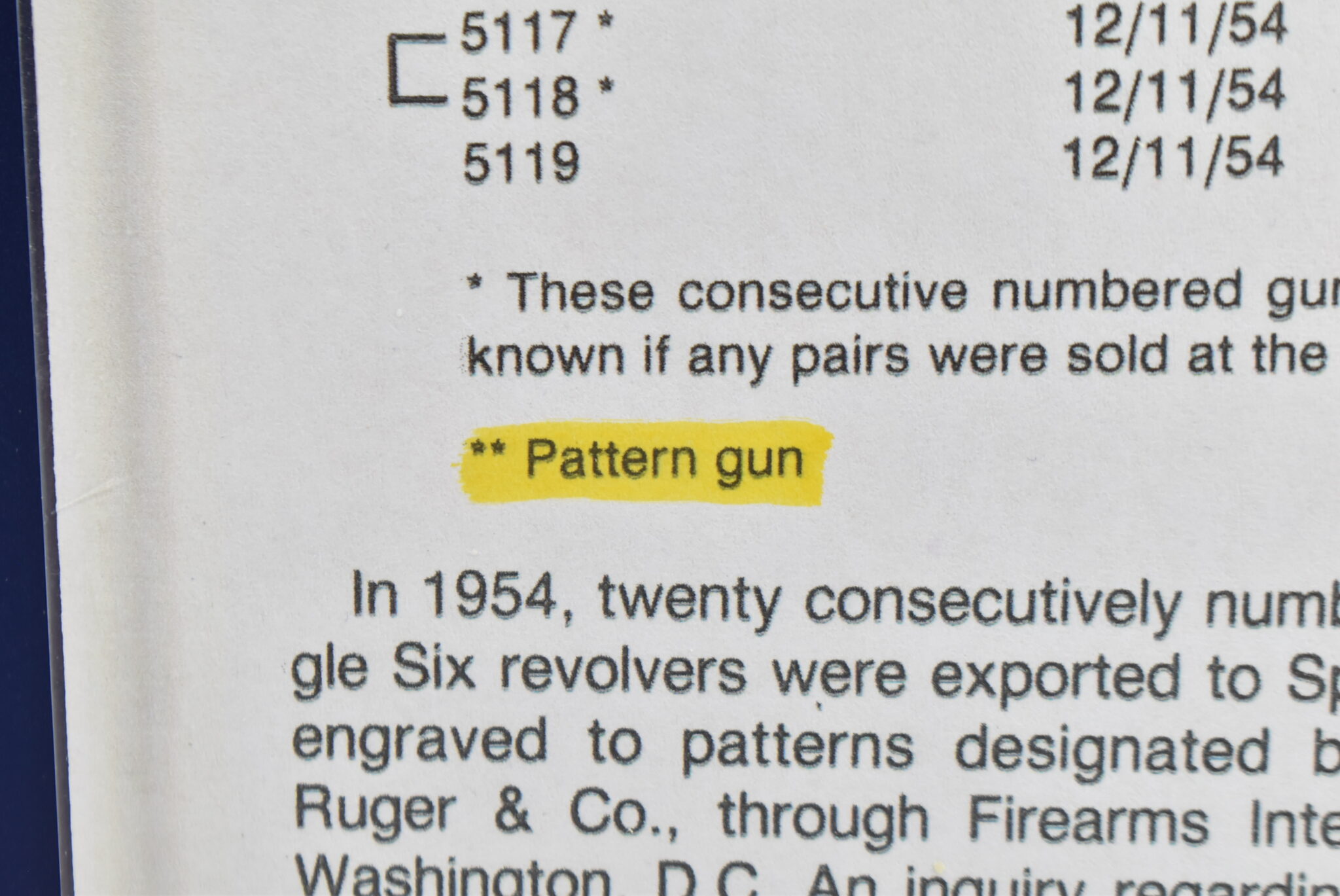 60R. Rare! The Holy Grail for Ruger Collectors, A Factory Cased Ruger Single Six 3-Screw Factory “Spanish” Engraved “Pattern” Single Action Revolver – 22 LR Cal. – w/5 ½” Barrel w/Round Blade Front & Notch Rear Sights – Blued Finish w/Silver Trigger & Grip Strap – In 1954, Ruger Exported 20 Consecutive Single Six Revolvers to Spain to be Engraved to Patterns Determined by Sturm Ruger & Co. of the 20 Shipped, Only Two Were Designated “Pattern Guns” & They Were Serial #5114 & This Gun Serial #5113, Making This One of Only Two Manufactured Engraved “Pattern Guns” of the Total Made Spanish Engraved Revolvers – These Two “Pattern” Revolvers Lead to the Beginning of the Ruger Factory Engraved Single Sixes – Accompanying This Rare Gun is a Sturm Ruger & Co. Receipt Dated 2-15-56 Showing One Ruger Single Six Revolver Serial #5113 (This Gun) Shipped to Charles Jerred for an Engraving Sample for Him to Use as a Pattern for His 238 Guns He Personally Engraved for Sturm Ruger & Co. – Also Including A Copy of a Letter Dated Feb. 23, 1956 to Charles Jerred From William Ruger Stating “I am ready to go along with your proposal to do the sides of the frame somewhat like the pattern Gun #5113 and add $500 to our cost” & Altos Stating This Gun (5113) Was Part of a Special Exhibit by Ruger for the NRA Exhibit in 1956, As Well As a Copy of an Original Advertisement for These Factory Engraved Ruger Single Sixes & A Copy of an Article From the 1989 N.R.A. Annual Meeting & Exhibits Showing This Gun Was Displayed as Part of an R.C.A. Award Winning Display – In Conclusion, We Don’t Know How You Can Get a More Rare Ruger Single Six Factory Engraved Gun Than This One! With the History This Gun Carries With it. In a way, This Gun Was the Forerunner of All Engraved Ruger Firearms