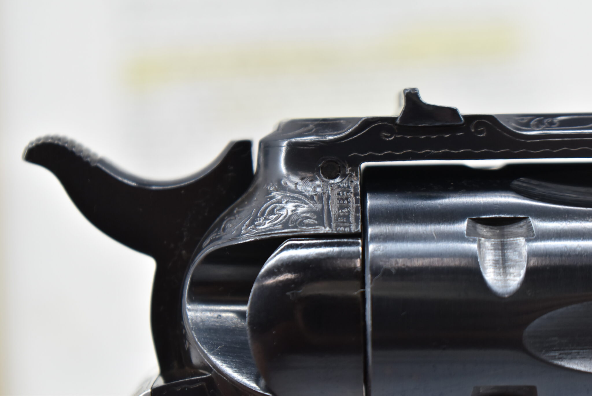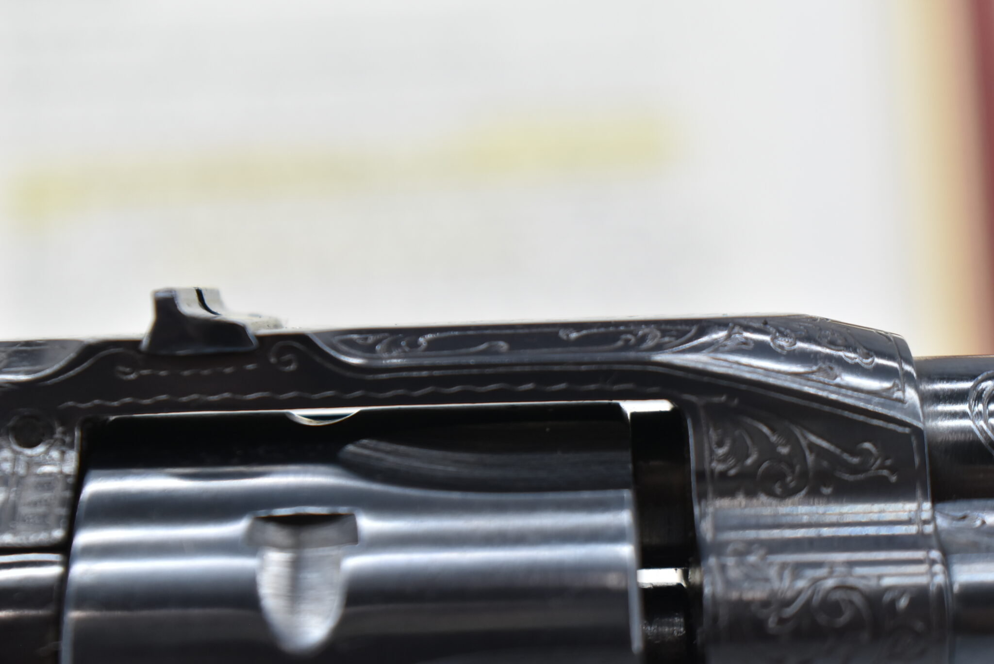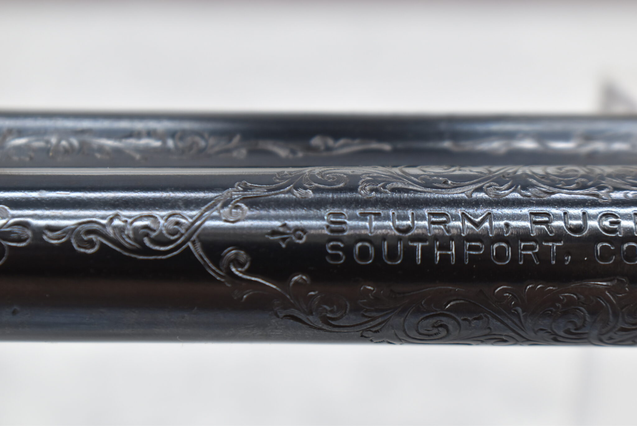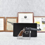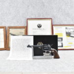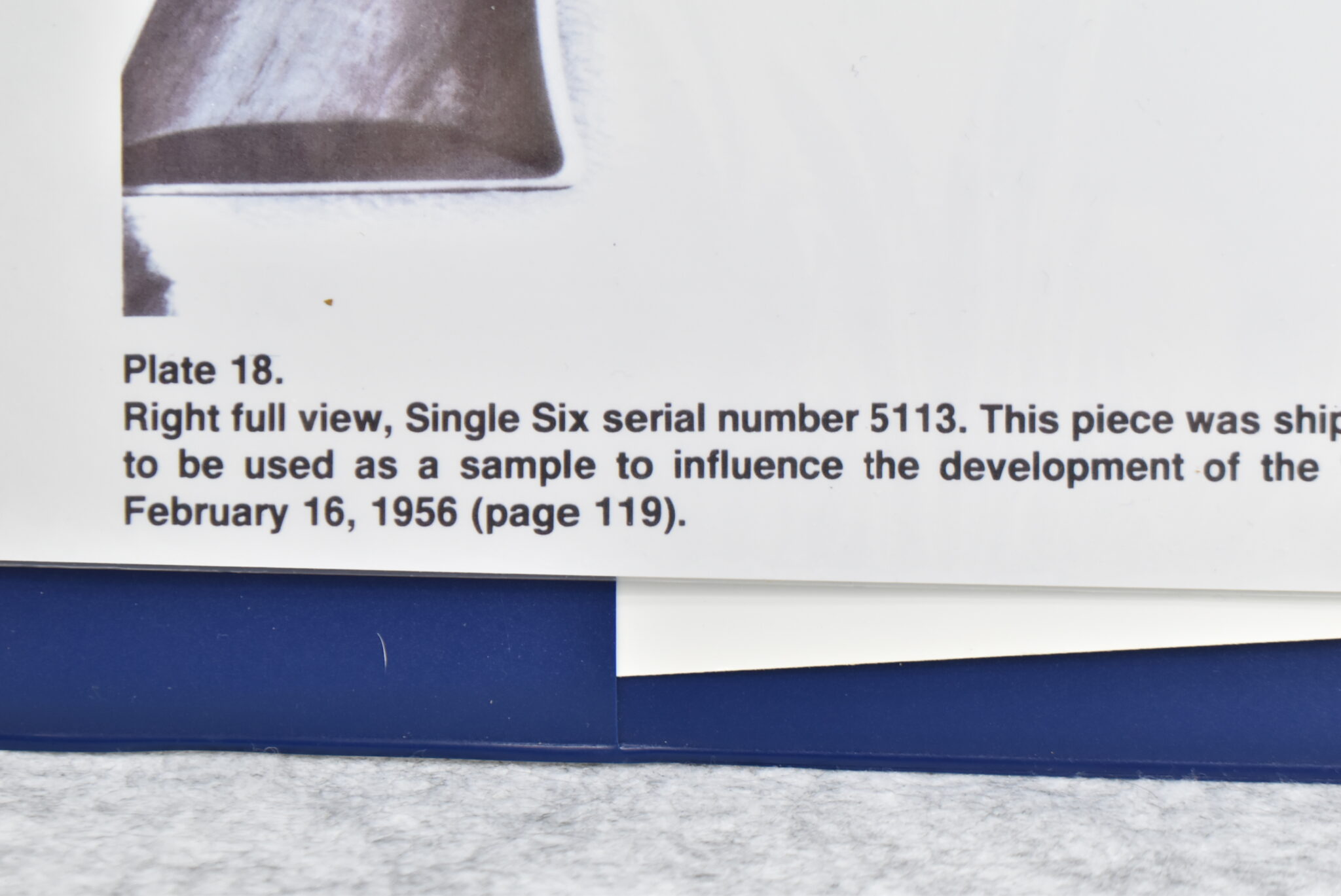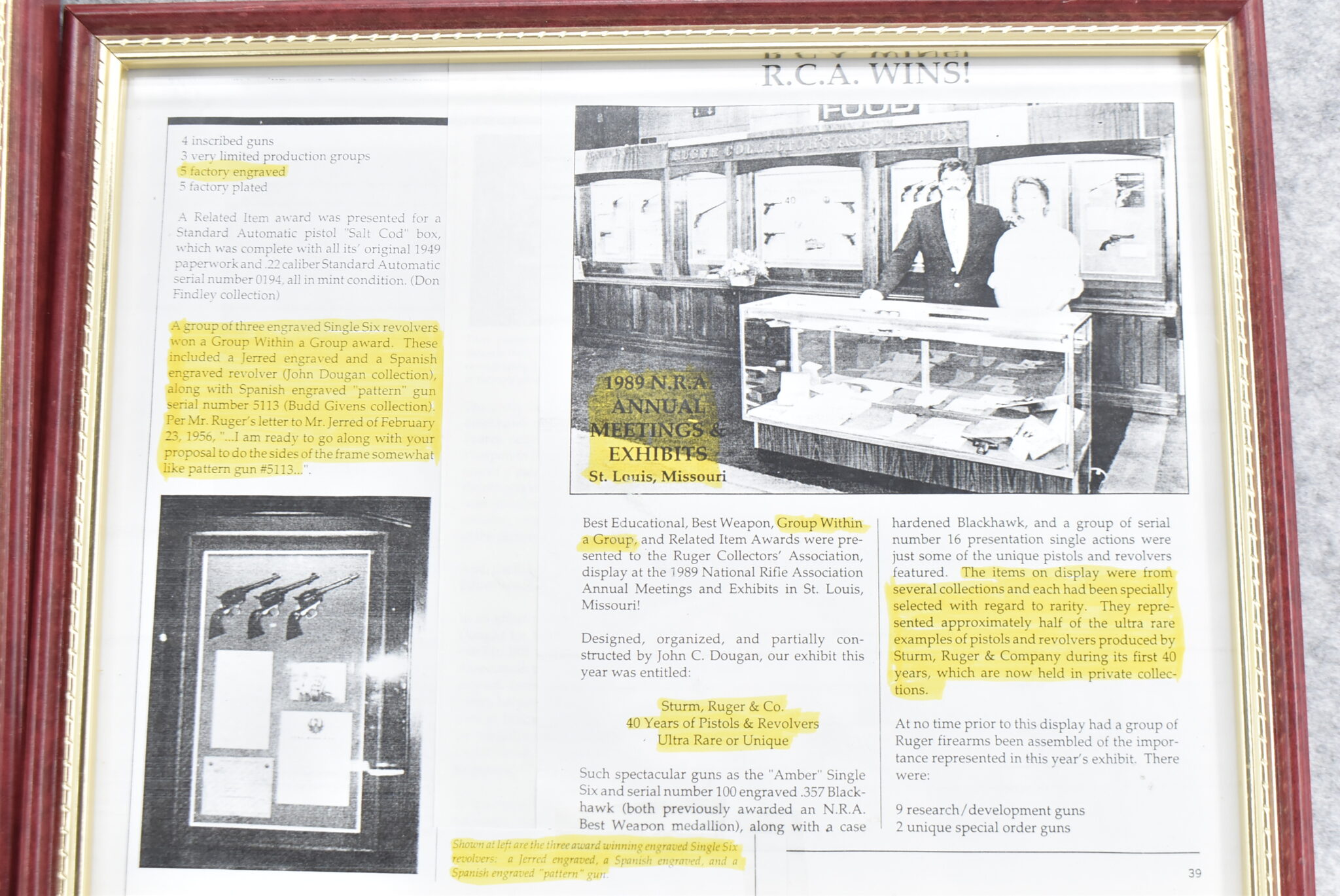 60R. Rare! The Holy Grail for Ruger Collectors, A Factory Cased Ruger Single Six 3-Screw Factory “Spanish” Engraved “Pattern” Single Action Revolver – 22 LR Cal. – w/5 ½” Barrel w/Round Blade Front & Notch Rear Sights – Blued Finish w/Silver Trigger & Grip Strap – In 1954, Ruger Exported 20 Consecutive Single Six Revolvers to Spain to be Engraved to Patterns Determined by Sturm Ruger & Co. of the 20 Shipped, Only Two Were Designated “Pattern Guns” & They Were Serial #5114 & This Gun Serial #5113, Making This One of Only Two Manufactured Engraved “Pattern Guns” of the Total Made Spanish Engraved Revolvers – These Two “Pattern” Revolvers Lead to the Beginning of the Ruger Factory Engraved Single Sixes – Accompanying This Rare Gun is a Sturm Ruger & Co. Receipt Dated 2-15-56 Showing One Ruger Single Six Revolver Serial #5113 (This Gun) Shipped to Charles Jerred for an Engraving Sample for Him to Use as a Pattern for His 238 Guns He Personally Engraved for Sturm Ruger & Co. – Also Including A Copy of a Letter Dated Feb. 23, 1956 to Charles Jerred From William Ruger Stating “I am ready to go along with your proposal to do the sides of the frame somewhat like the pattern Gun #5113 and add $500 to our cost” & Altos Stating This Gun (5113) Was Part of a Special Exhibit by Ruger for the NRA Exhibit in 1956, As Well As a Copy of an Original Advertisement for These Factory Engraved Ruger Single Sixes & A Copy of an Article From the 1989 N.R.A. Annual Meeting & Exhibits Showing This Gun Was Displayed as Part of an R.C.A. Award Winning Display – In Conclusion, We Don’t Know How You Can Get a More Rare Ruger Single Six Factory Engraved Gun Than This One! With the History This Gun Carries With it. In a way, This Gun Was the Forerunner of All Engraved Ruger Firearms