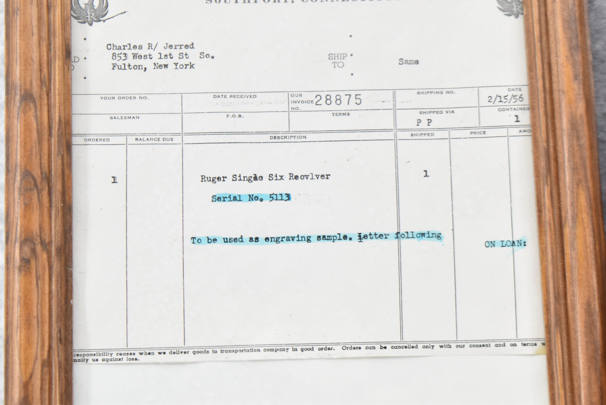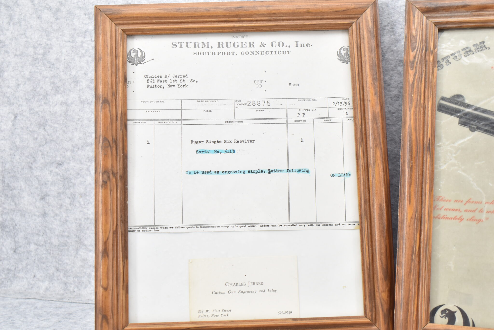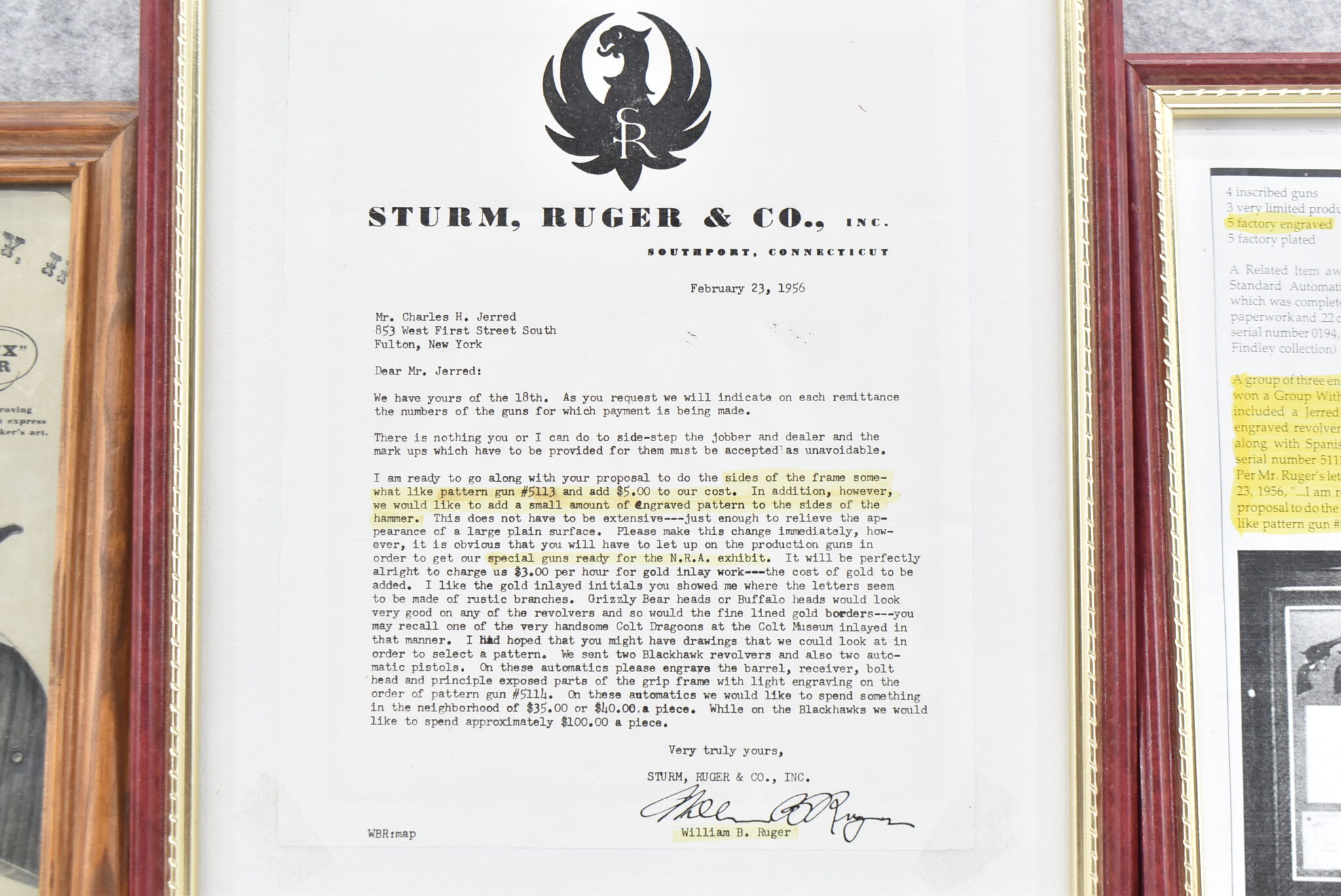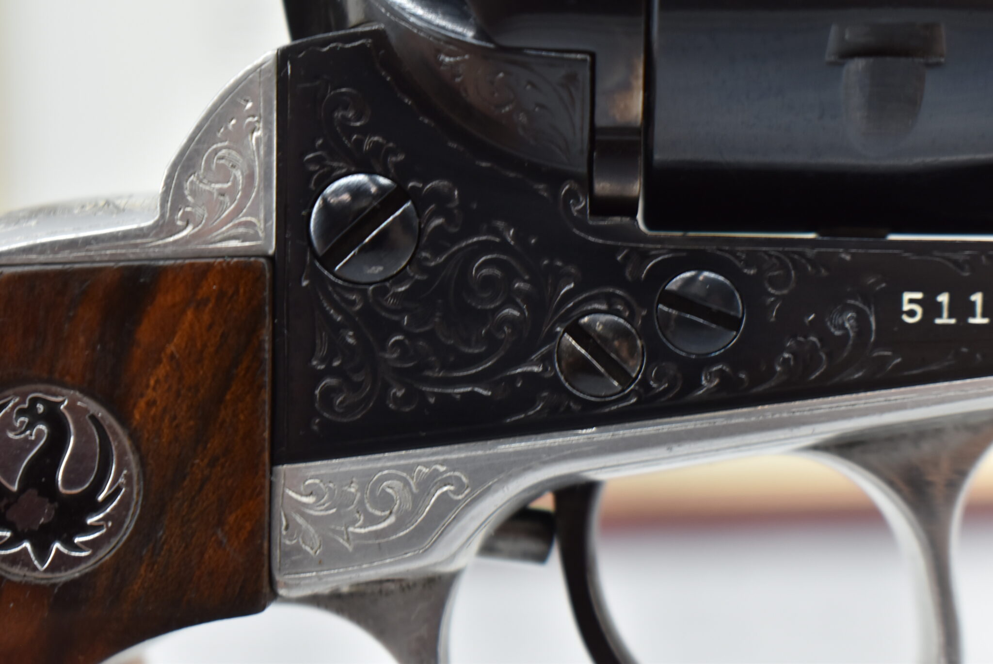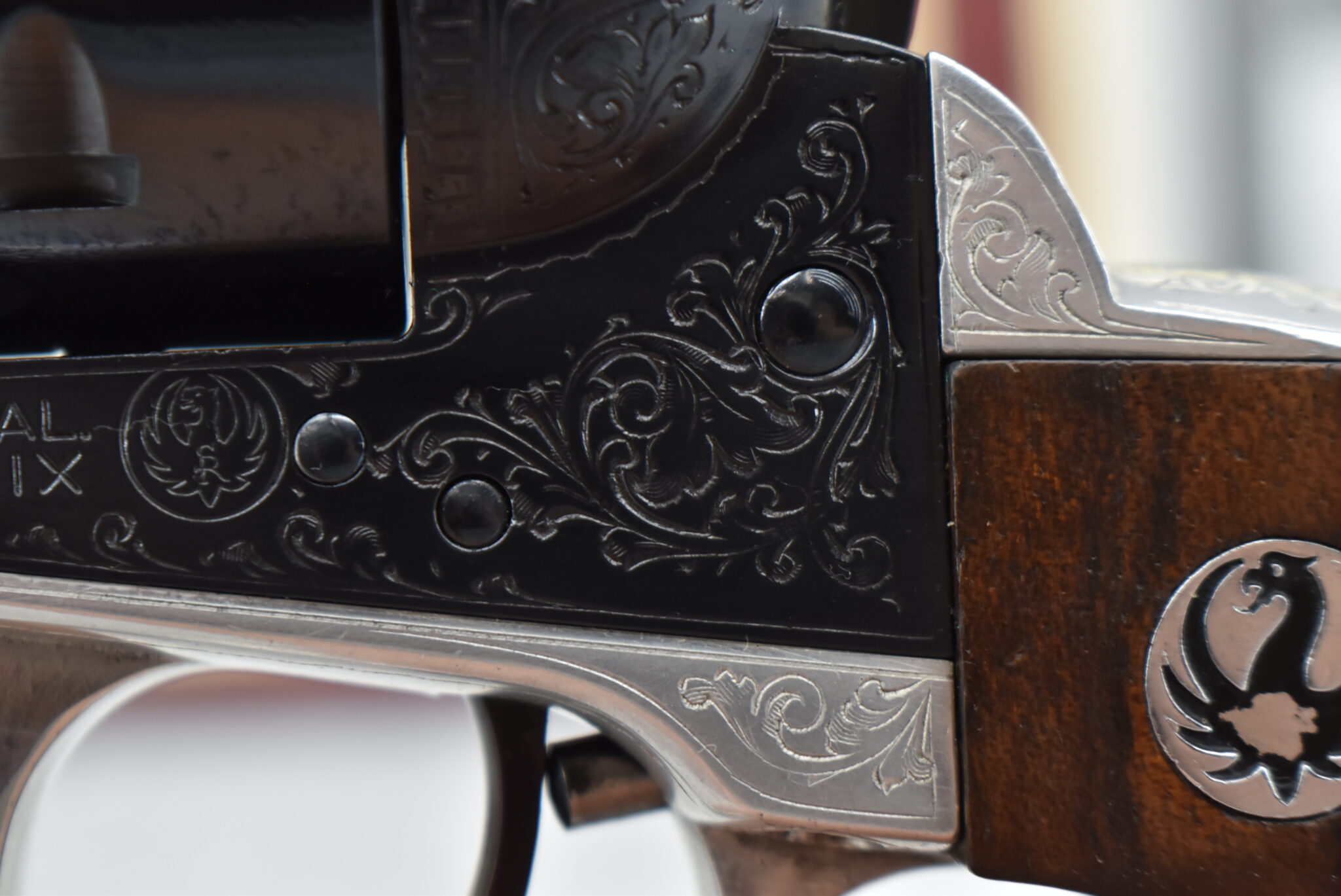 60R. Rare! The Holy Grail for Ruger Collectors, A Factory Cased Ruger Single Six 3-Screw Factory “Spanish” Engraved “Pattern” Single Action Revolver – 22 LR Cal. – w/5 ½” Barrel w/Round Blade Front & Notch Rear Sights – Blued Finish w/Silver Trigger & Grip Strap – In 1954, Ruger Exported 20 Consecutive Single Six Revolvers to Spain to be Engraved to Patterns Determined by Sturm Ruger & Co. of the 20 Shipped, Only Two Were Designated “Pattern Guns” & They Were Serial #5114 & This Gun Serial #5113, Making This One of Only Two Manufactured Engraved “Pattern Guns” of the Total Made Spanish Engraved Revolvers – These Two “Pattern” Revolvers Lead to the Beginning of the Ruger Factory Engraved Single Sixes – Accompanying This Rare Gun is a Sturm Ruger & Co. Receipt Dated 2-15-56 Showing One Ruger Single Six Revolver Serial #5113 (This Gun) Shipped to Charles Jerred for an Engraving Sample for Him to Use as a Pattern for His 238 Guns He Personally Engraved for Sturm Ruger & Co. – Also Including A Copy of a Letter Dated Feb. 23, 1956 to Charles Jerred From William Ruger Stating “I am ready to go along with your proposal to do the sides of the frame somewhat like the pattern Gun #5113 and add $500 to our cost” & Altos Stating This Gun (5113) Was Part of a Special Exhibit by Ruger for the NRA Exhibit in 1956, As Well As a Copy of an Original Advertisement for These Factory Engraved Ruger Single Sixes & A Copy of an Article From the 1989 N.R.A. Annual Meeting & Exhibits Showing This Gun Was Displayed as Part of an R.C.A. Award Winning Display – In Conclusion, We Don’t Know How You Can Get a More Rare Ruger Single Six Factory Engraved Gun Than This One! With the History This Gun Carries With it. In a way, This Gun Was the Forerunner of All Engraved Ruger Firearms