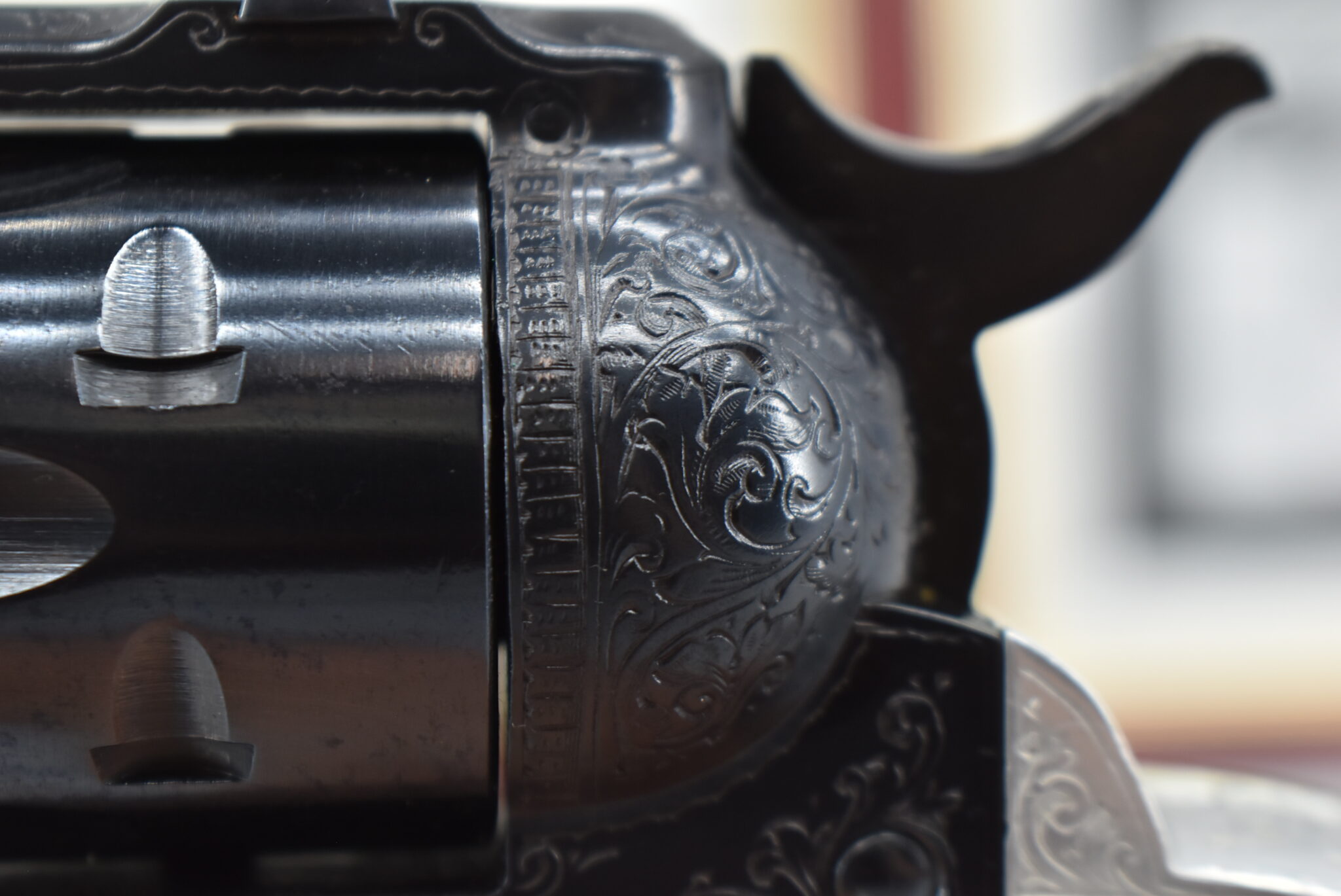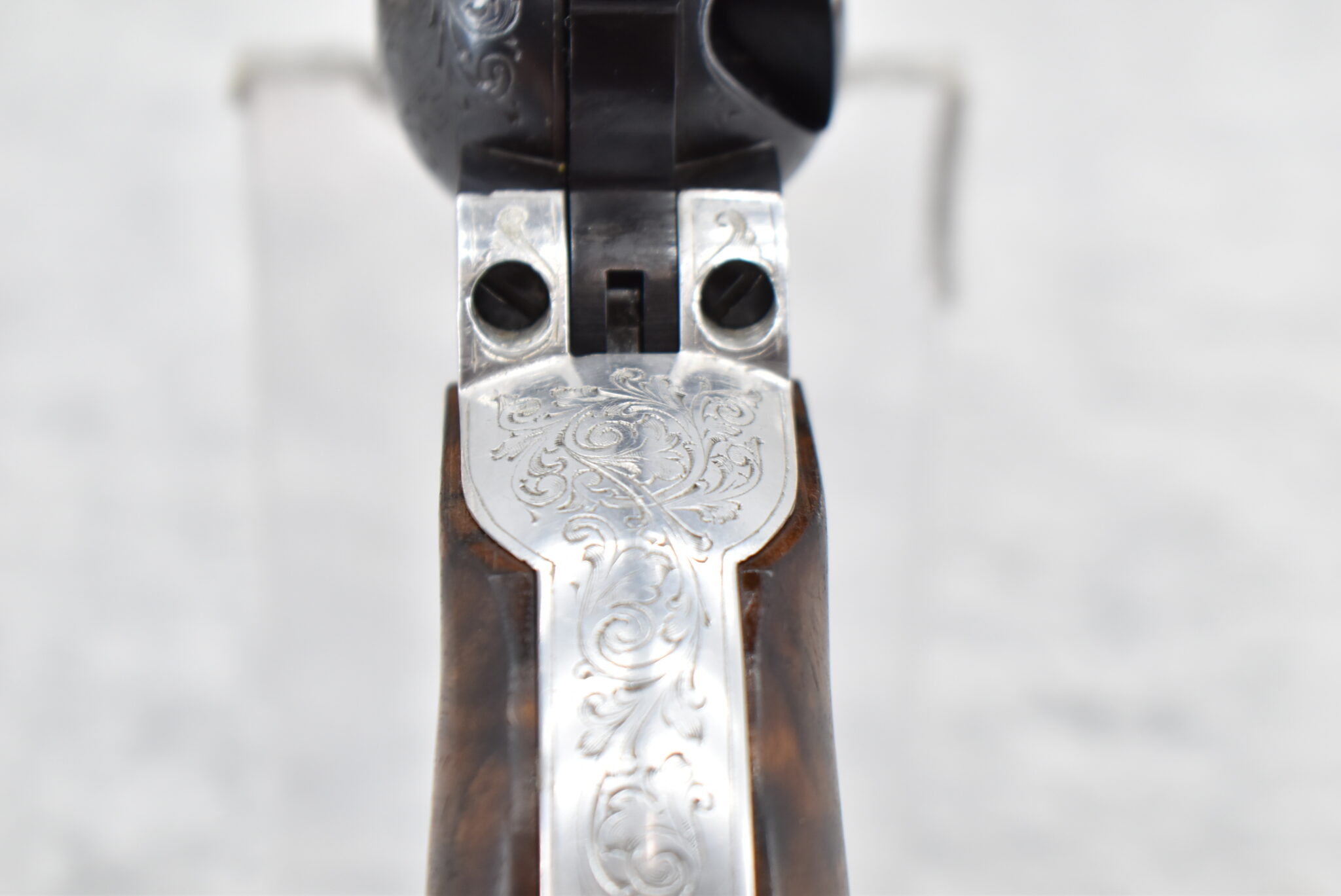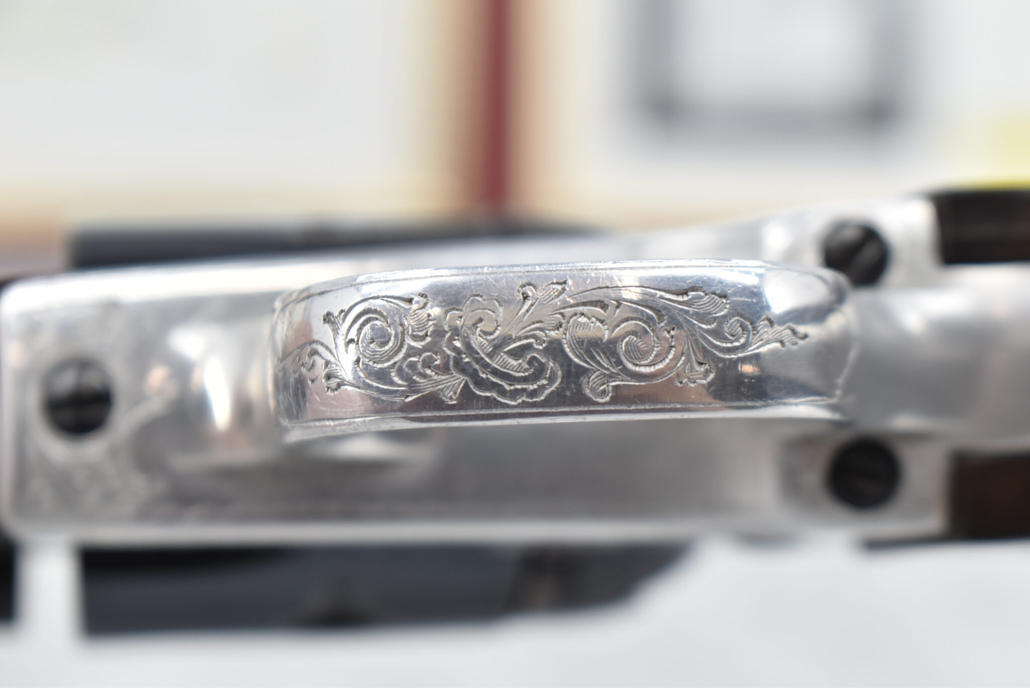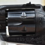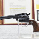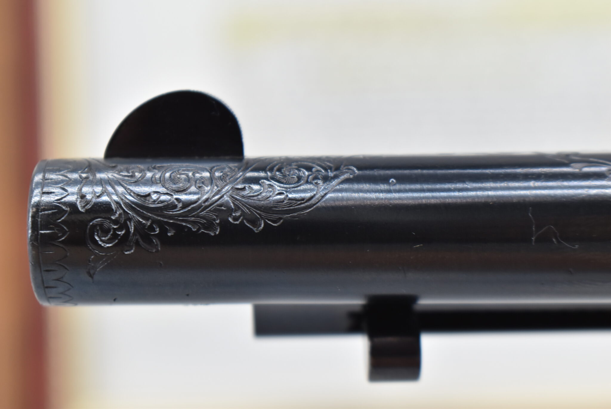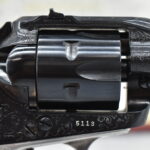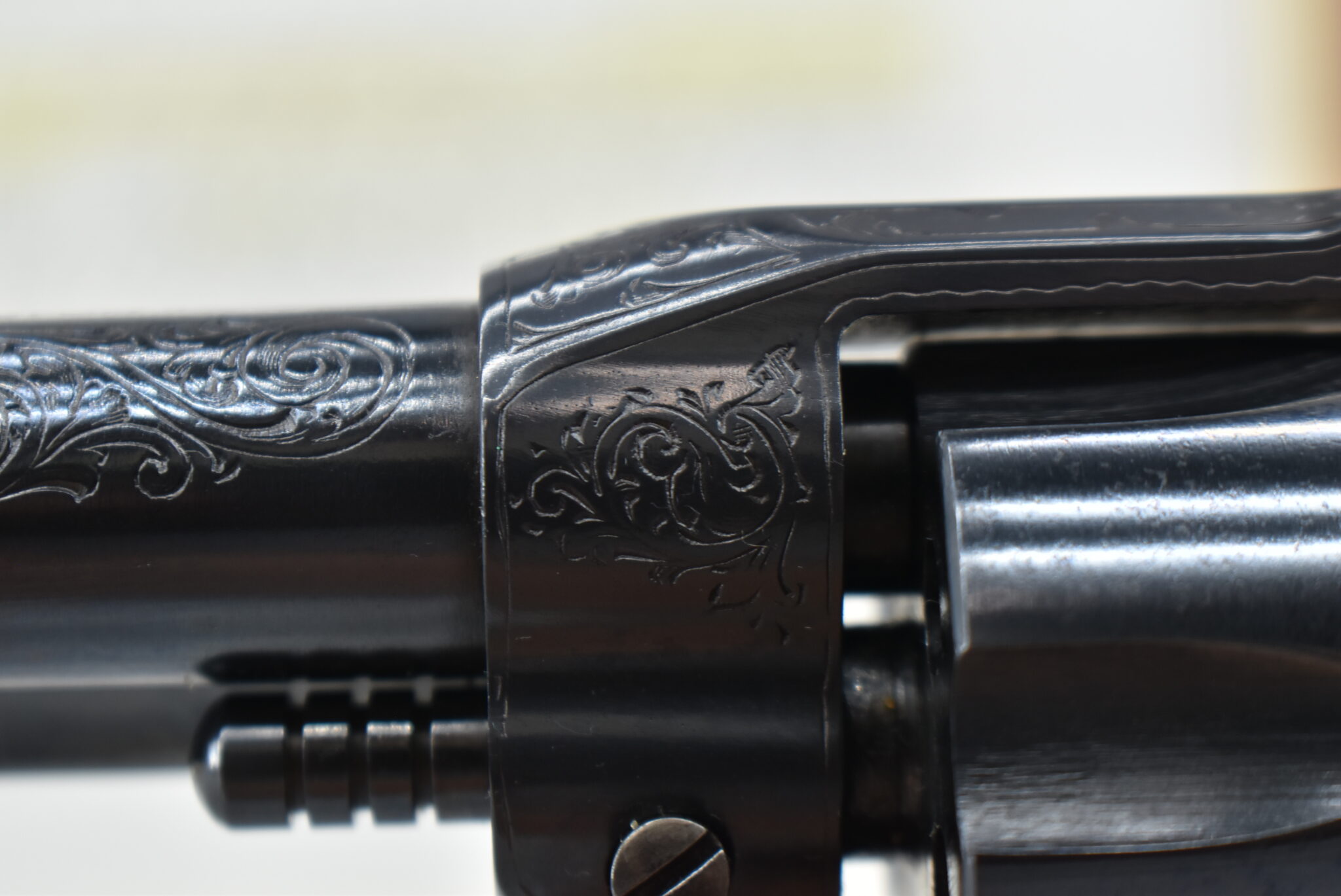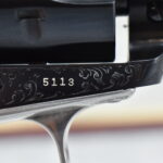 60R. Rare! The Holy Grail for Ruger Collectors, A Factory Cased Ruger Single Six 3-Screw Factory “Spanish” Engraved “Pattern” Single Action Revolver – 22 LR Cal. – w/5 ½” Barrel w/Round Blade Front & Notch Rear Sights – Blued Finish w/Silver Trigger & Grip Strap – In 1954, Ruger Exported 20 Consecutive Single Six Revolvers to Spain to be Engraved to Patterns Determined by Sturm Ruger & Co. of the 20 Shipped, Only Two Were Designated “Pattern Guns” & They Were Serial #5114 & This Gun Serial #5113, Making This One of Only Two Manufactured Engraved “Pattern Guns” of the Total Made Spanish Engraved Revolvers – These Two “Pattern” Revolvers Lead to the Beginning of the Ruger Factory Engraved Single Sixes – Accompanying This Rare Gun is a Sturm Ruger & Co. Receipt Dated 2-15-56 Showing One Ruger Single Six Revolver Serial #5113 (This Gun) Shipped to Charles Jerred for an Engraving Sample for Him to Use as a Pattern for His 238 Guns He Personally Engraved for Sturm Ruger & Co. – Also Including A Copy of a Letter Dated Feb. 23, 1956 to Charles Jerred From William Ruger Stating “I am ready to go along with your proposal to do the sides of the frame somewhat like the pattern Gun #5113 and add $500 to our cost” & Altos Stating This Gun (5113) Was Part of a Special Exhibit by Ruger for the NRA Exhibit in 1956, As Well As a Copy of an Original Advertisement for These Factory Engraved Ruger Single Sixes & A Copy of an Article From the 1989 N.R.A. Annual Meeting & Exhibits Showing This Gun Was Displayed as Part of an R.C.A. Award Winning Display – In Conclusion, We Don’t Know How You Can Get a More Rare Ruger Single Six Factory Engraved Gun Than This One! With the History This Gun Carries With it. In a way, This Gun Was the Forerunner of All Engraved Ruger Firearms
