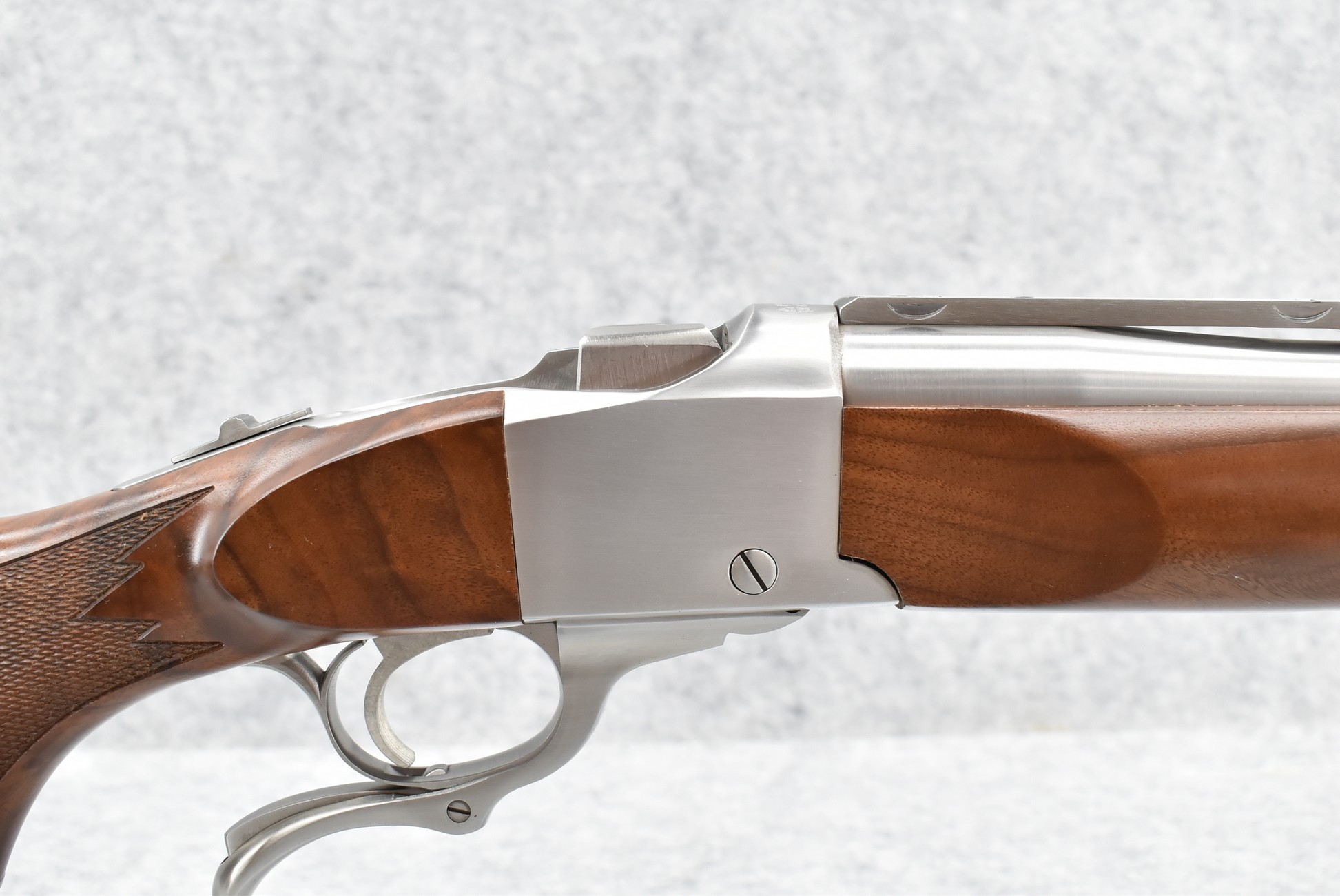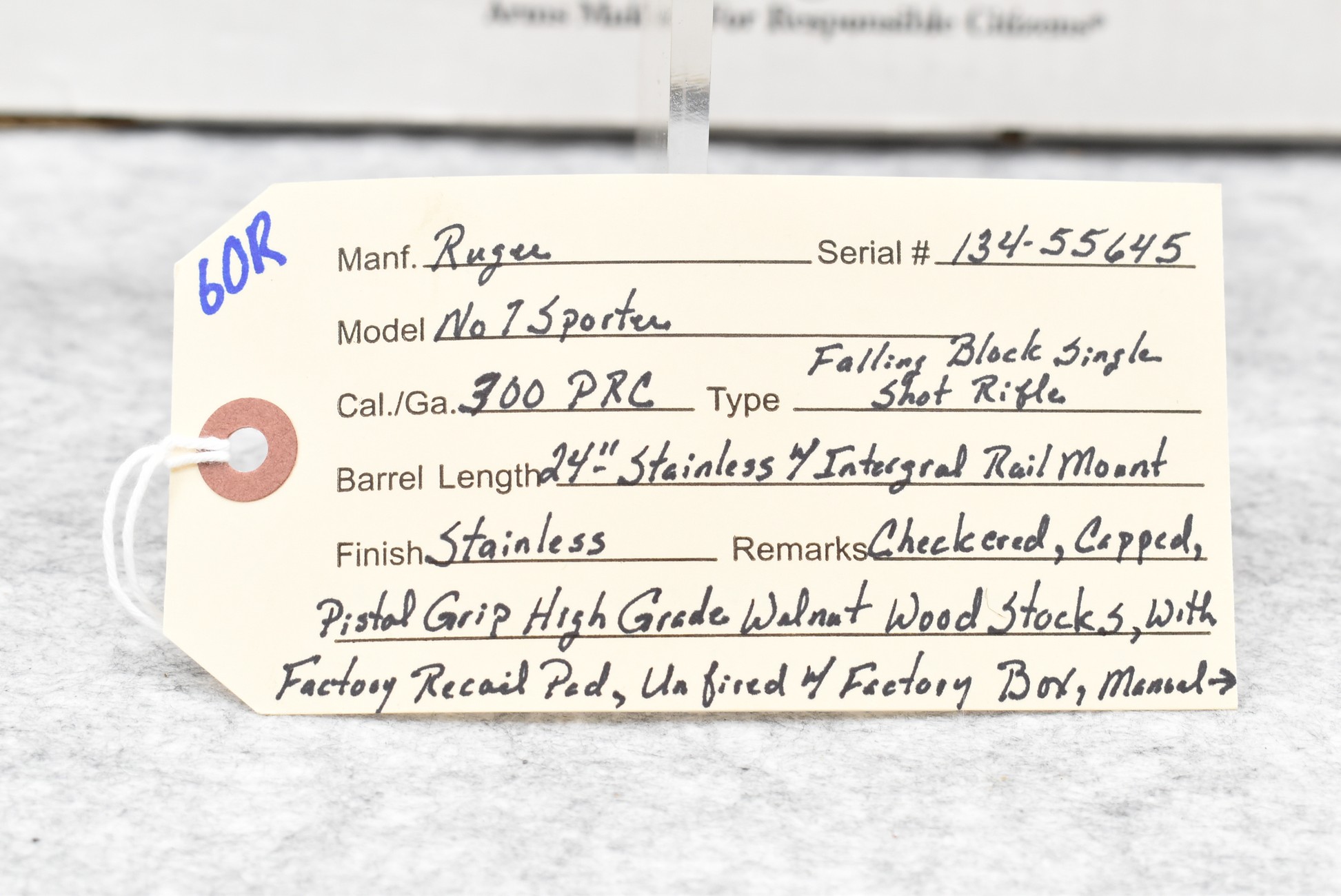 60R. Ruger – Mod. No. 1 Sporter – 300 PRC Cal. Single Shot Falling Block Rifle – w/24” Stainless Barrel w/Integral Rail Mount – Stainless Finish – w/Checkered Capped Pistol Grip Highly Figured Walnut Wood Stocks w/Factory Recoil Pad – Unfired w/Factory Box, Manual, and Factory Set of Stainless Rings – A Lipsey’s Distributer Exclusive, Manufactured in Limited Quantities!