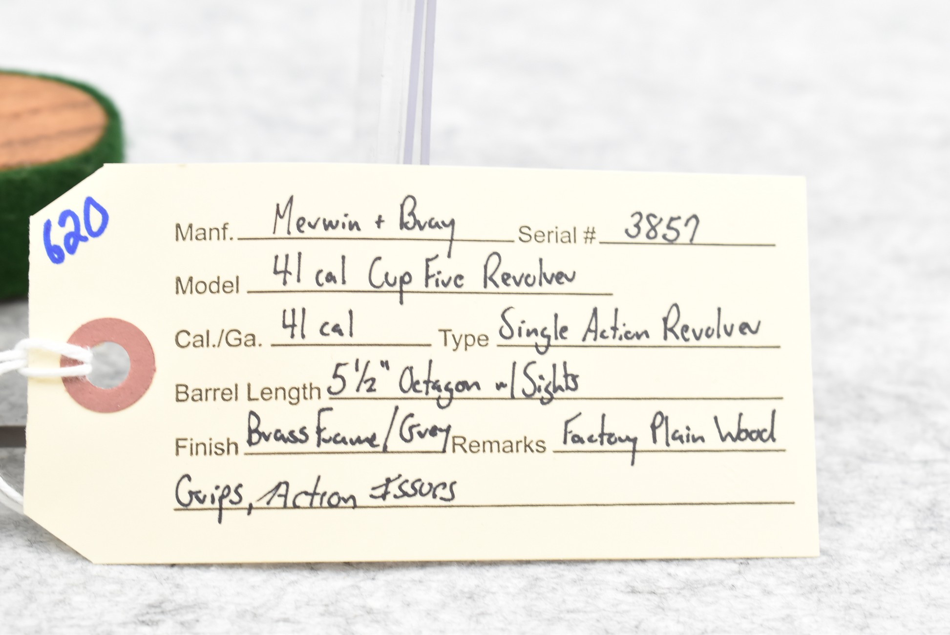 620. Merwin & Bray – 41 Cal. Cup Fire Revolver – 41 Cal. Single Action Revolver – w/5½” Octagon Barrel w/Sights – Grey Finish w/Brass Frame – w/Factory Plain Wood Grips – Action Issues