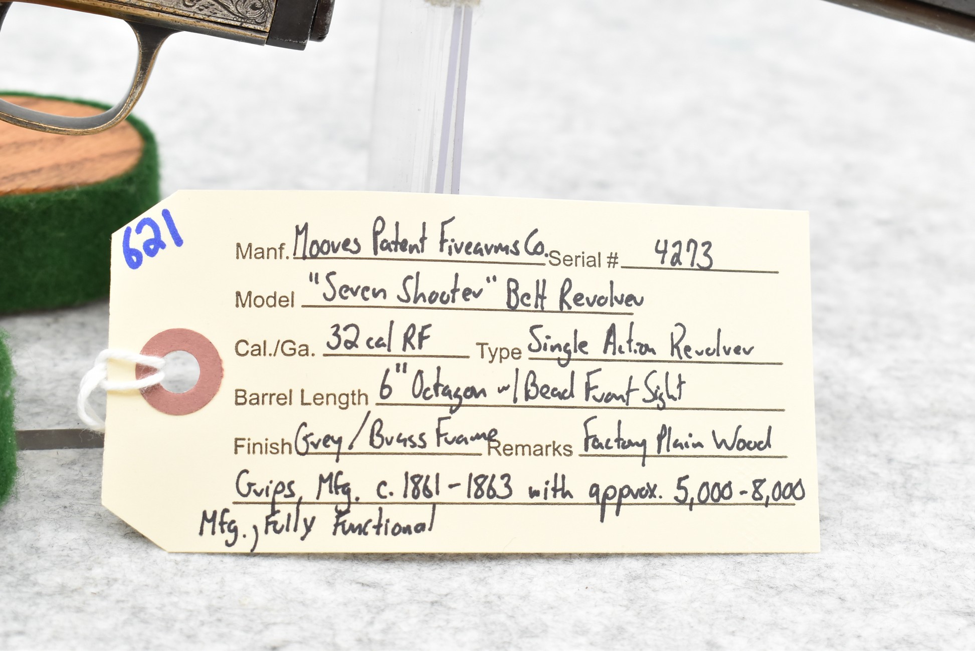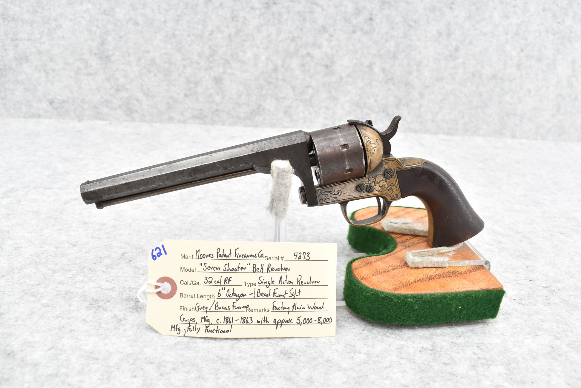 621. Moores Patent Firearms Co. – Mod. “Seven Shooter” Belt Revolver – 32 Rim Fire Cal. Single Action Revolver – w/6” Octagon Barrel w/Bead Front Sight – Grey Finish w/Brass Frame – w/Factory Plain Wood Grips – Manufactured Circa 1861-1863 with Approximately 5,000-8,000 Manufactured – Fully Functional