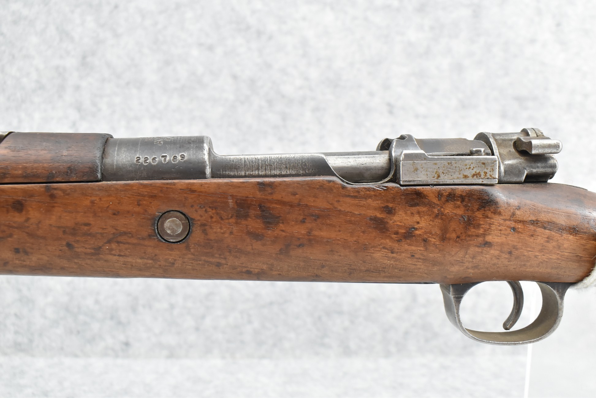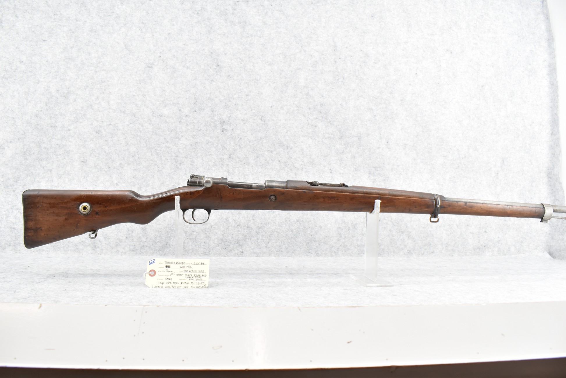 62R. Turkish Mauser – Mod. 1938 – 8mm Cal. Bolt Action Rifle – w/29” Barrel w/Blade Front and Adjustable Rear Ladder Sights – Grey Finish – w/Full Pistol Grip Wood Stock w/Metal Butt Plate – w/Cleaning Rod – w/Bayonet Lug – All Numbers are Matching – Import Marked – Dated 1946