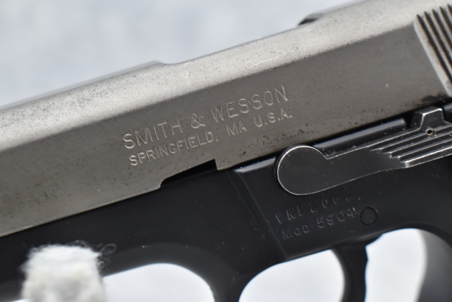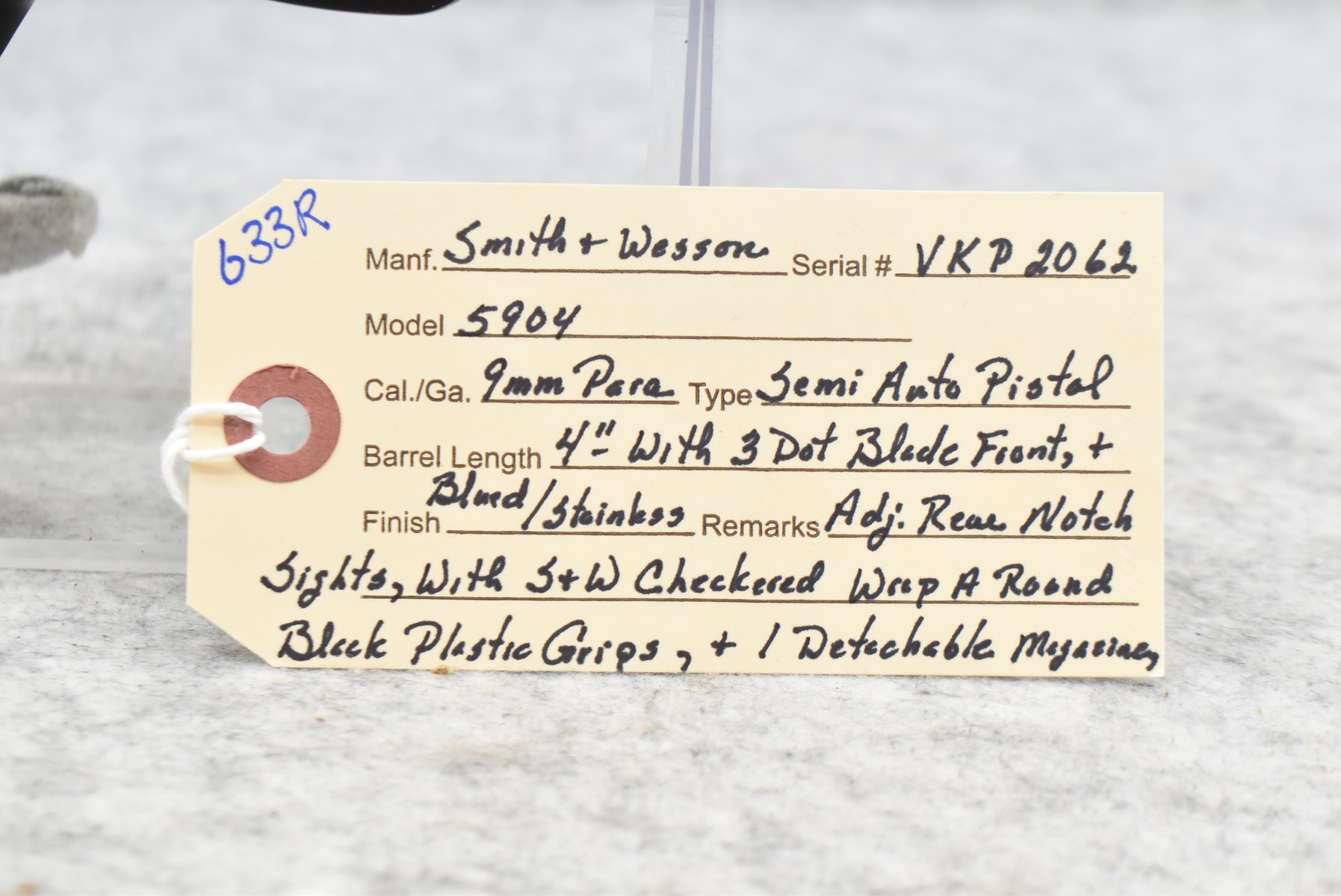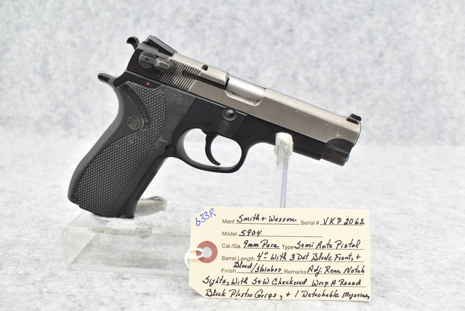 633R. Smith & Wesson – Mod. 5904 – 9mm Para Cal. Semi-Auto Pistol – w/4” Barrel w/3-Dot Blade Front & Adj. Rear Notch Sights – Blued/Stainless Finish – w/S&W Checkered Wraparound Black Plastic Grips – w/Detachable Magazine