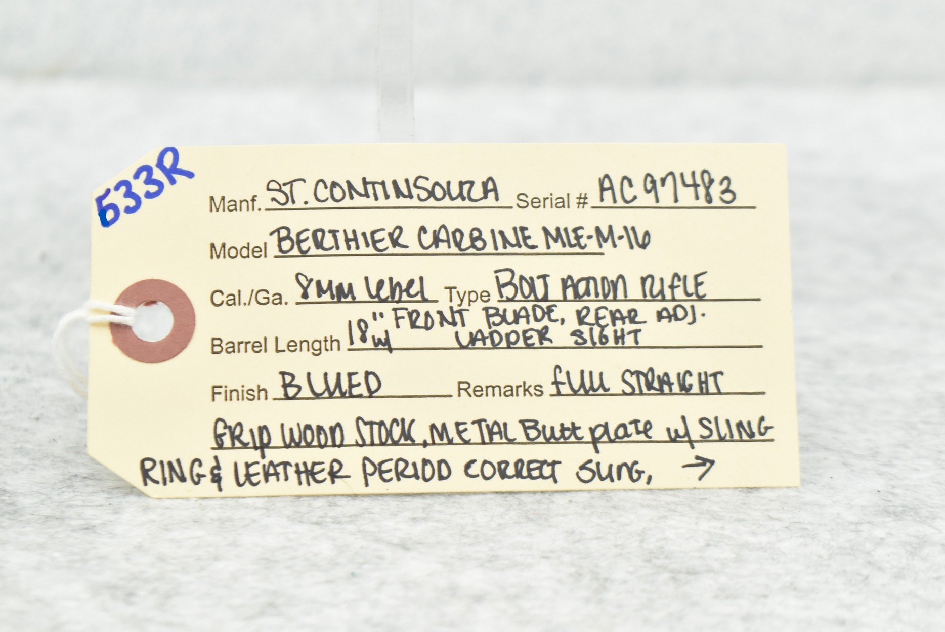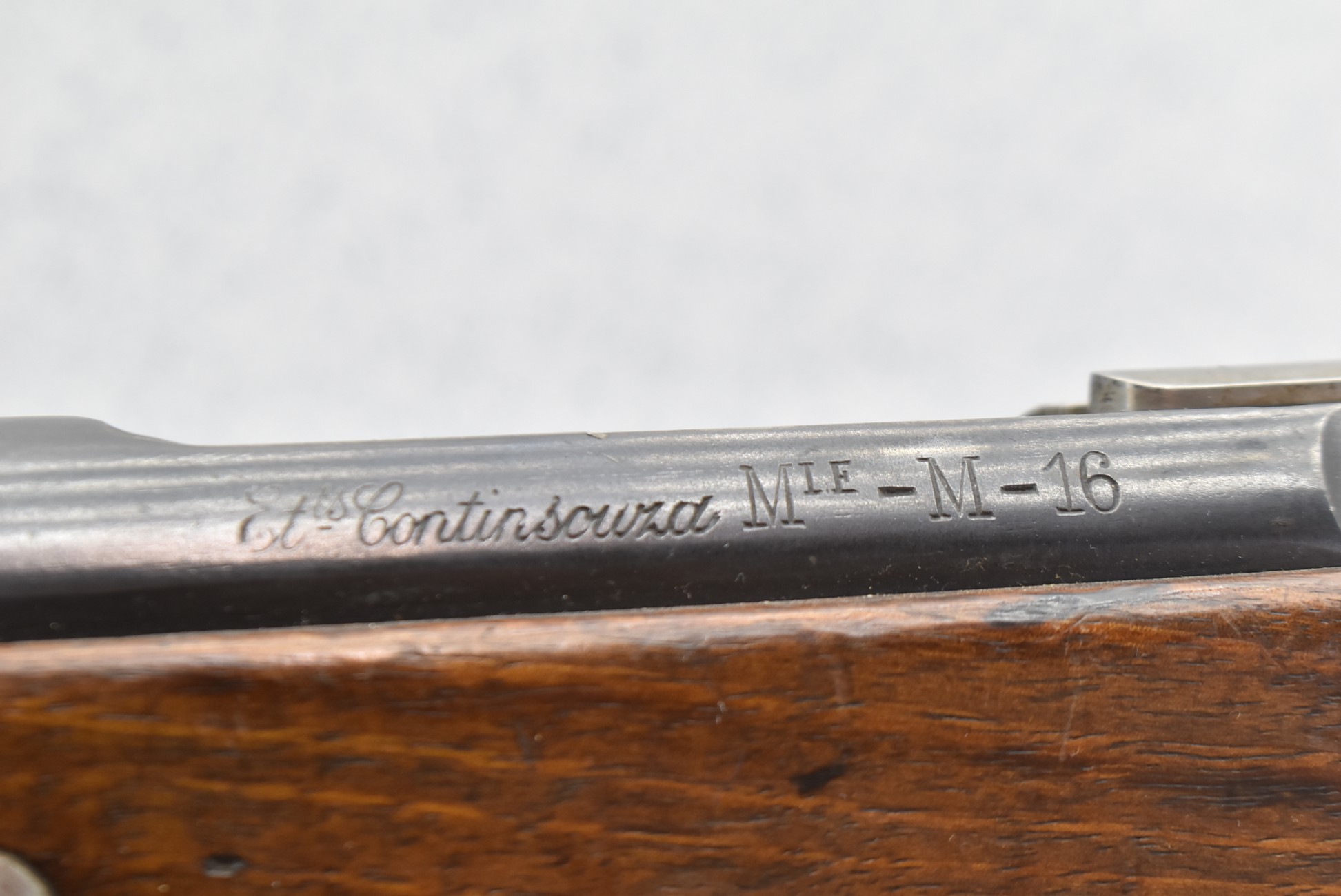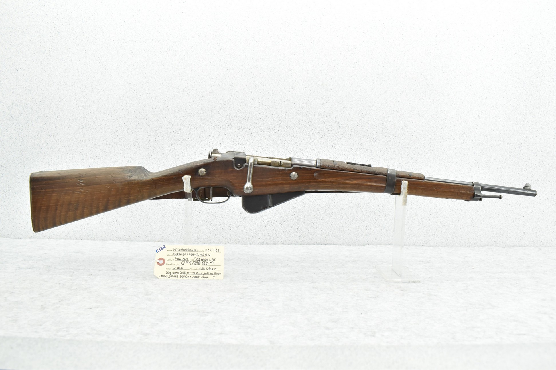 633R. St. Continsouza (French) – Berthier Carbine Mle M16 – 8mm Lebel Cal. Bolt Action Rifle – w/18” Barrel w/Front Blade & Rear Adj. Ladder Sight – Blued Finish – w/Full Straight Grip Wood Stock w/Metal Butt Plate – w/Sling Ring – w/Leather Period Correct Sling – Rifle is Numbers Matching