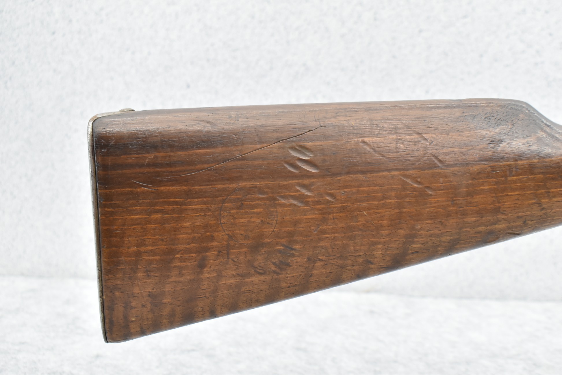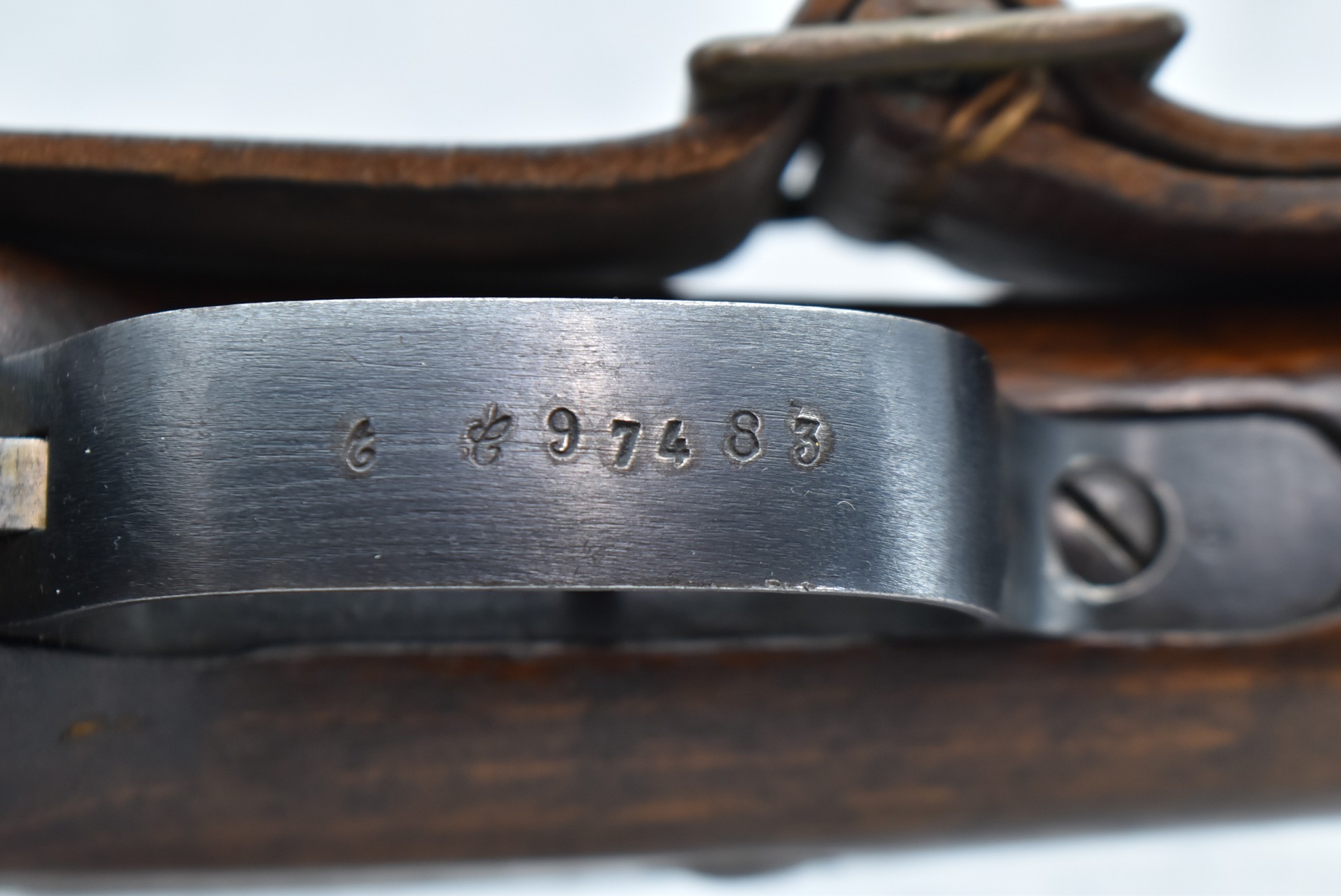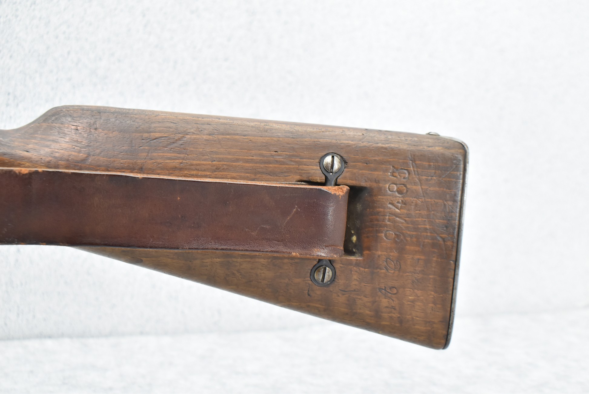 633R. St. Continsouza (French) – Berthier Carbine Mle M16 – 8mm Lebel Cal. Bolt Action Rifle – w/18” Barrel w/Front Blade & Rear Adj. Ladder Sight – Blued Finish – w/Full Straight Grip Wood Stock w/Metal Butt Plate – w/Sling Ring – w/Leather Period Correct Sling – Rifle is Numbers Matching