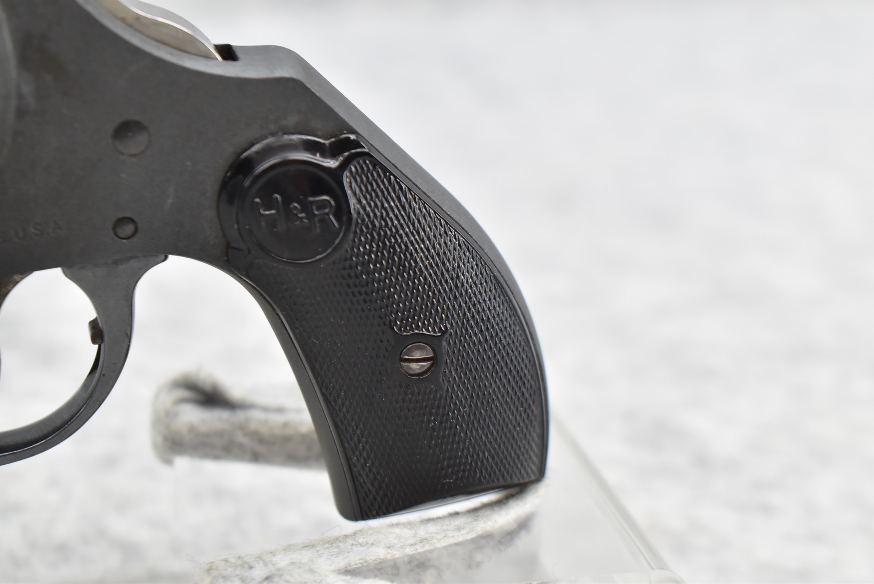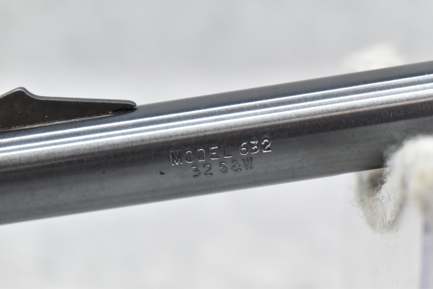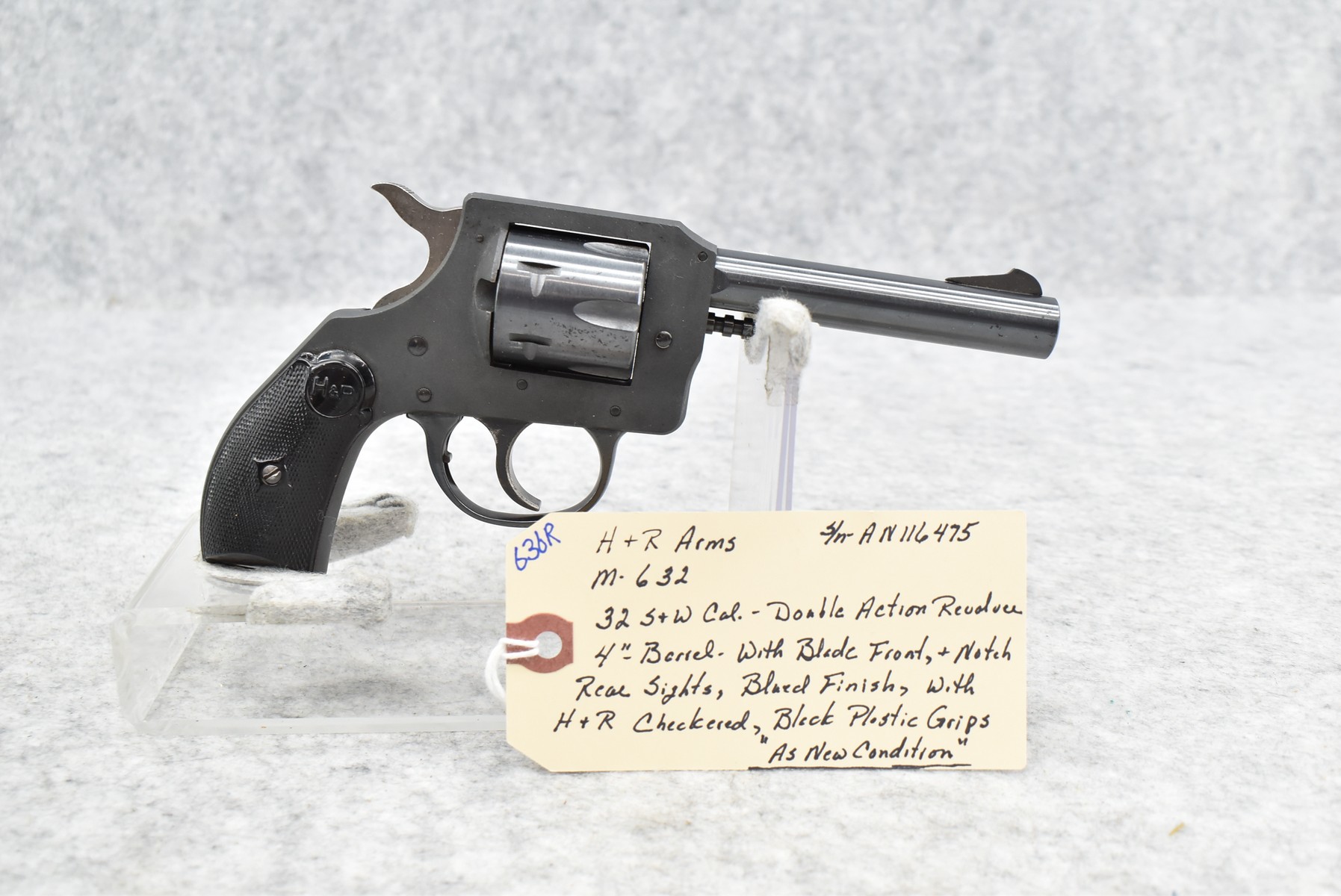 636R. H. & R. Arms – Mod. 632 – 32 S&W Cal. Double Action Revolver – w/4” Barrel w/Blade Front & Notch Rear Sights – Blued Finish – w/H&R Checkered Black Plastic Grips – As New