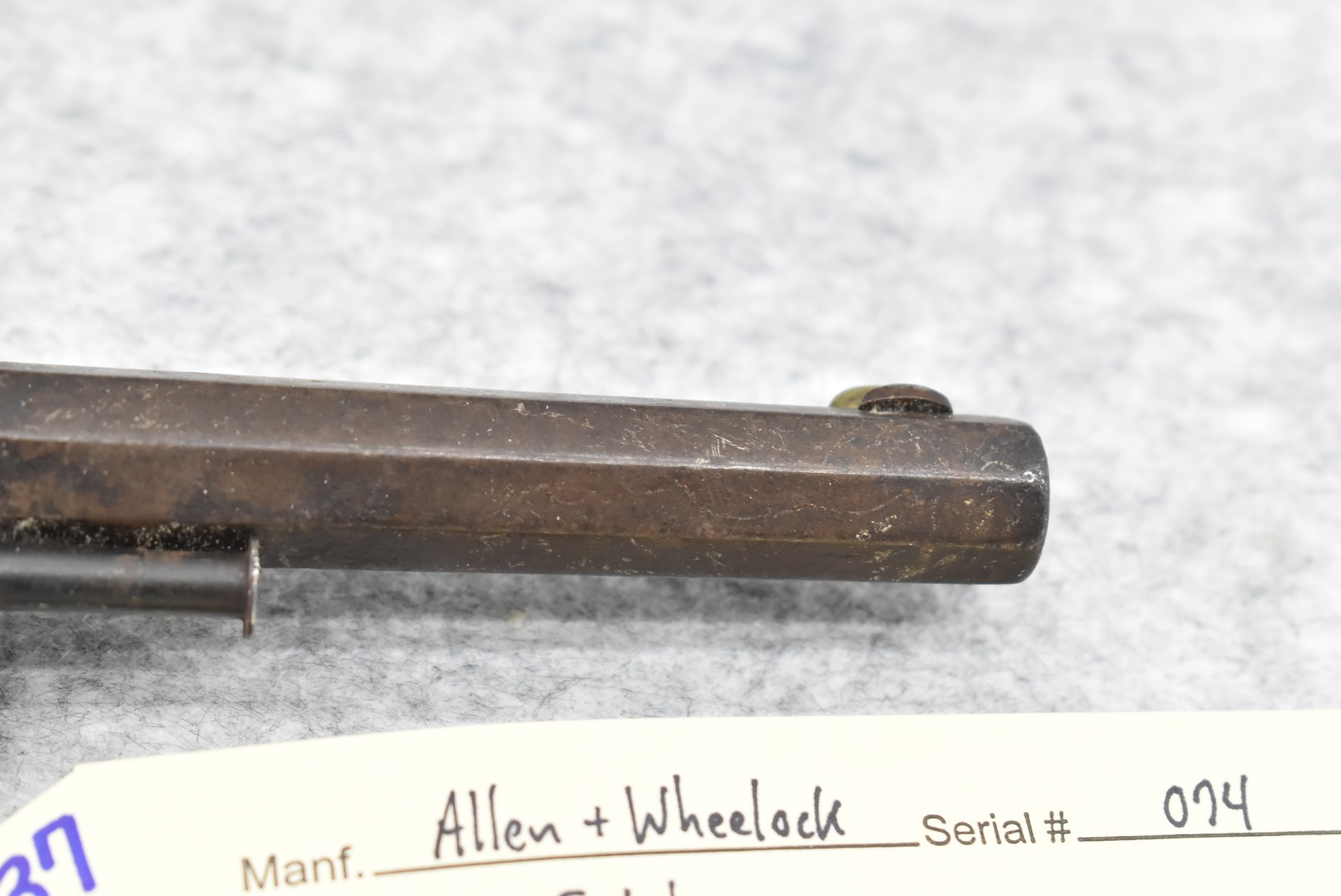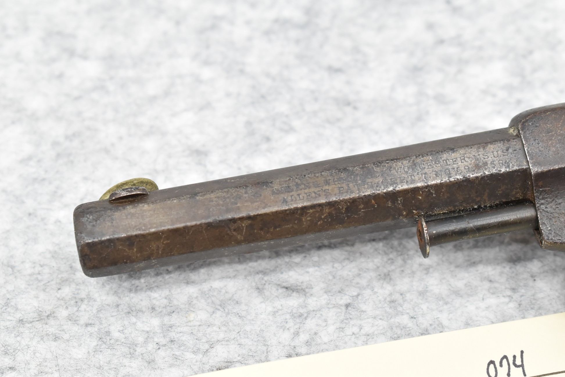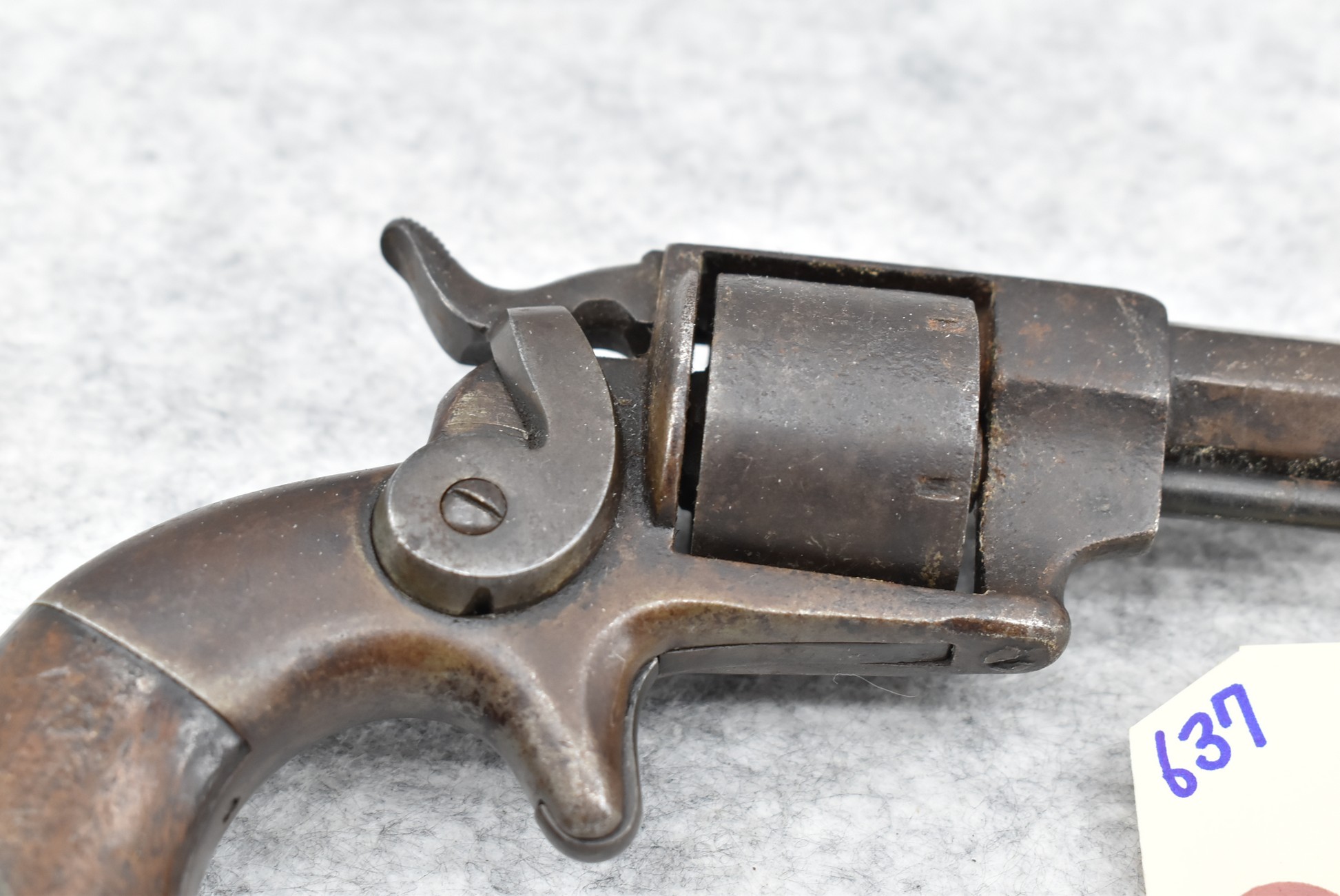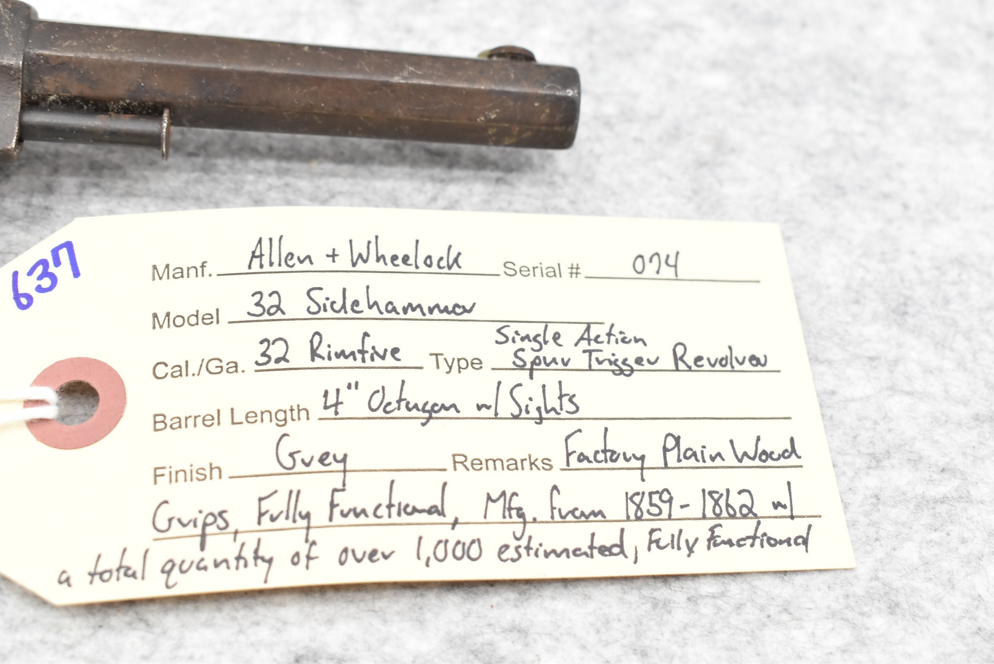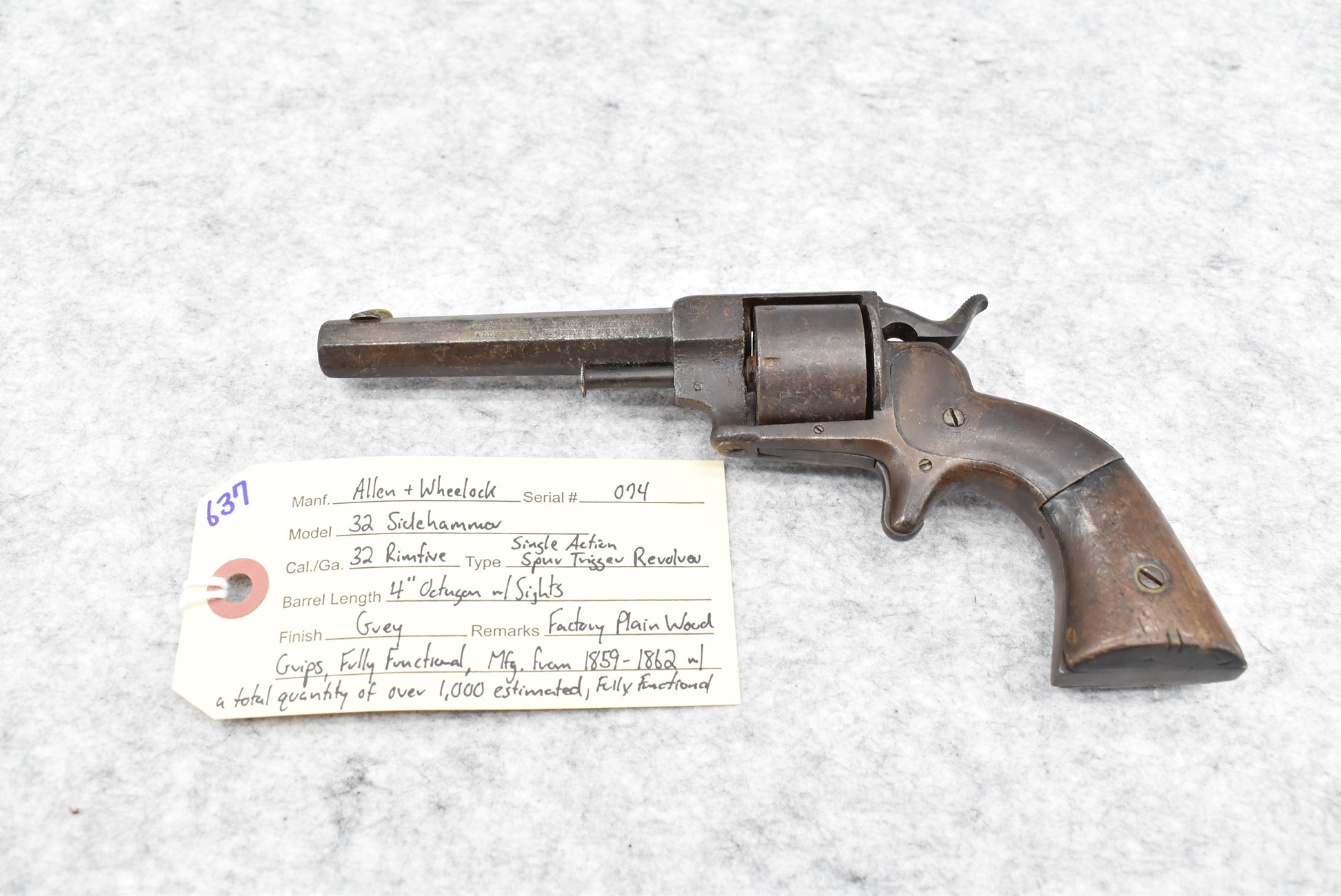 637. Allen & Wheelock – Mod. 32 Side Hammer – 32 Rim Fire Cal. Spur Trigger Single Action Revolver – w/4” Octagon Barrel w/Sights – Grey Finish – w/Factory Plain Wood Grips – Manufactured from 1859-1962 with a Total Quantity of About 1,000 Estimated Mfg. – Fully Functional