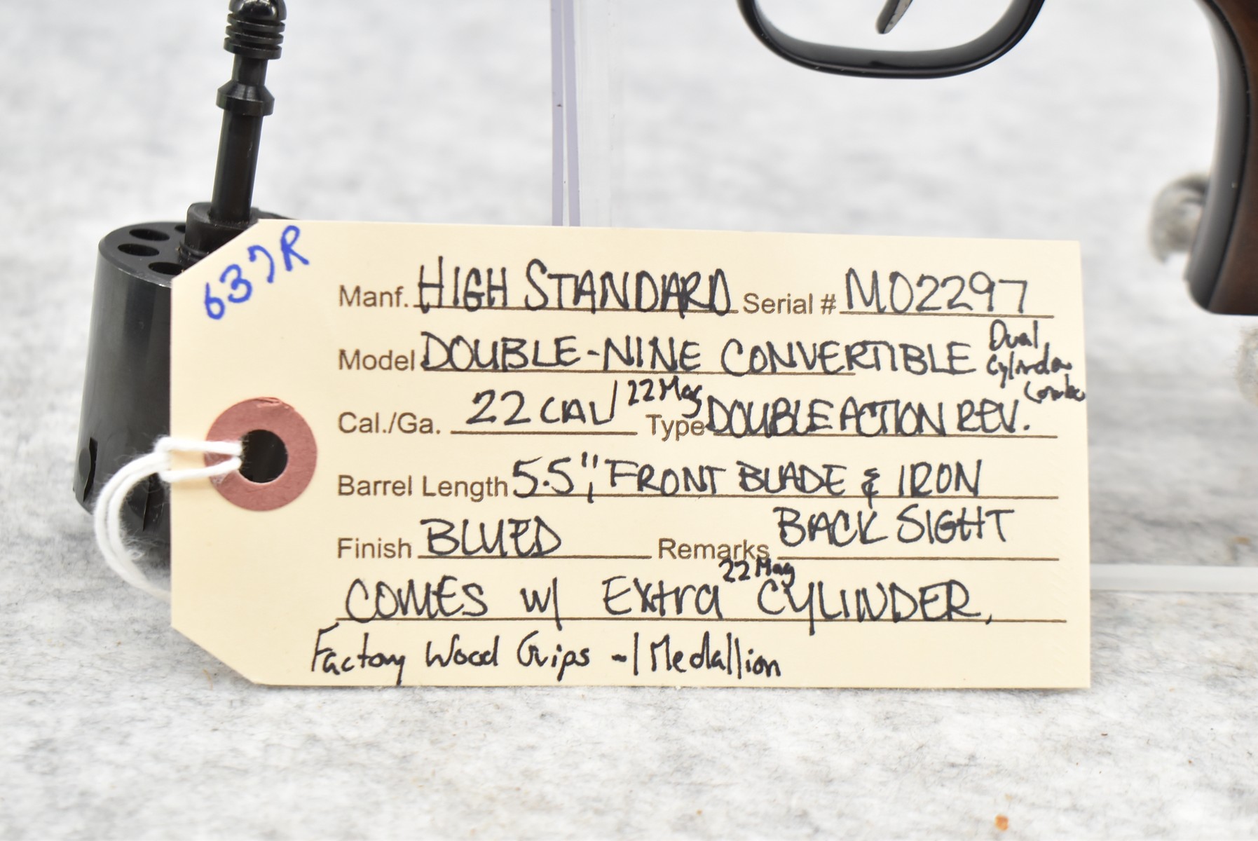 637R. Hi Standard – Mod. Double Nine Convertible Dual Cylinder Combo – 22/22 Mag. Cal. Double Action Revolver – w/5.5” Barrel w/Front Blade & Iron Rear Sights – Blued Finish – w/Factory Wood Grips w/Medallion – w/Extra 22 Mag. Cylinder