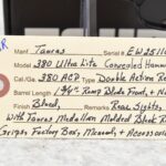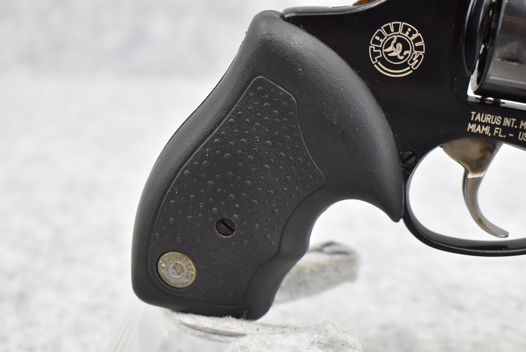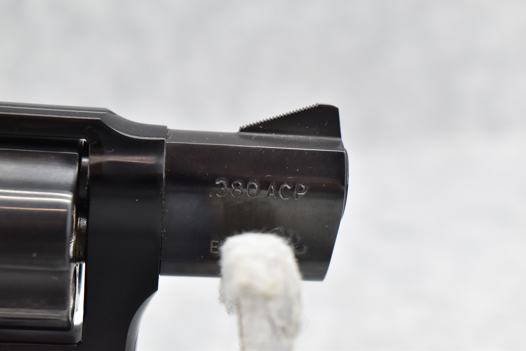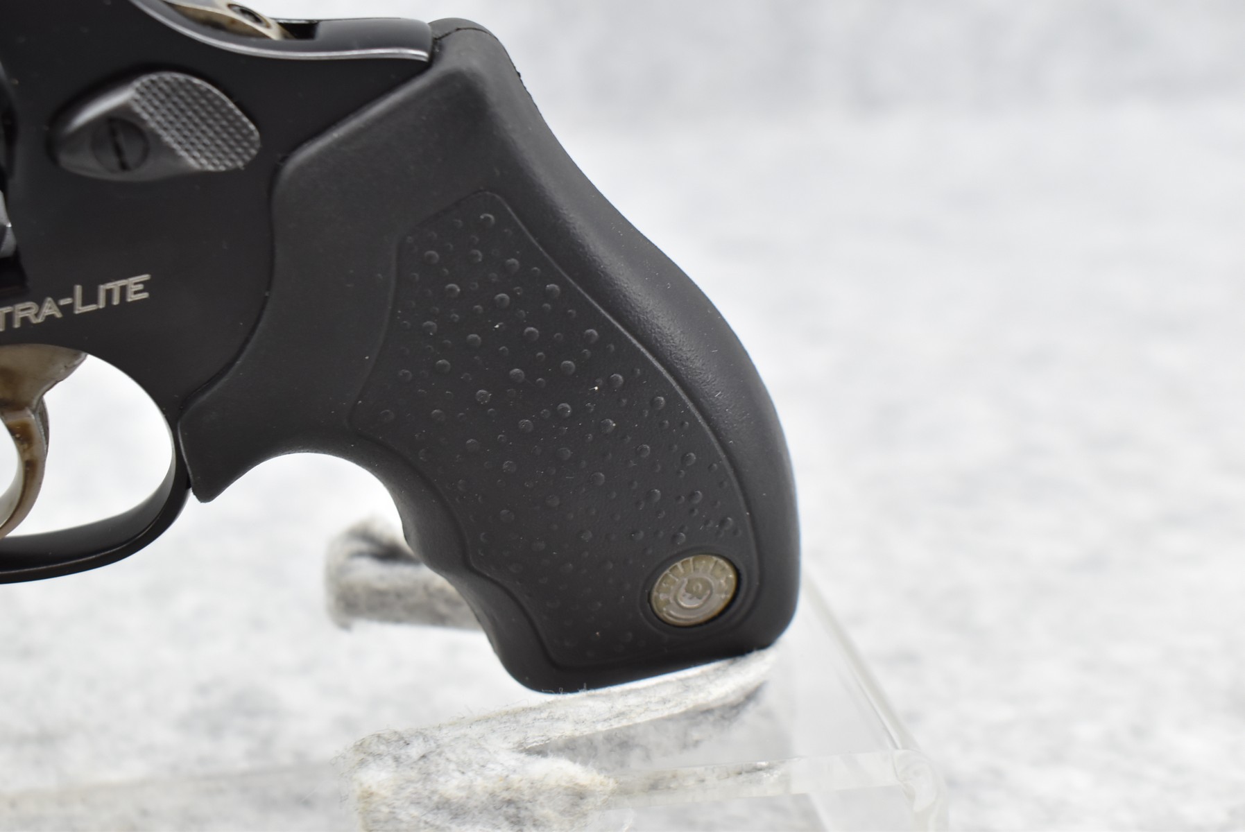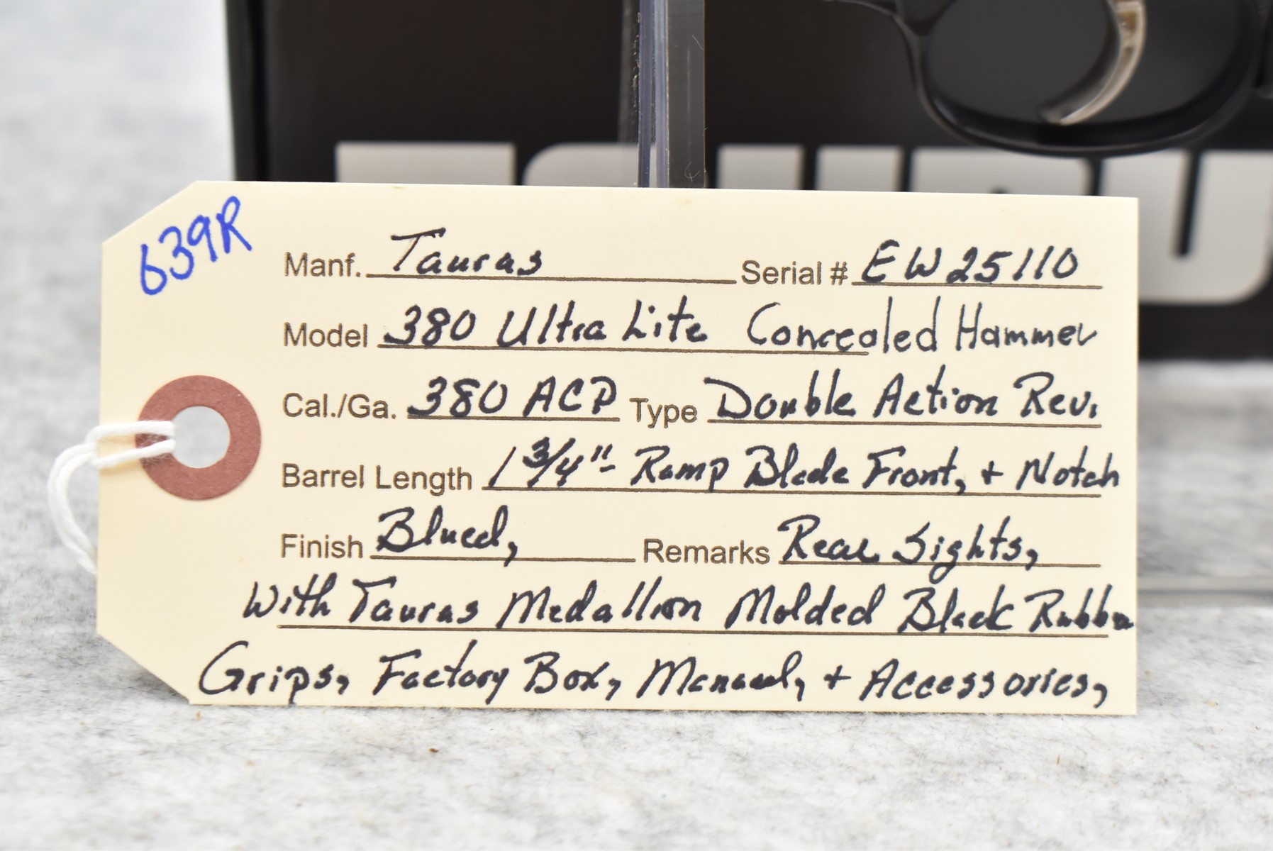 639R.     Taurus – Mod. 380 Ultra Lite Concealed Hammer – 380 ACP Cal. Double Action Revolver – w/1 ¾” Barrel w/Ramp Blade Front & Notch Rear Sights – Blued Finish – w/Taurus Medallion Molded Black Rubber Grips – As New w/Factory Box, Manual & Accessories