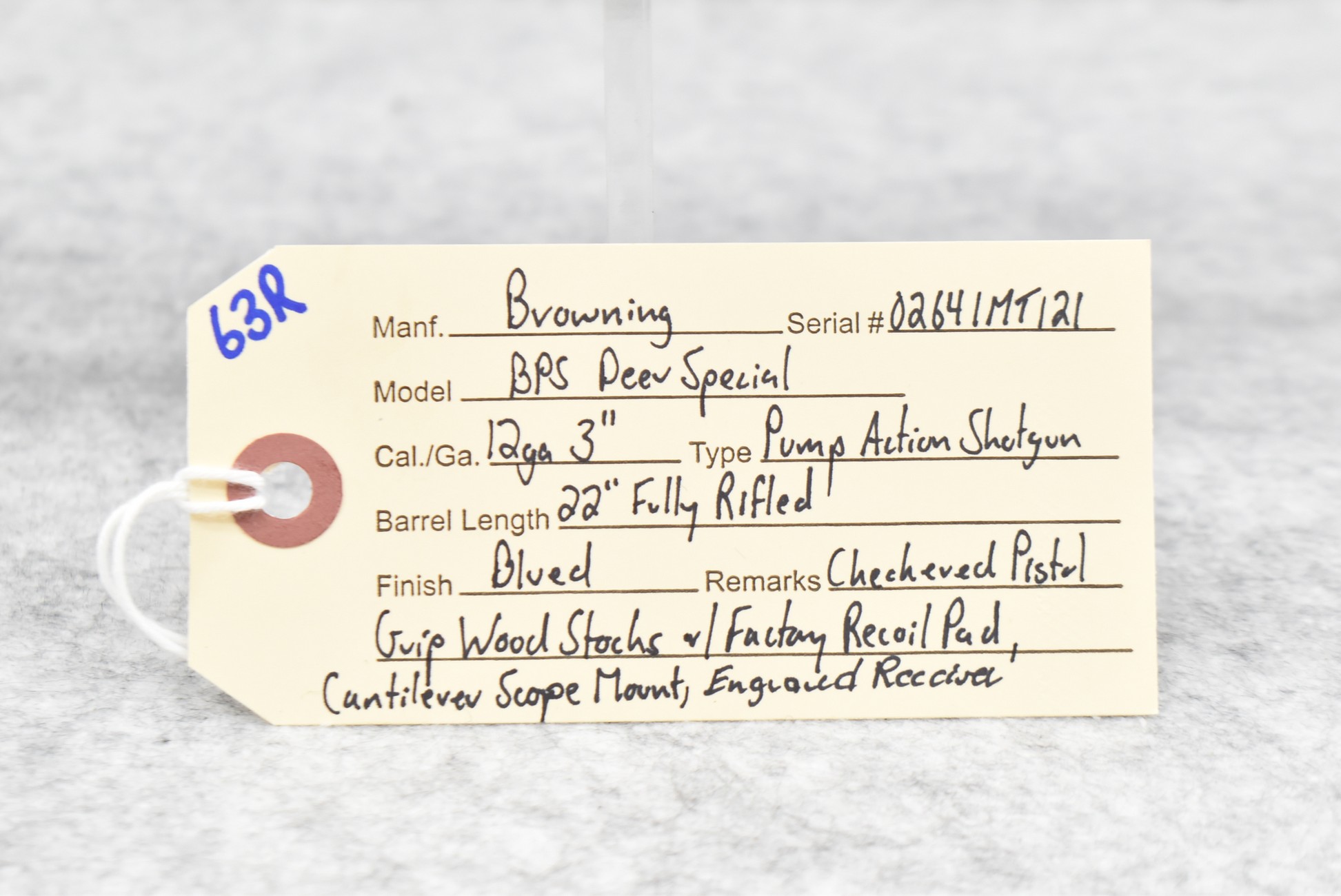 63R. Browning – Mod. BPS Deer Special – 12ga. 3” Pump Action Shotgun – w/22” Fully Rifled Barrel – Blued Finish – w/Engraved Receiver – w/Checkered Pistol Grip Wood Stocks w/Factory Recoil Pad – w/Cantilever Scope Mount