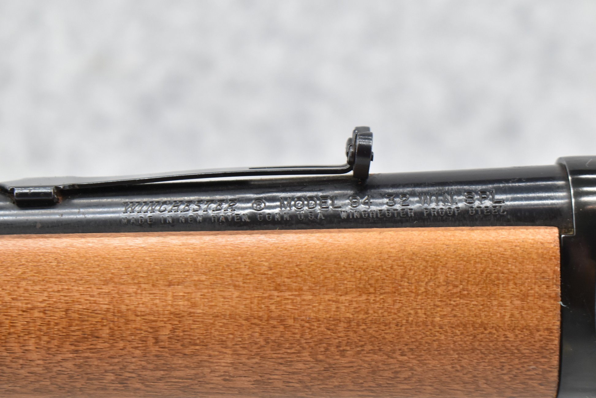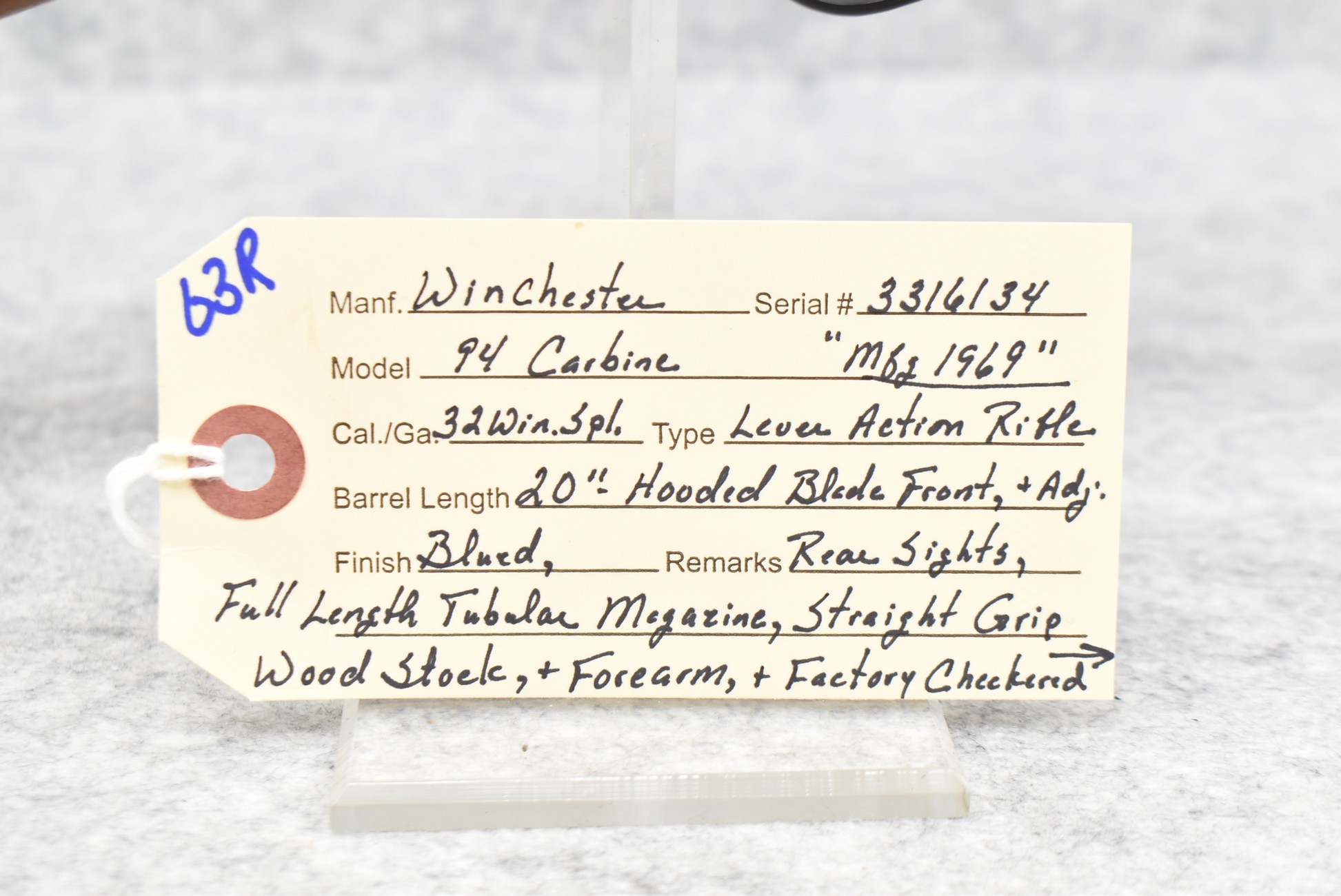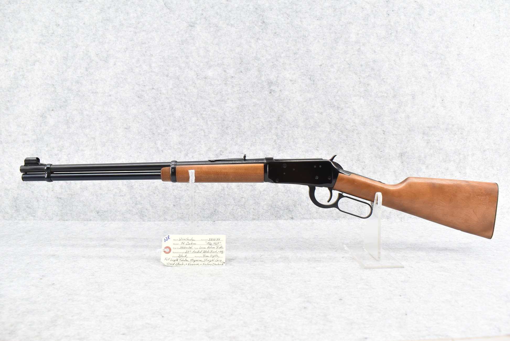 63R. Winchester – Mod. 94 Carbine – 32 Win. Spl. Cal. Lever Action Rifle – w/20” Barrel w/Hooded Blade Front & Adj. Rear Sights w/Full Length Tubular Magazine – Blued Finish – w/Straight Grip Wood Stocks w/Factory Checkered Metal Butt Plate – Mfg. 1969