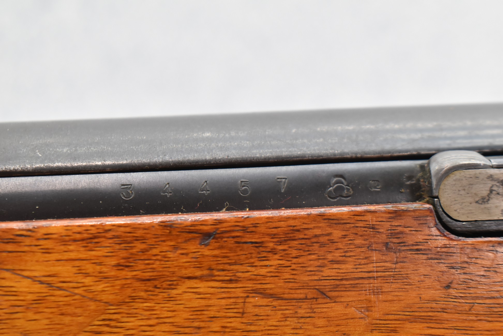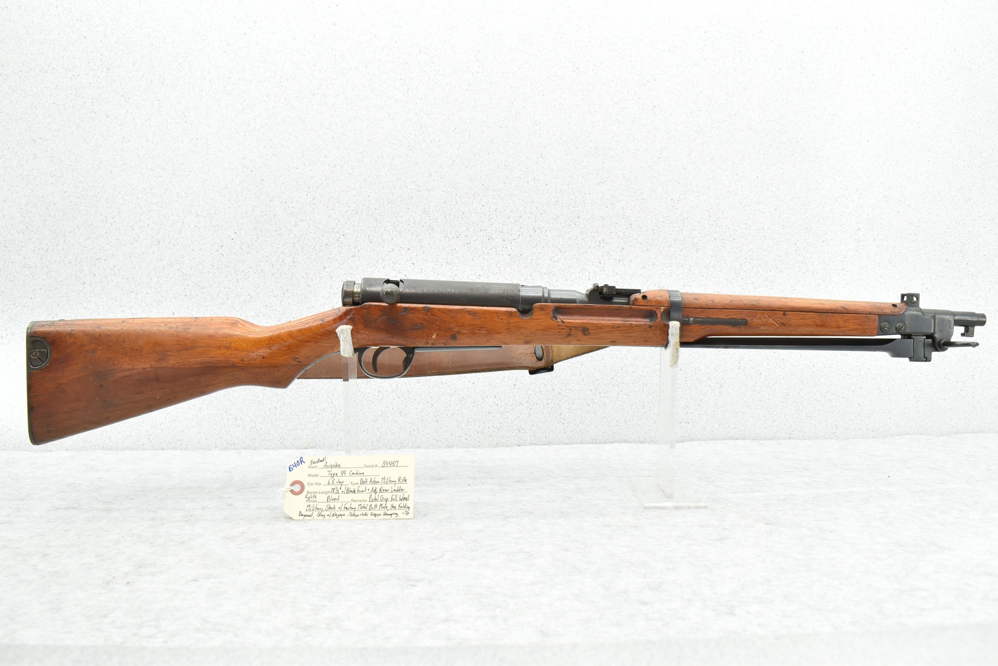 640R. Arisaka – Type 44 Carbine – 6.5 Jap Cal. Bolt Action Military Rifle – w/18 ½” Barrel w/Blade Front & Adj. Rear Ladder Sights – Blued Finish – w/Pistol Grip Full Wood Military Stock w/Factory Metal Butt Plate – w/Sling w/Nagoya-Tokyo Juki Kogyo Stamping – w/Folding Bayonet – This Carbine is in Outstanding Original Condition, Retaining an Incredible Amount of Bluing! – Ground Mum