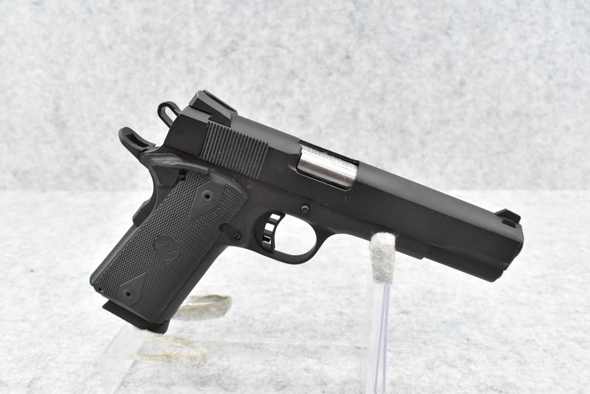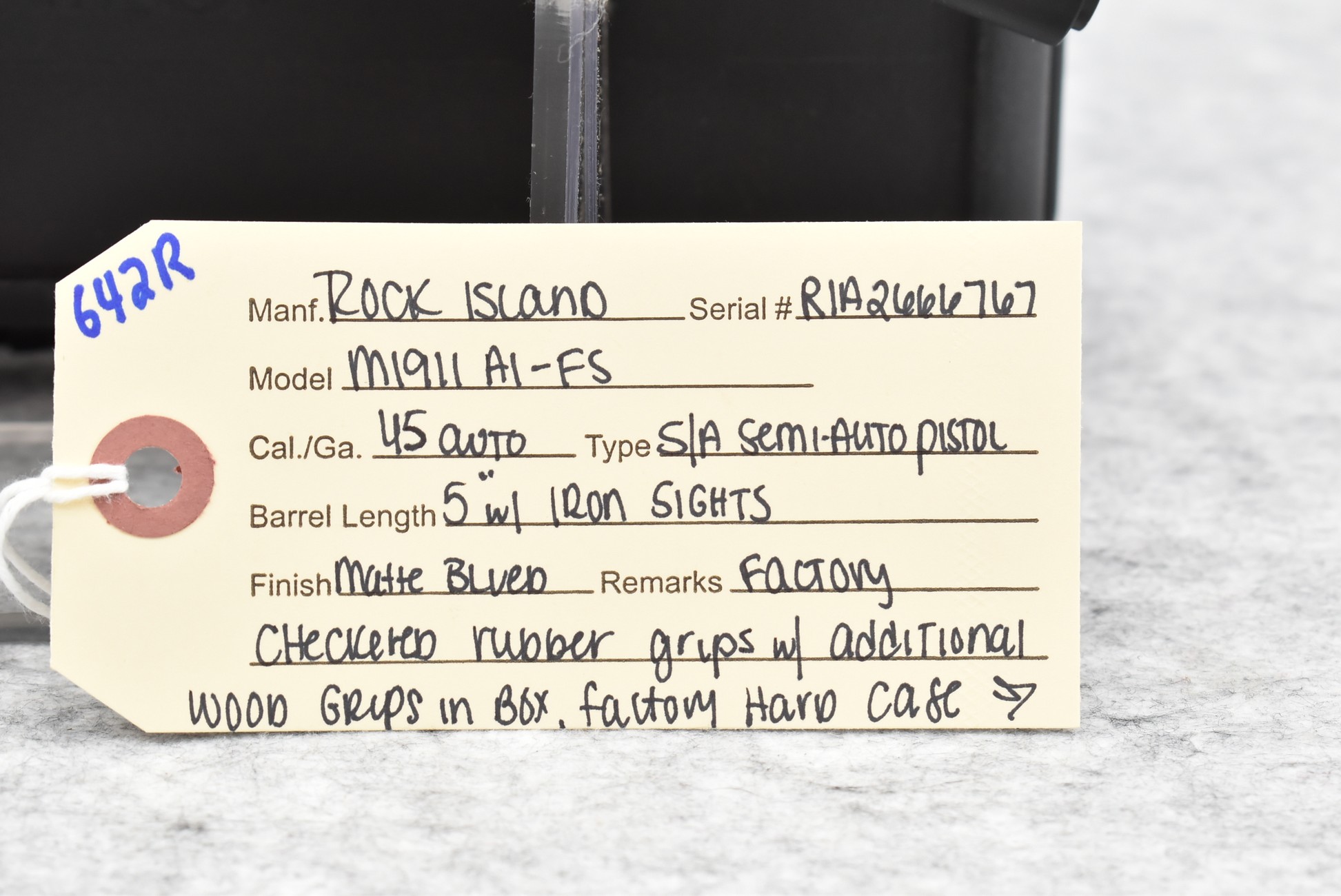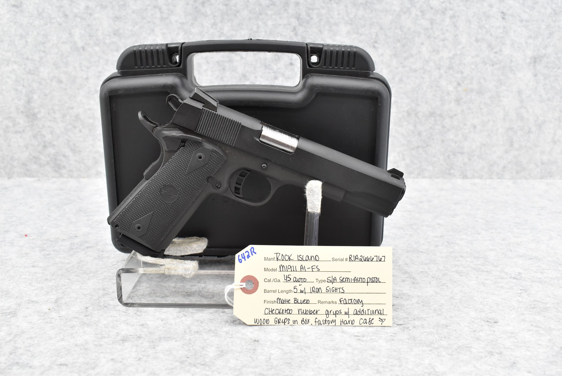 642R. Rock Island – Mod. M1911 A1-FS – 45 Auto Cal. Semi-Auto Pistol – w/5” Barrel w/Iron Sights – Matte Blued Finish – w/Factory Checkered Rubber Grips w/Additional Wood Grips in Box – w/Magazine – w/Factory Hard Case and Manual