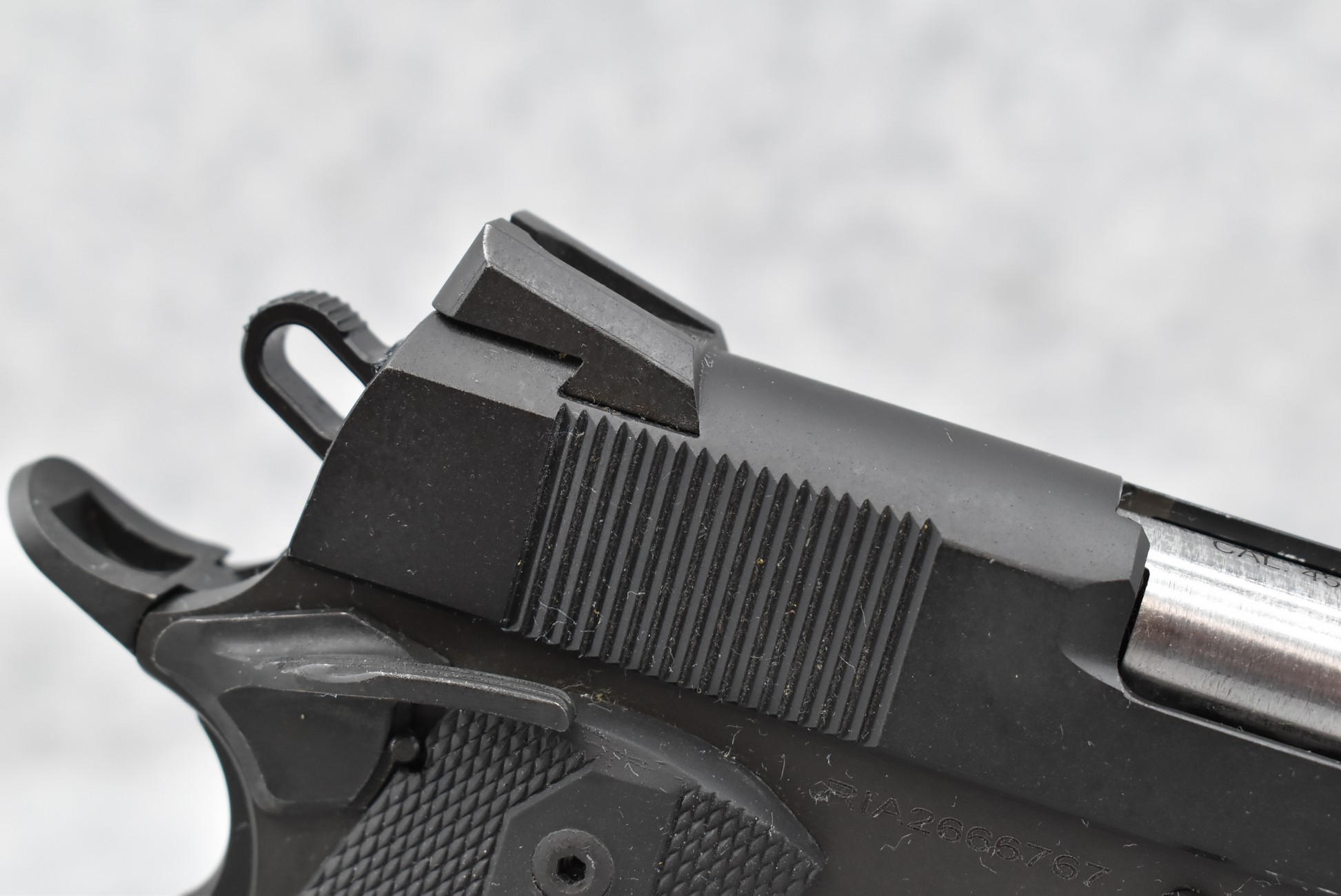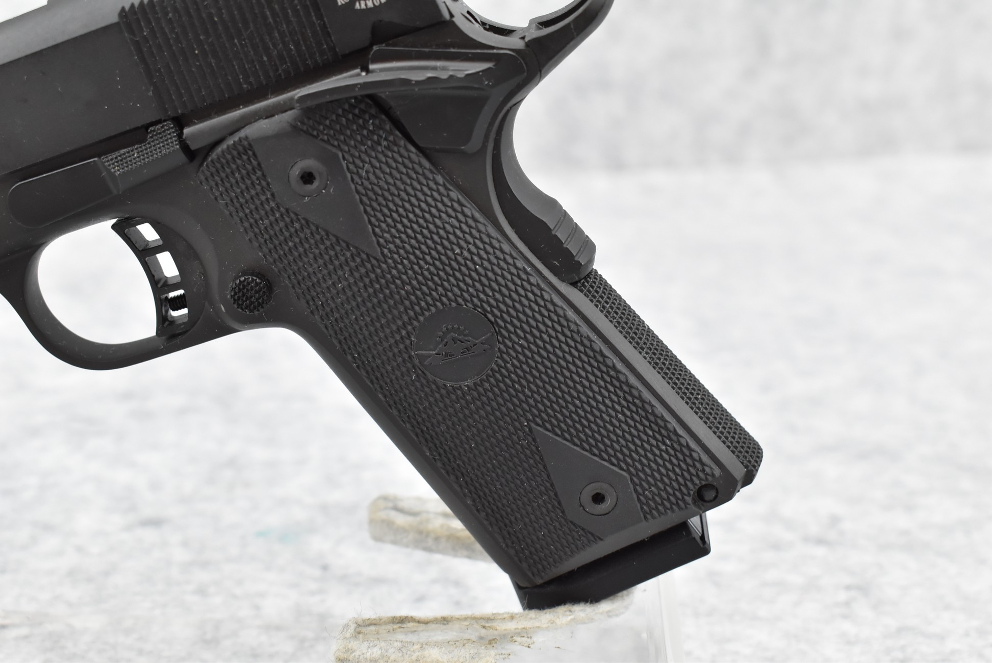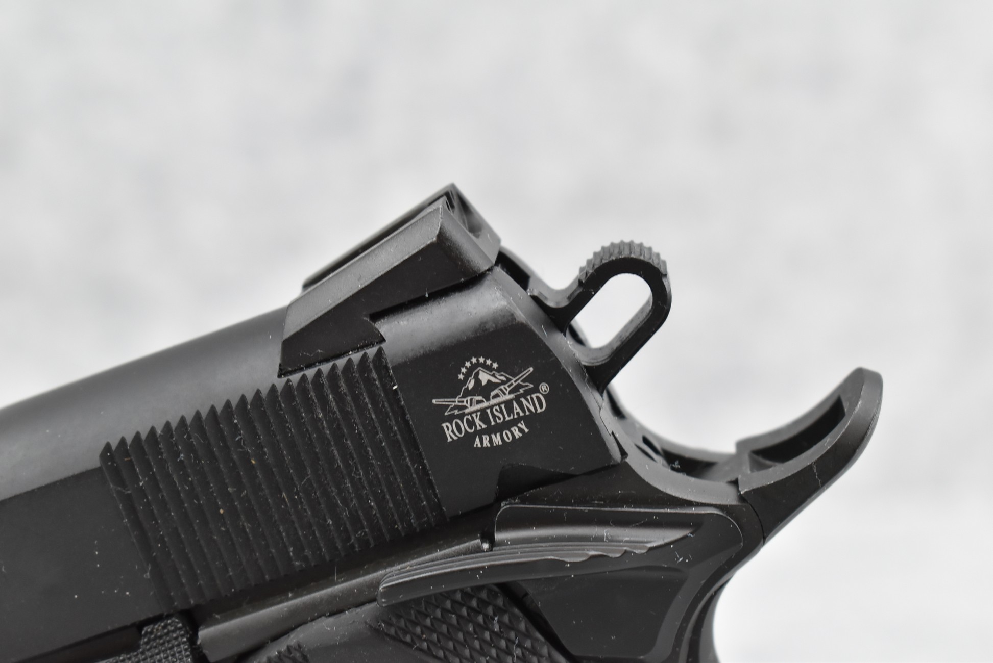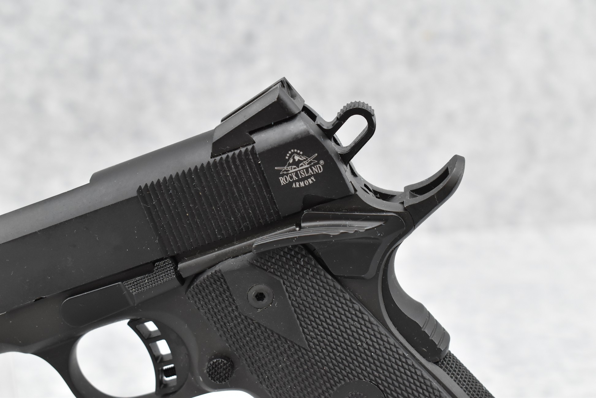 642R. Rock Island – Mod. M1911 A1-FS – 45 Auto Cal. Semi-Auto Pistol – w/5” Barrel w/Iron Sights – Matte Blued Finish – w/Factory Checkered Rubber Grips w/Additional Wood Grips in Box – w/Magazine – w/Factory Hard Case and Manual