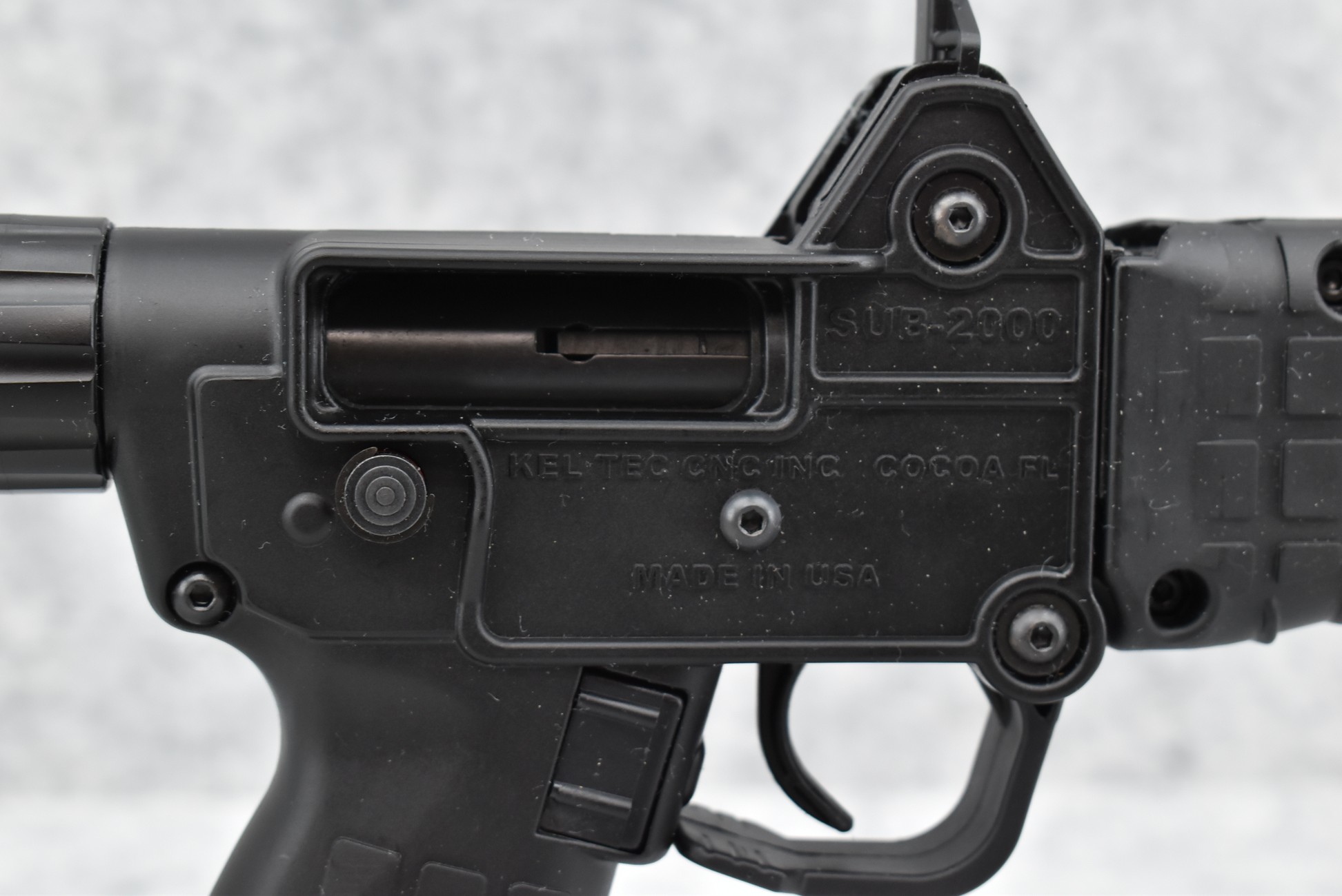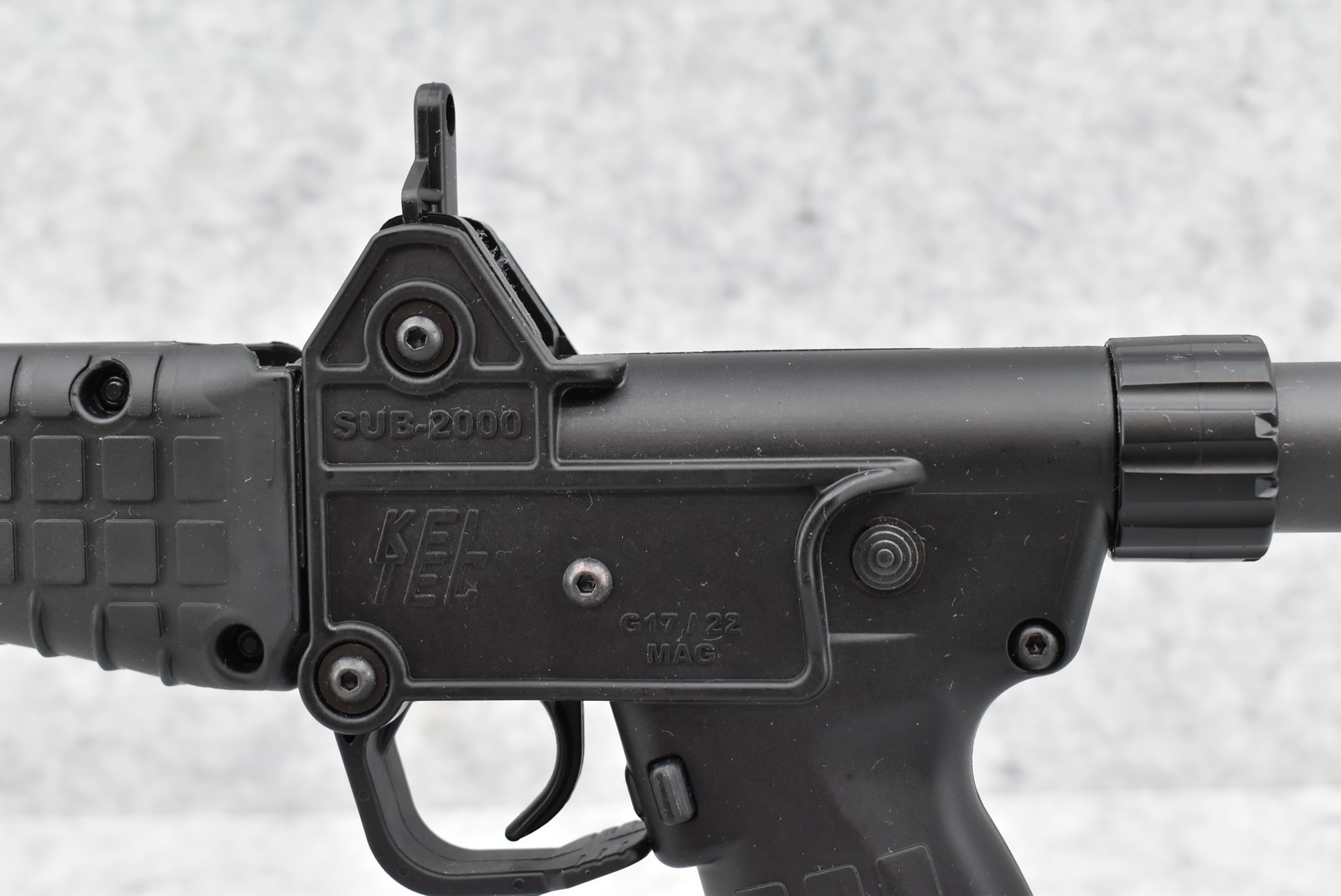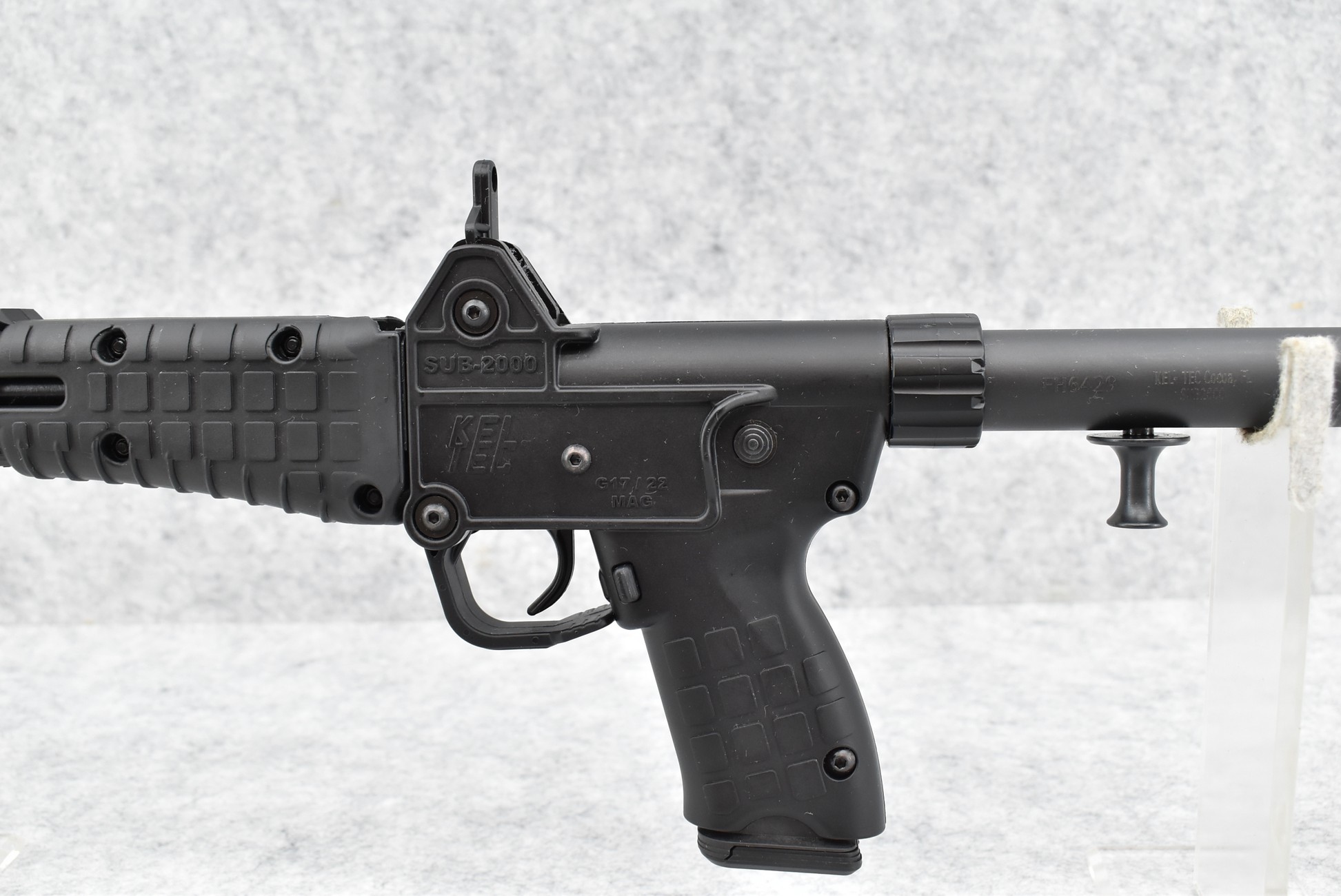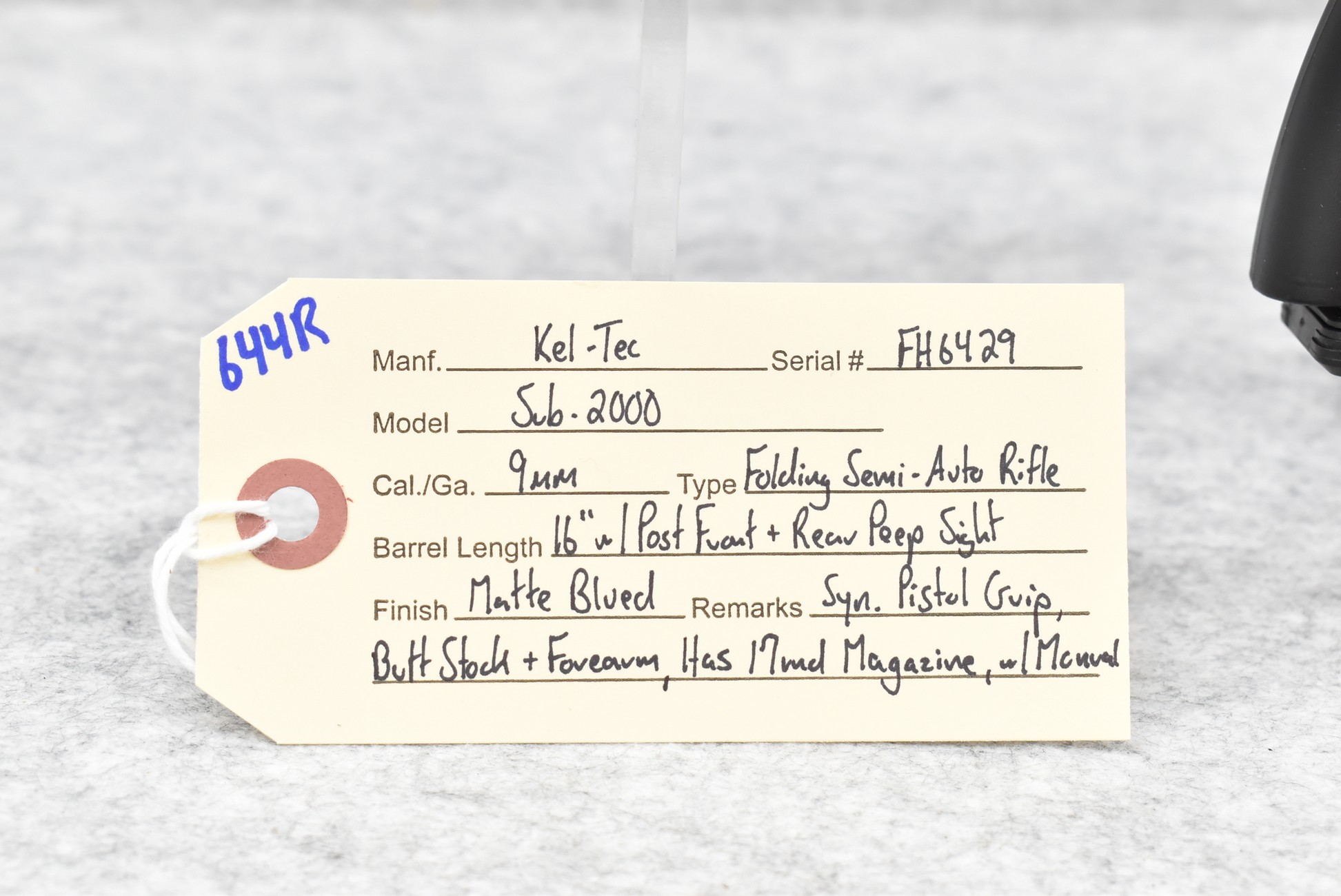 644R. Kel-Tec – Mod. Sub-2000 – 9mm Cal. Folding Semi-Auto Rifle – w/16” Barrel w/Post Front and Rear Peep Sights – Matte Blued Finish – w/Synthetic Pistol Grip, Butt Stock, and Forearm – w/17-Round Magazine – w/Manual