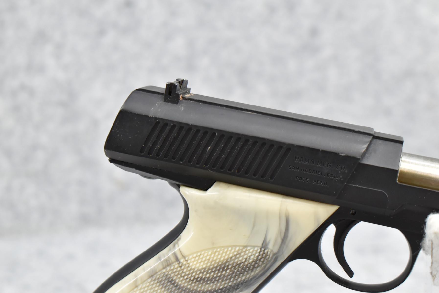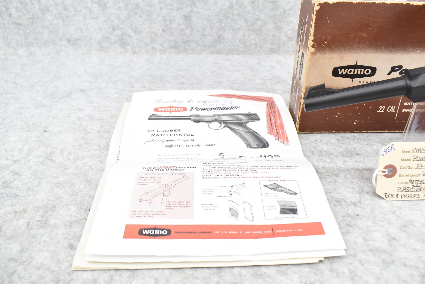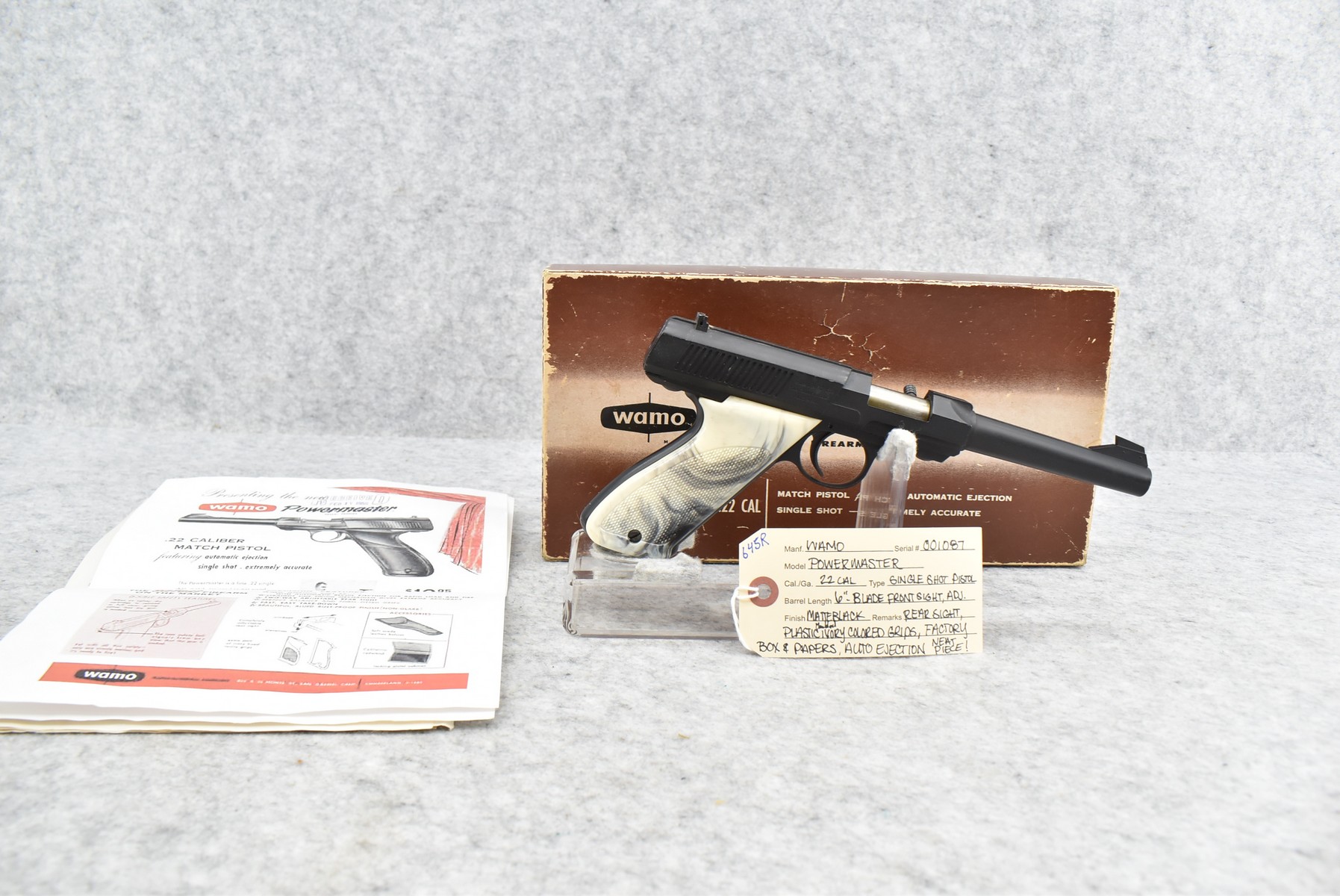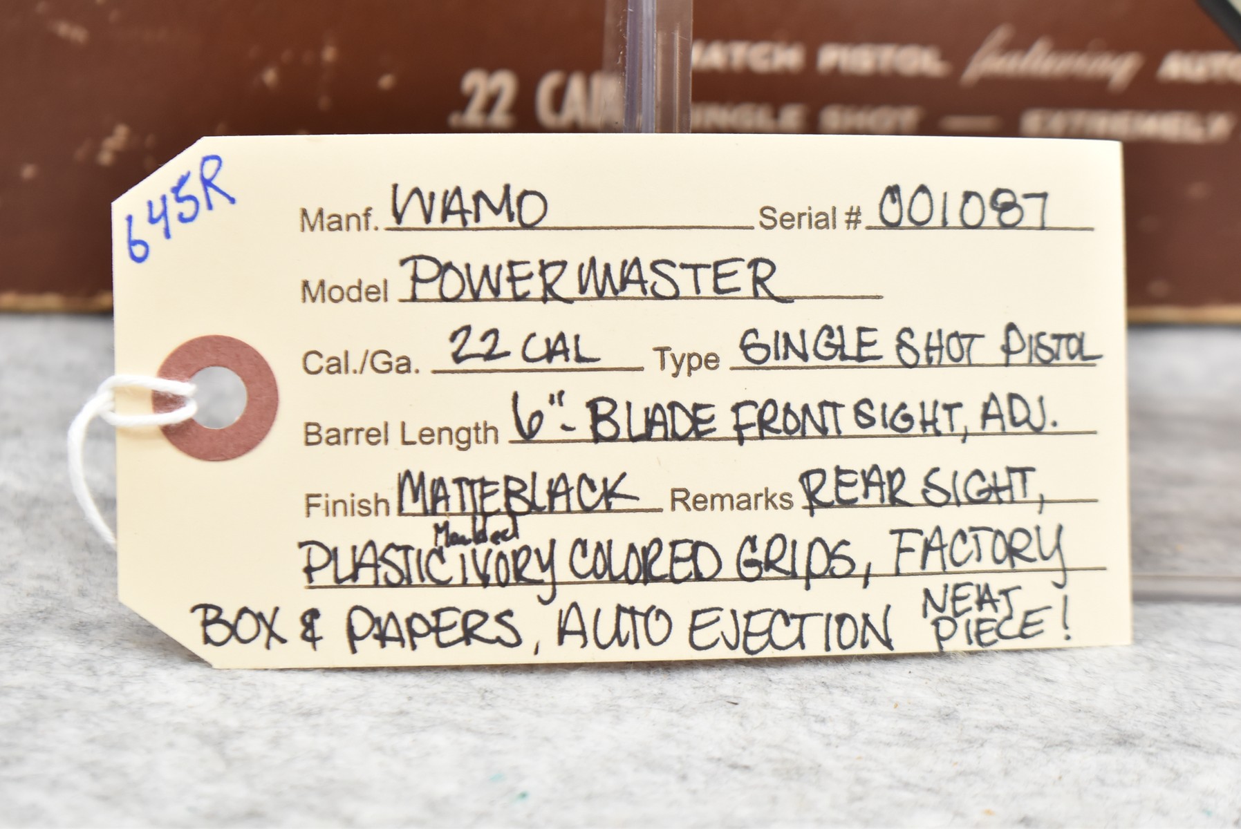 645R. Wamo – Mod. Powermaster – 22 Cal. Single Shot Pistol – w/6” Barrel w/Blade Front Sight & Adj. Rear Sights – Matte Black Finish – w/Plastic Molded Ivory Colored Grips – w/Auto Ejection – w/Factory Box & Papers