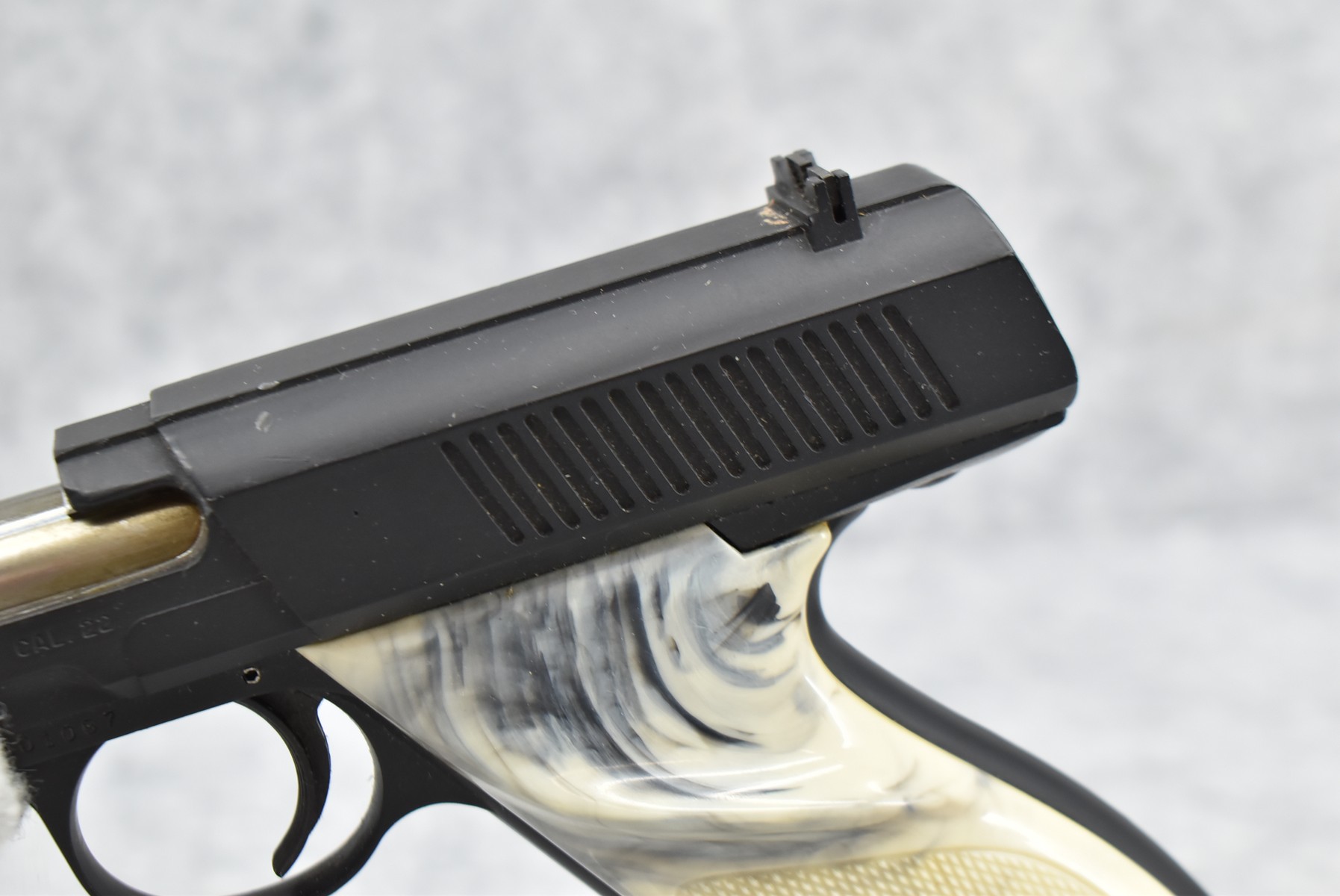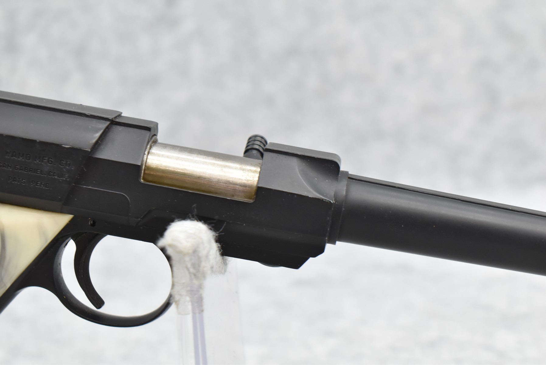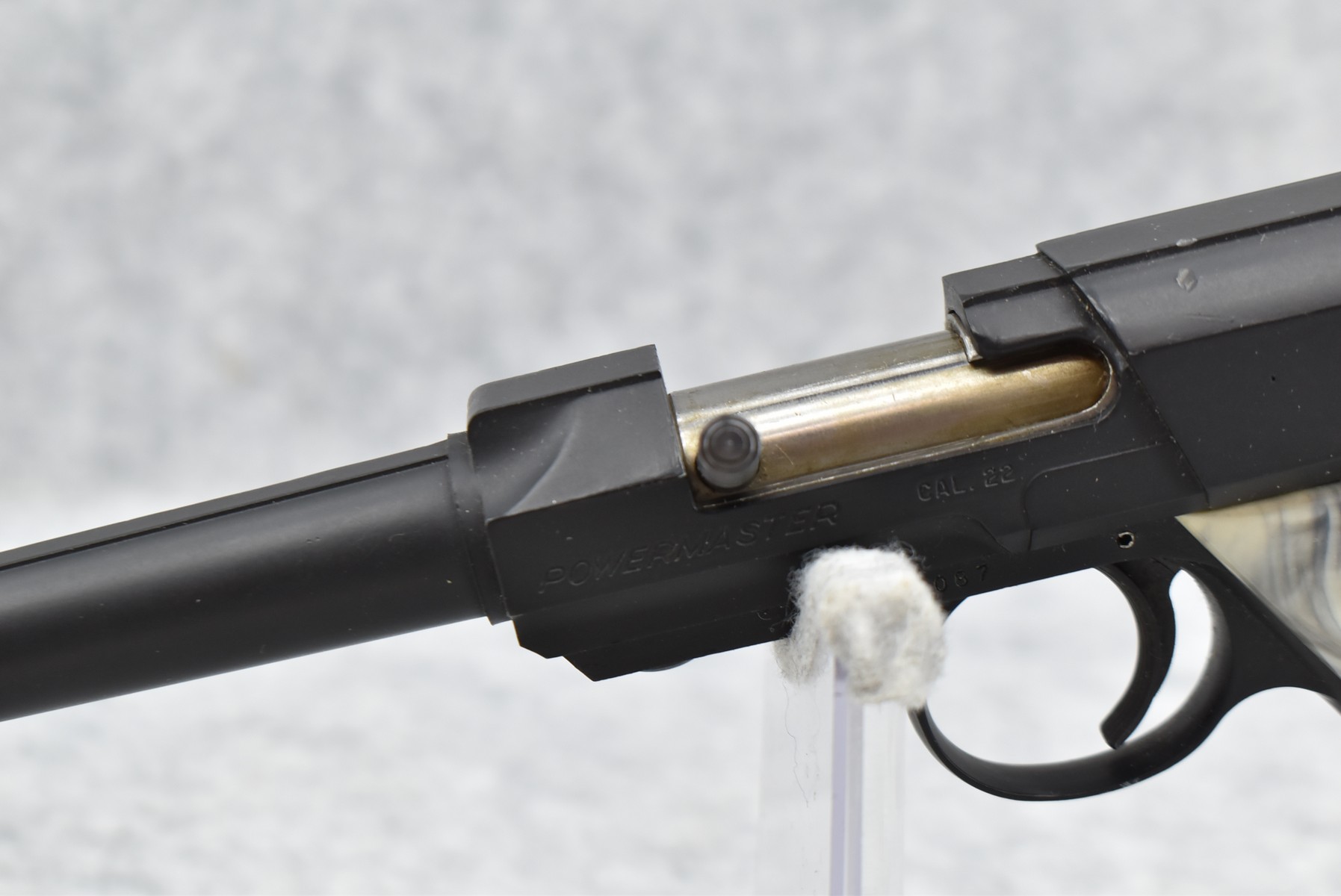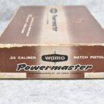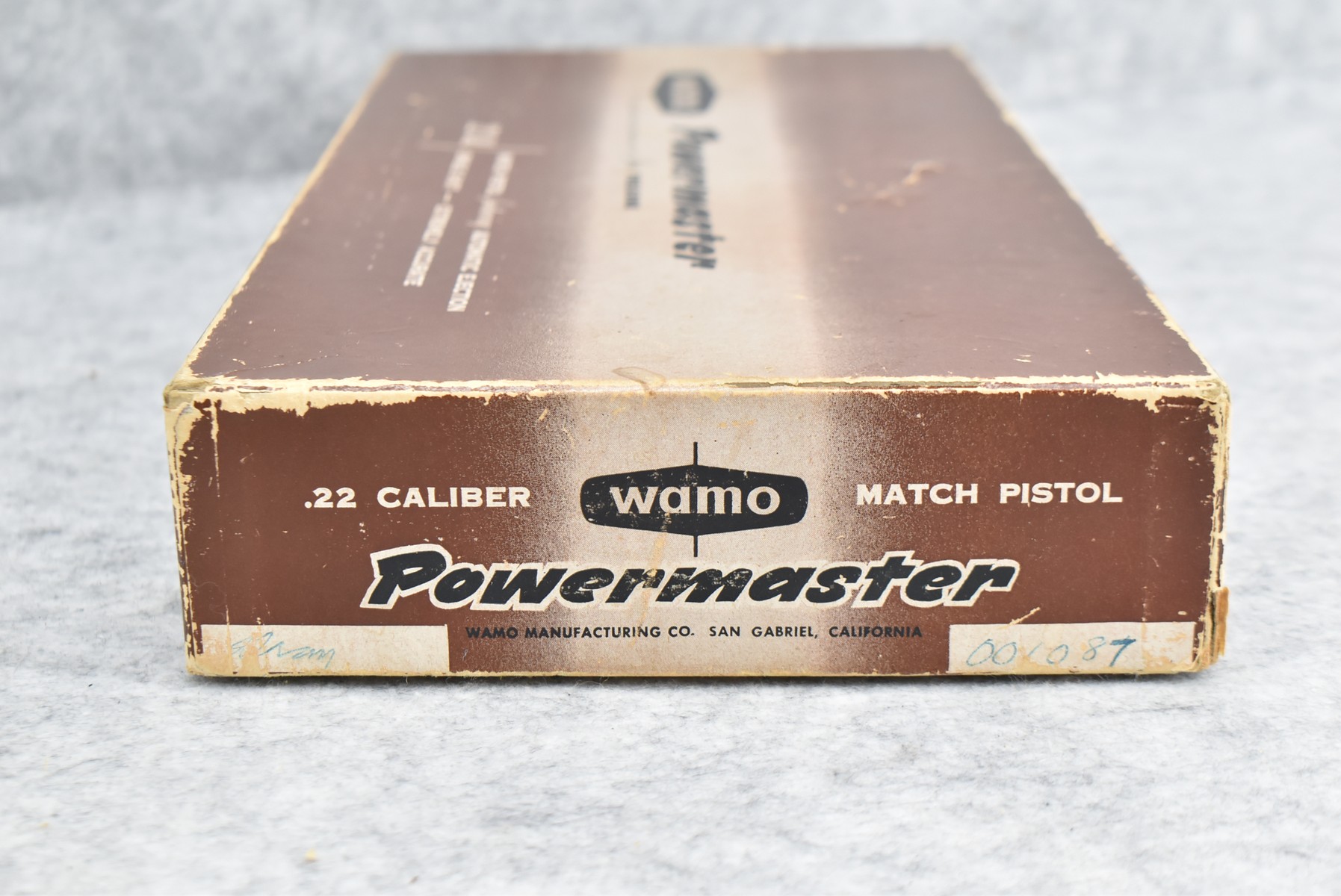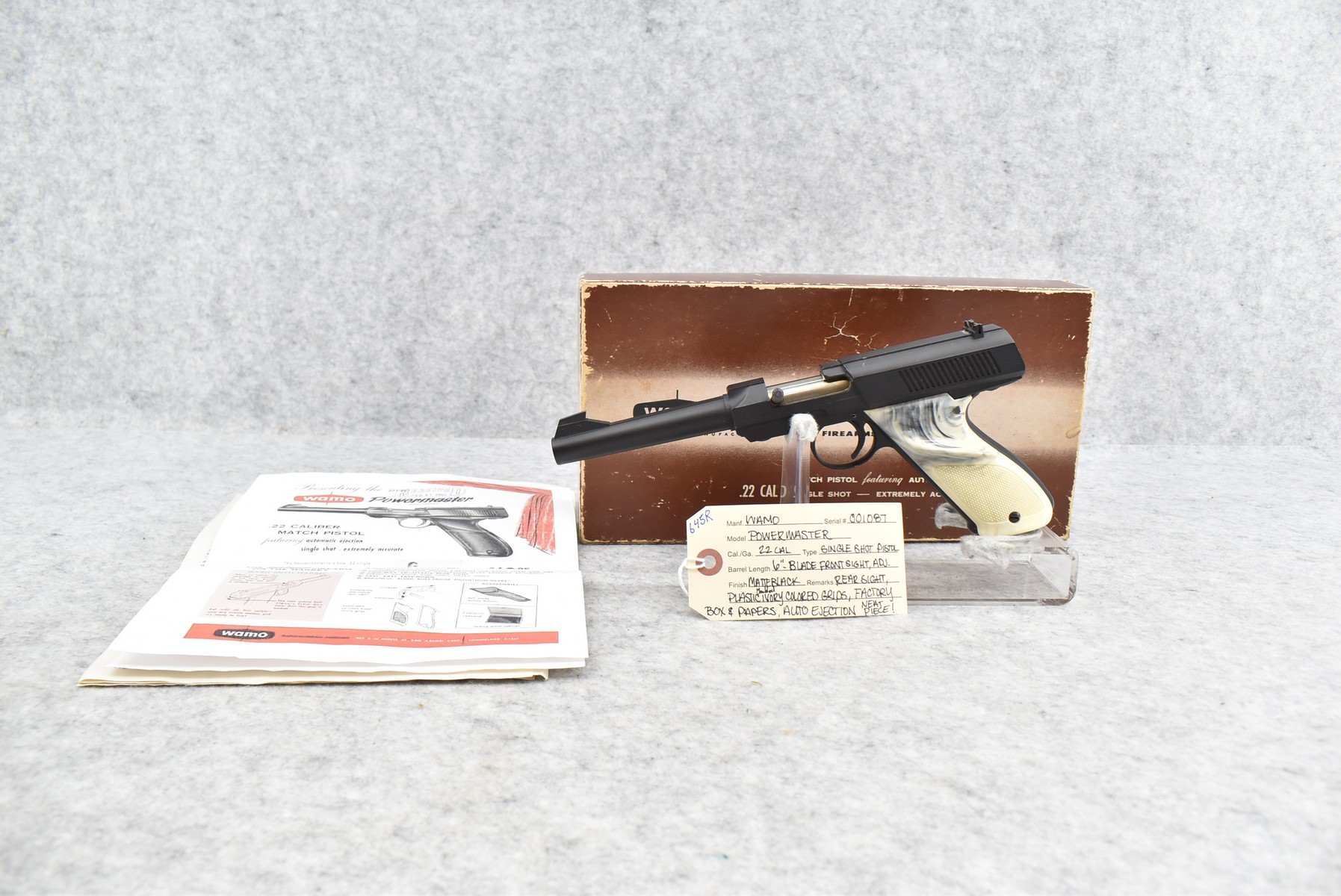645R. Wamo – Mod. Powermaster – 22 Cal. Single Shot Pistol – w/6” Barrel w/Blade Front Sight & Adj. Rear Sights – Matte Black Finish – w/Plastic Molded Ivory Colored Grips – w/Auto Ejection – w/Factory Box & Papers
