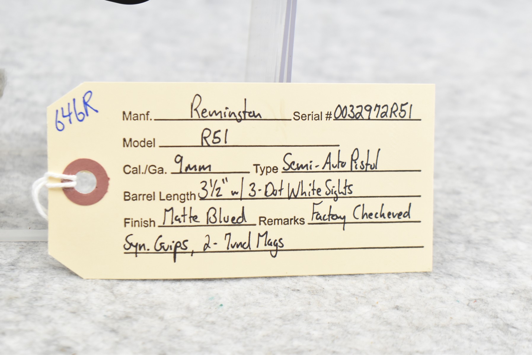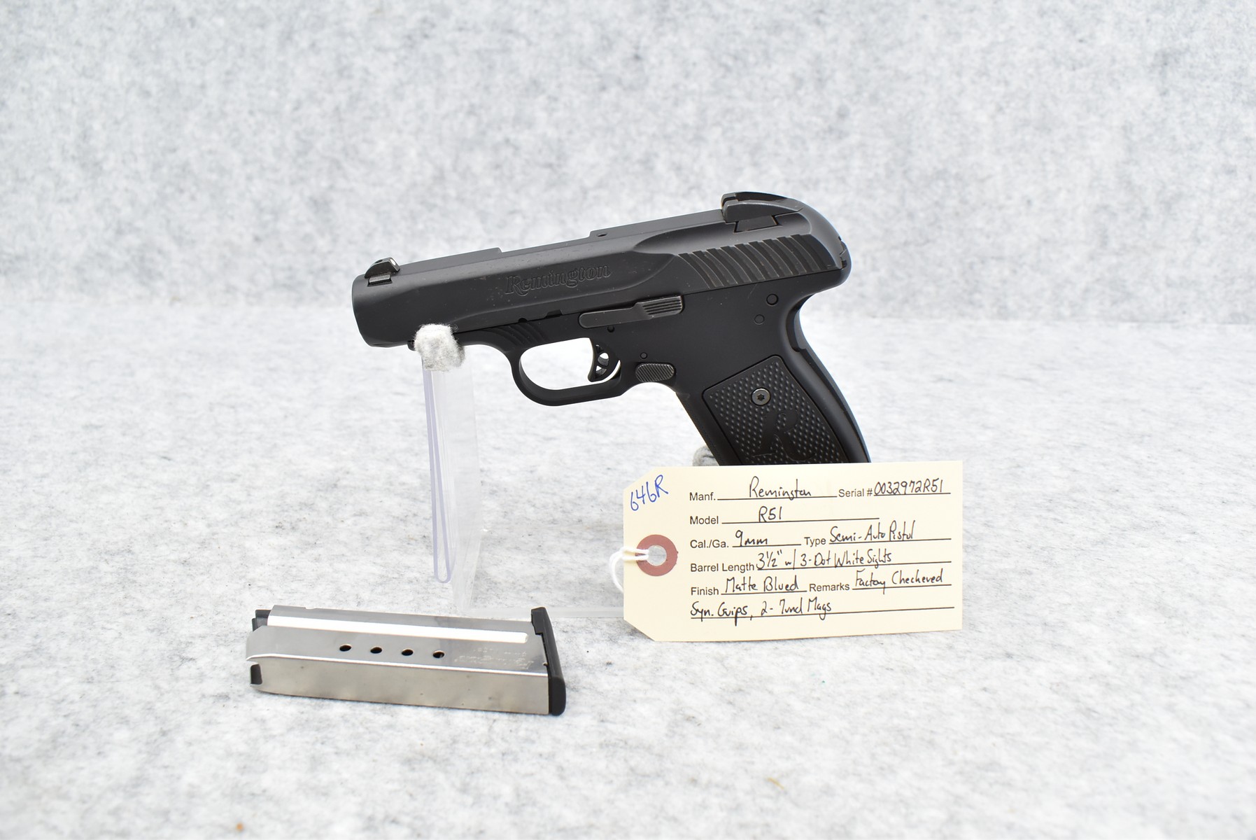 646R. Remington – Mod. R51 – 9mm Cal. Semi-Auto Pistol – w /3 ½” Barrel w/3-Dot White Sights – Matte Blued Finish – w/Factory Checkered Synthetic Grips – w/Two 7Rd Mags