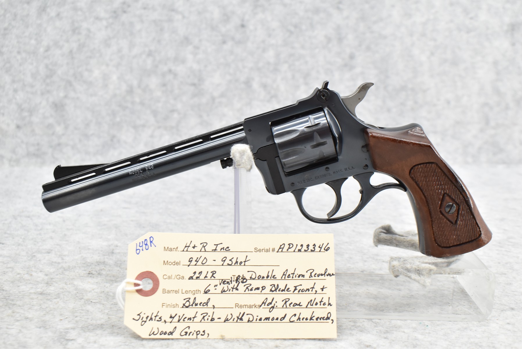 648R.     H. & R. Inc. – Mod. 940 – 22LR Cal. Double Action 9-Shot Revolver – w/6” Vent-Rib Barrel w/Ramp Blade Front & Adj. Rear Notch Sights – Blued Finish – w/Diamond Checkered Wood Grips