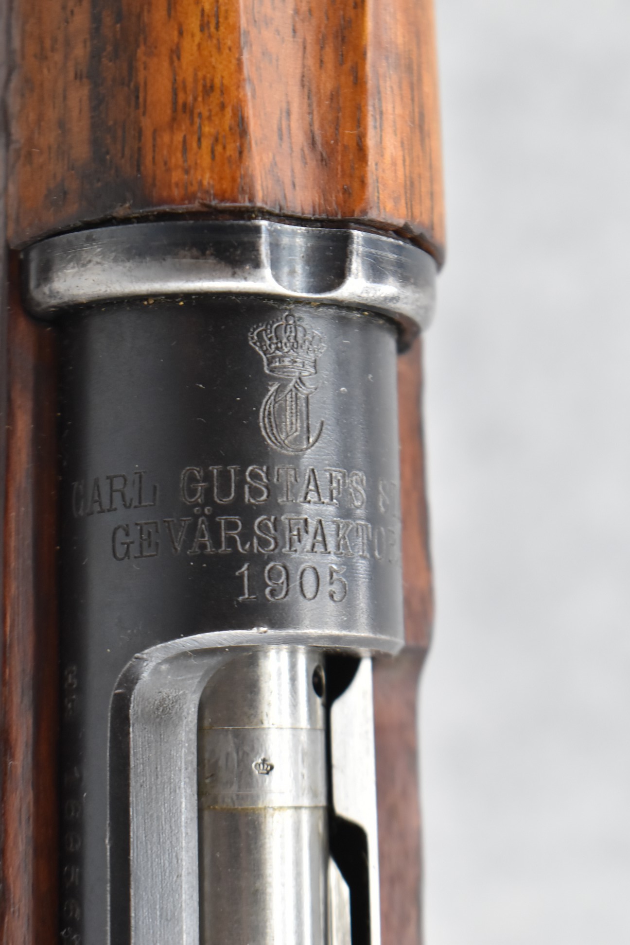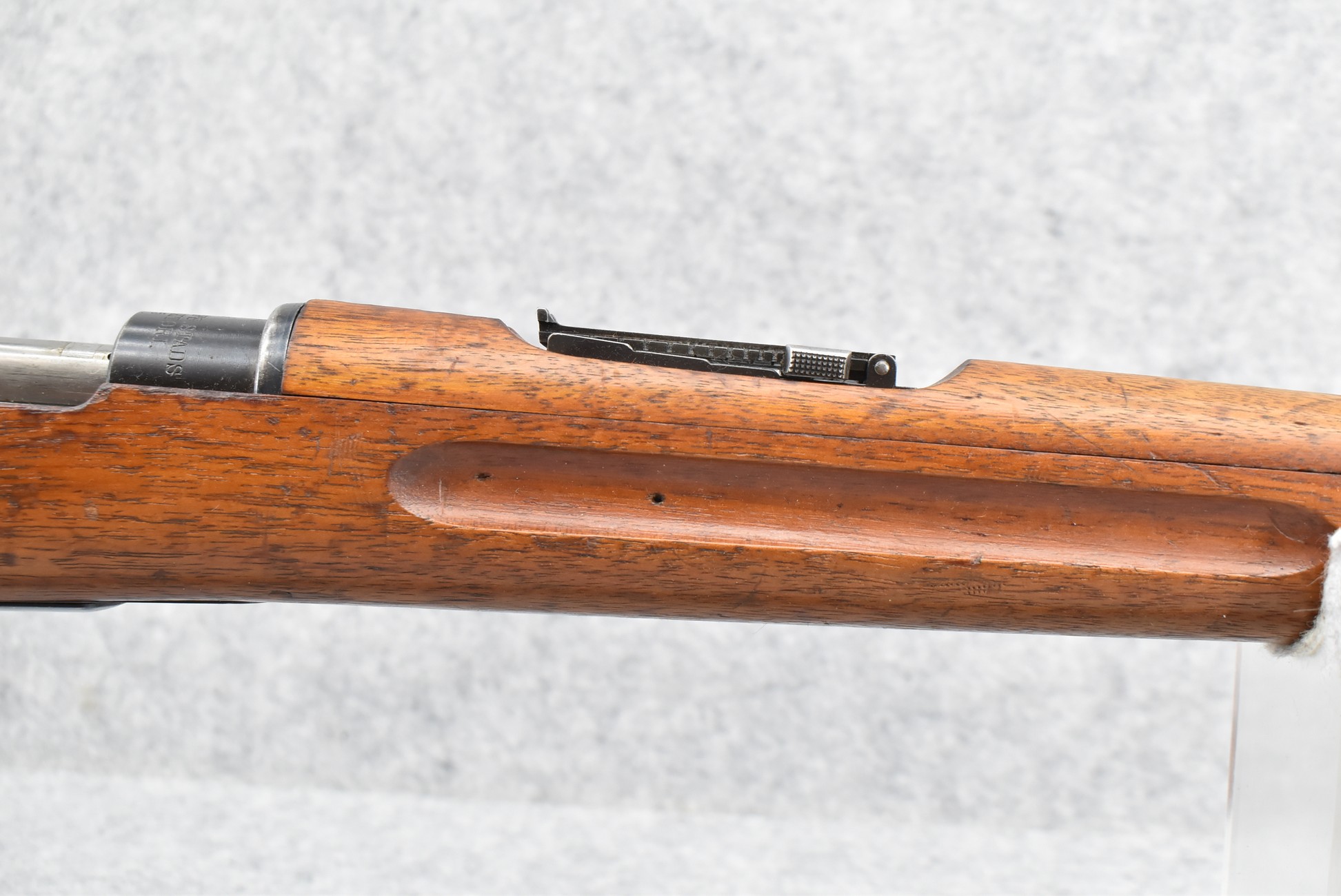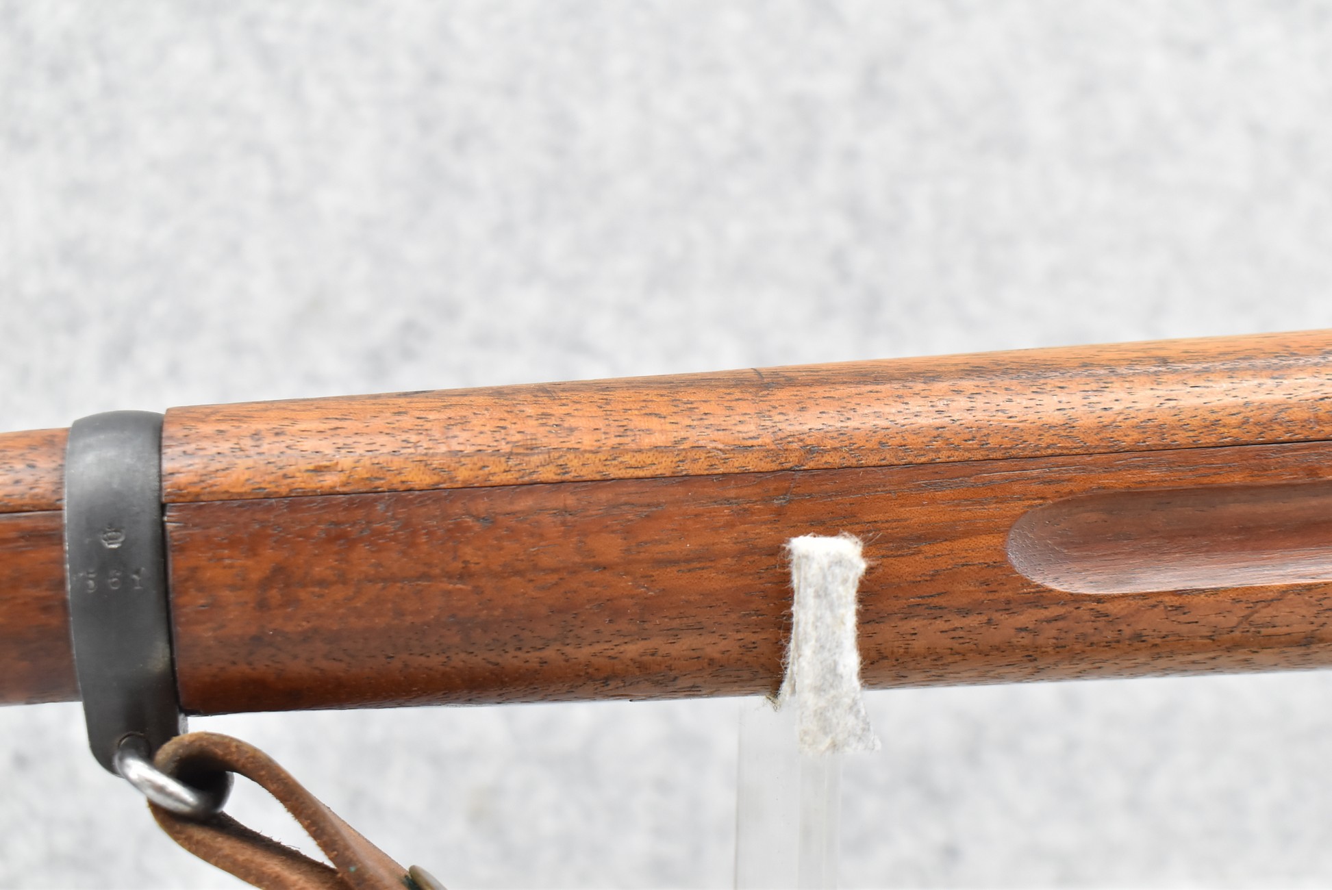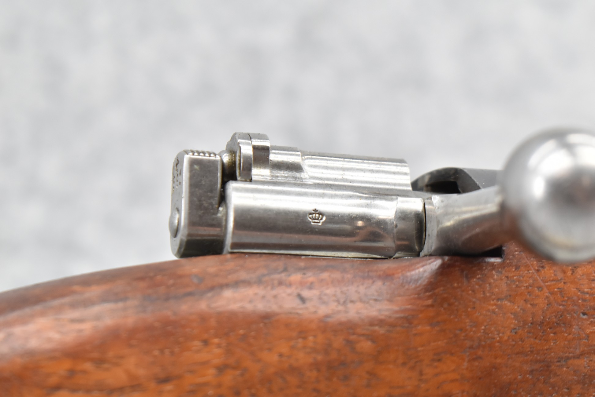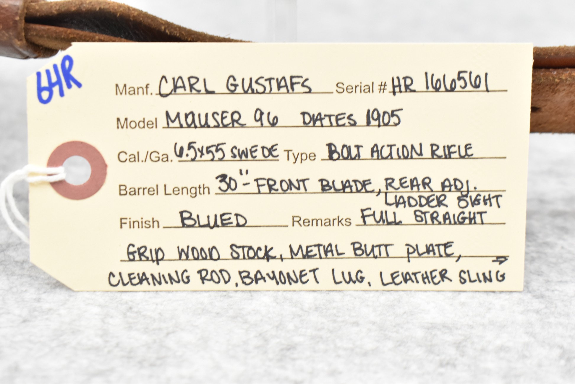 64R. Carl Gustafs – Mod. Mauser 96 – 6.5×55 Cal. Bolt Action Rifle – w/30” Barrel w/Blade Front and Adjustable Rear Ladder Sights – Blued Finish – w/Full Straight Grip Wood Stock w/Metal Butt Plate – w/Cleaning Rod – w/Bayonet Lug – w/Leather Sling – All Numbers are Matching – Import Marked – Dated 1905