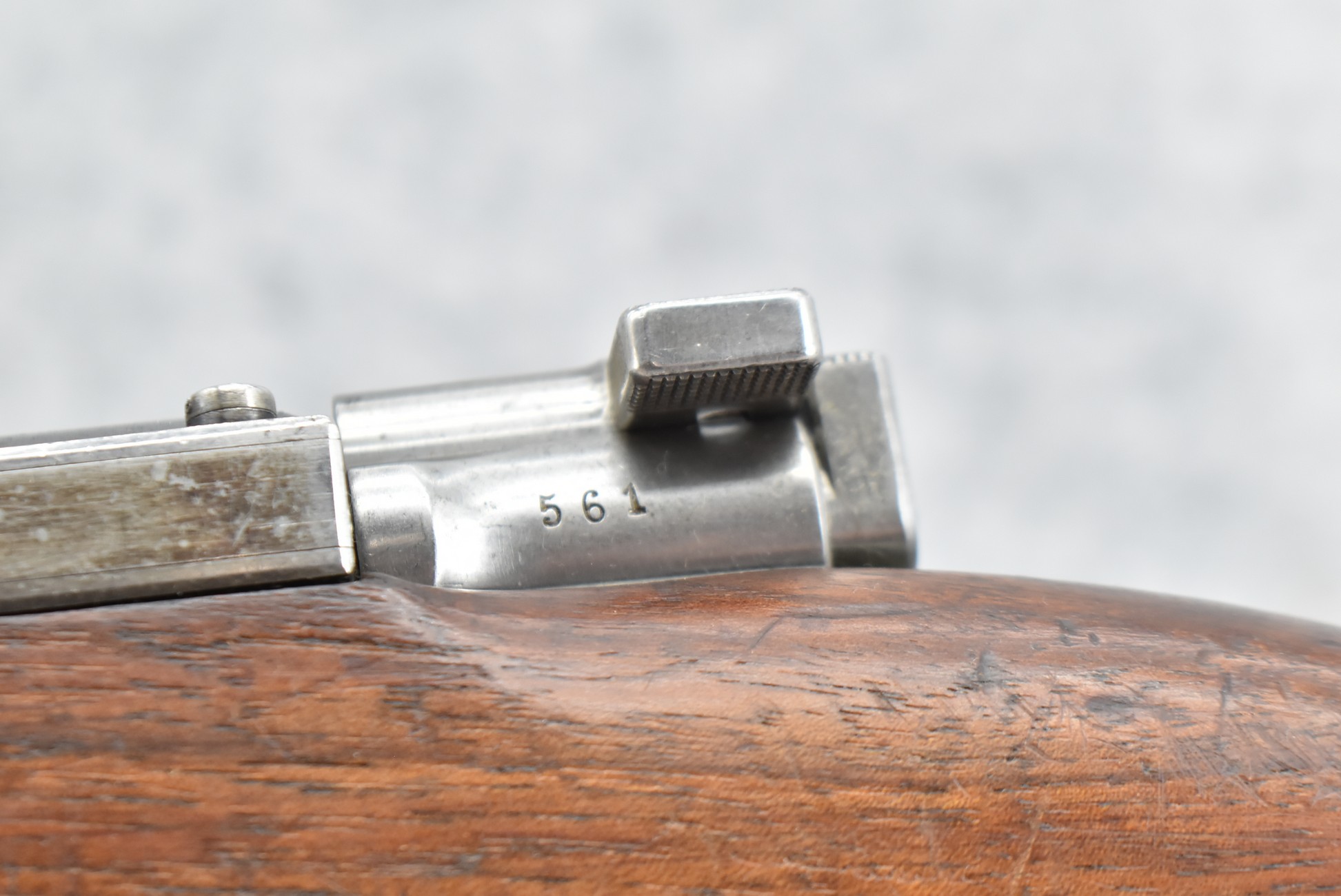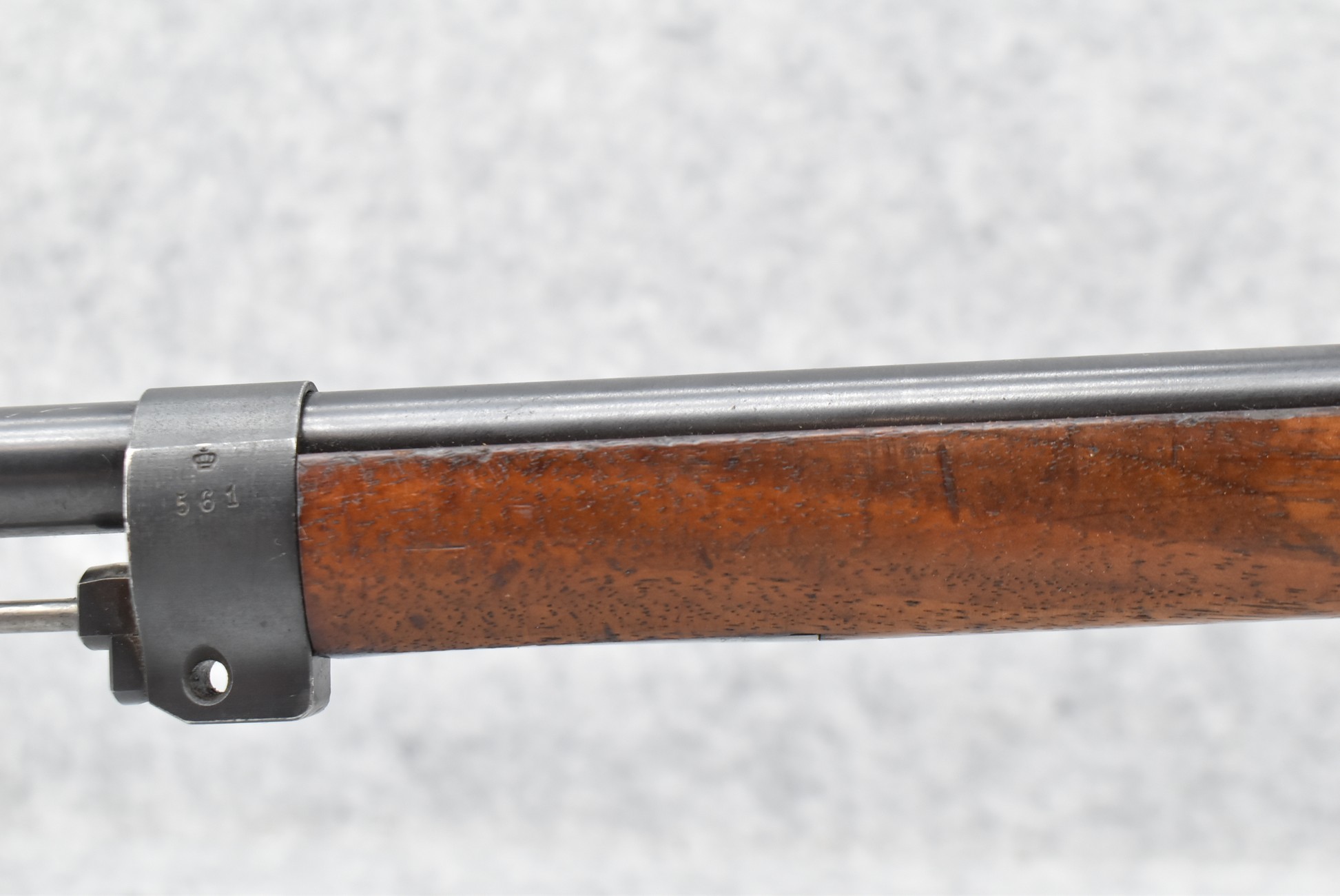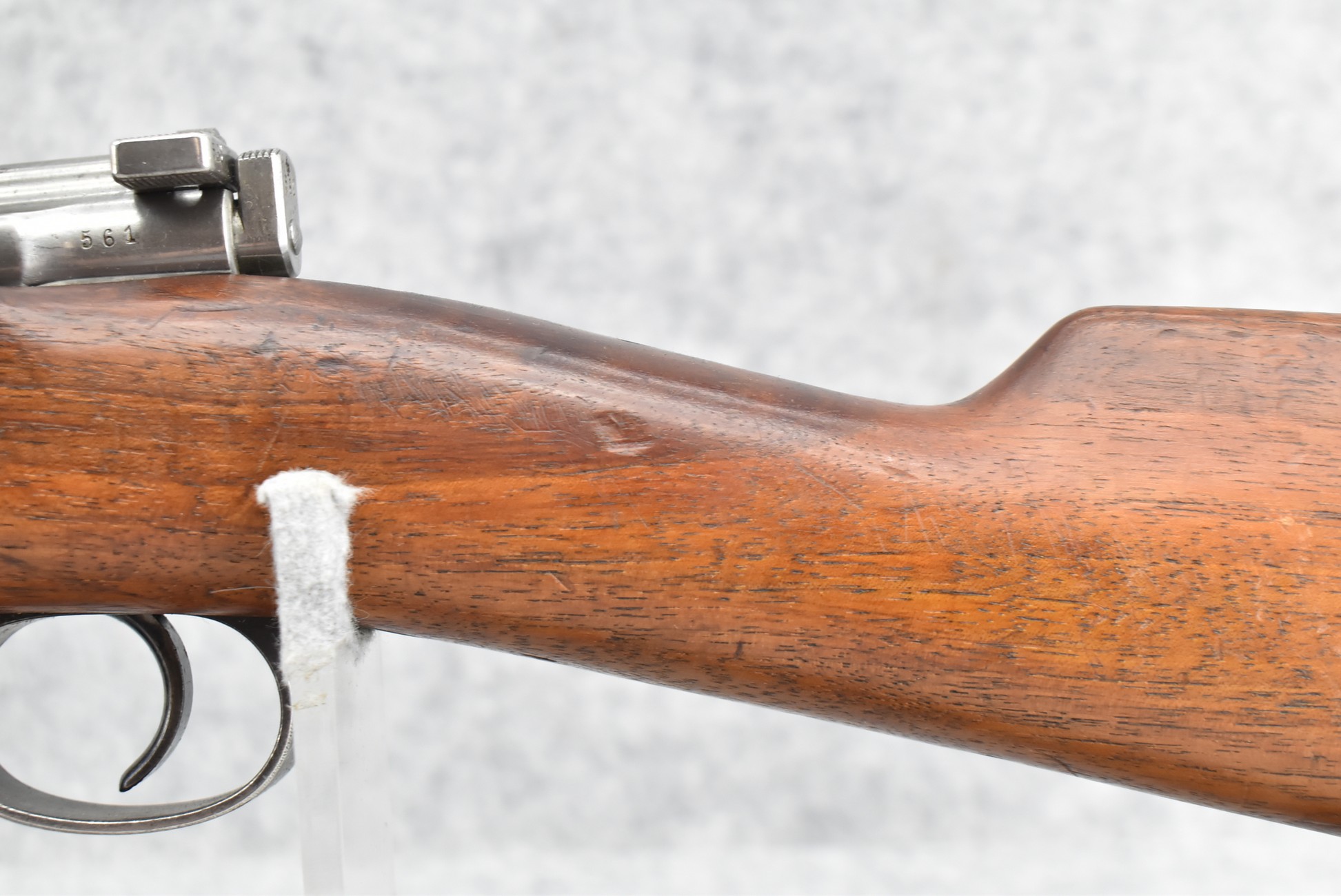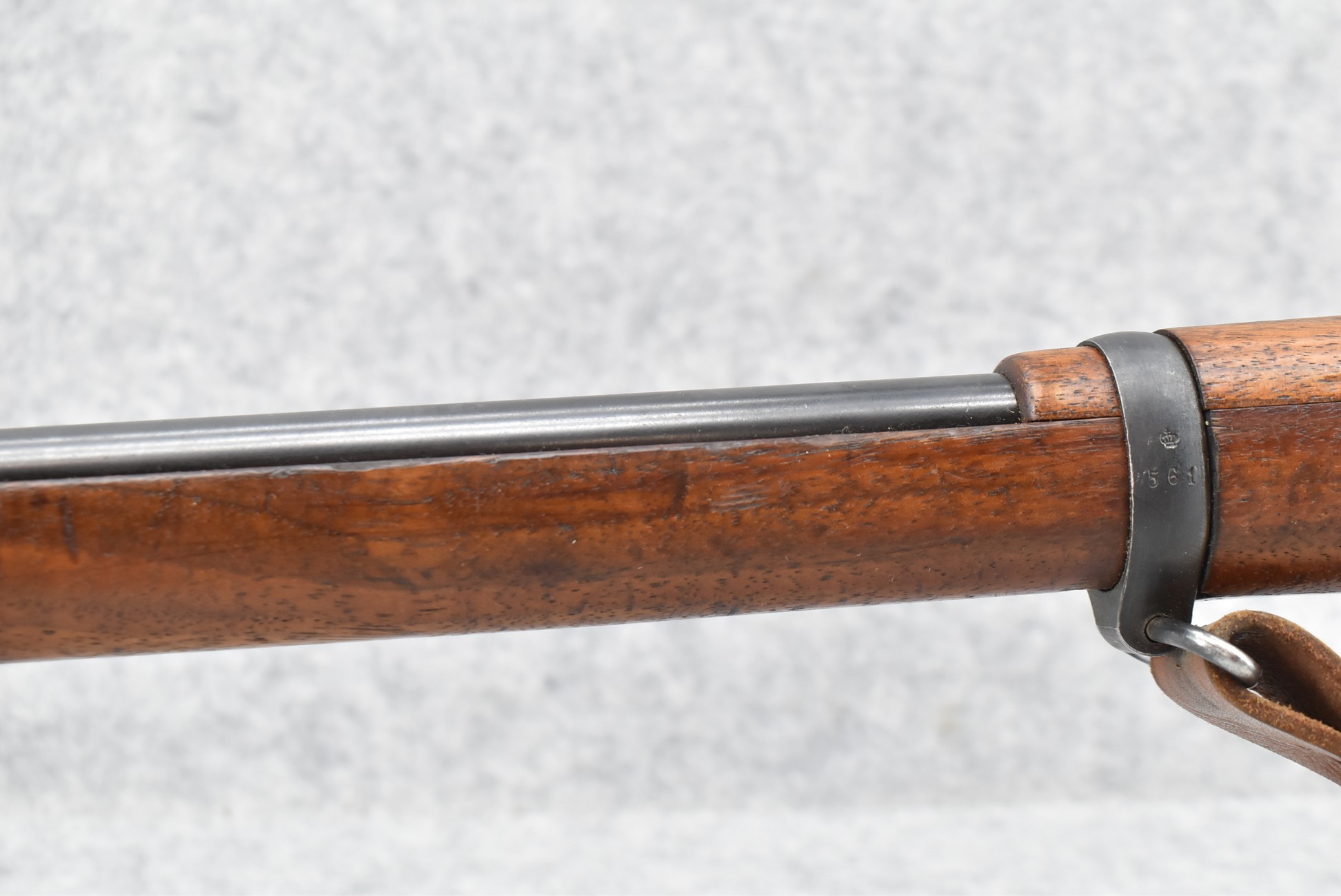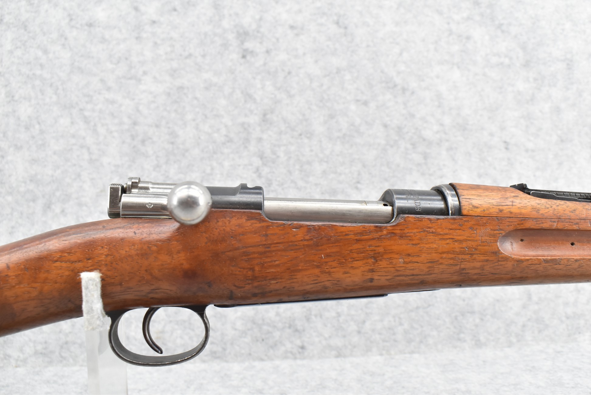 64R. Carl Gustafs – Mod. Mauser 96 – 6.5×55 Cal. Bolt Action Rifle – w/30” Barrel w/Blade Front and Adjustable Rear Ladder Sights – Blued Finish – w/Full Straight Grip Wood Stock w/Metal Butt Plate – w/Cleaning Rod – w/Bayonet Lug – w/Leather Sling – All Numbers are Matching – Import Marked – Dated 1905