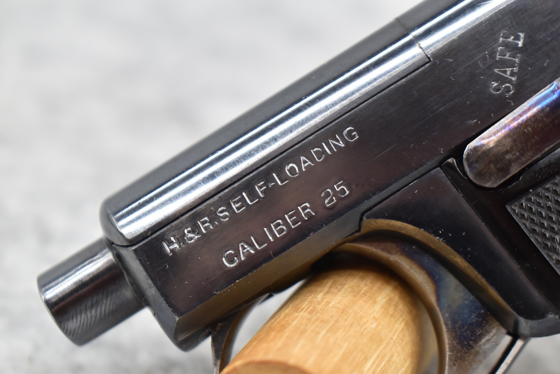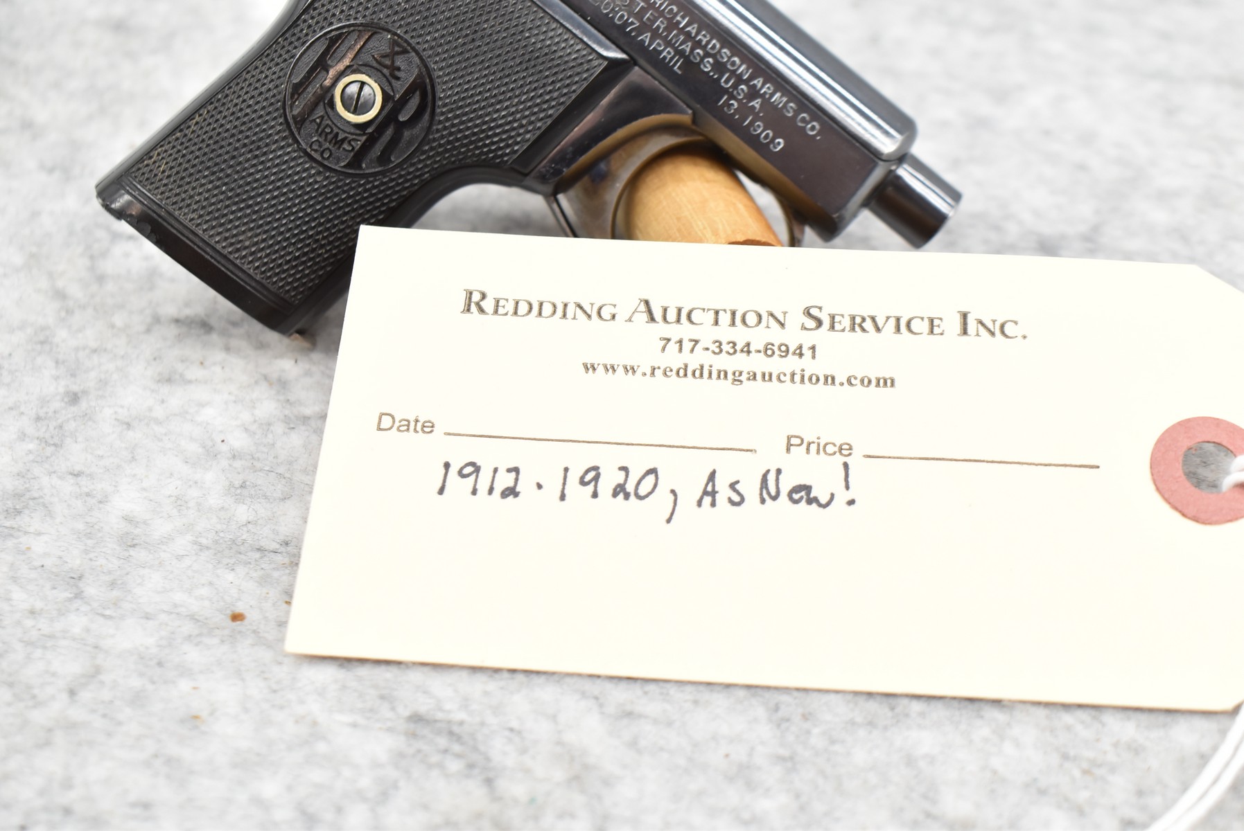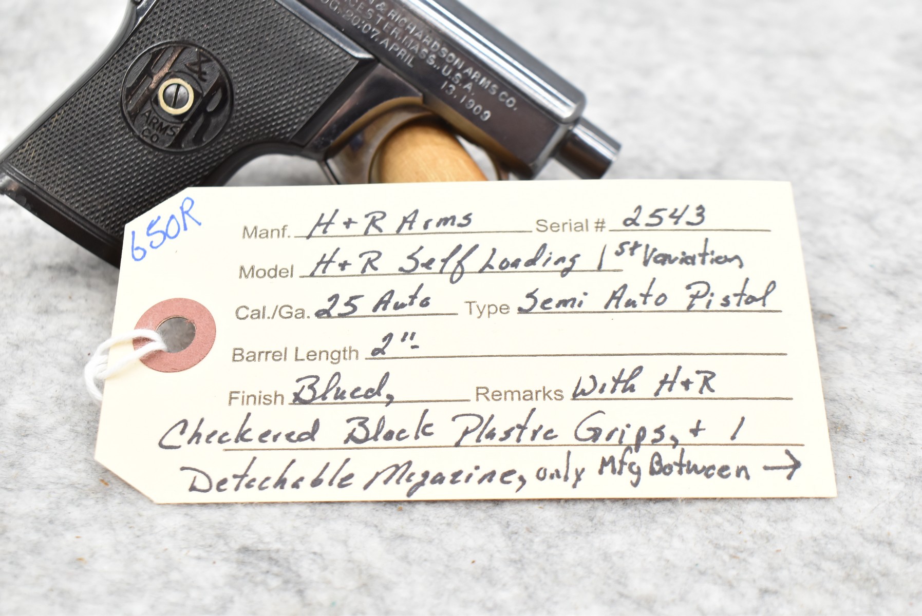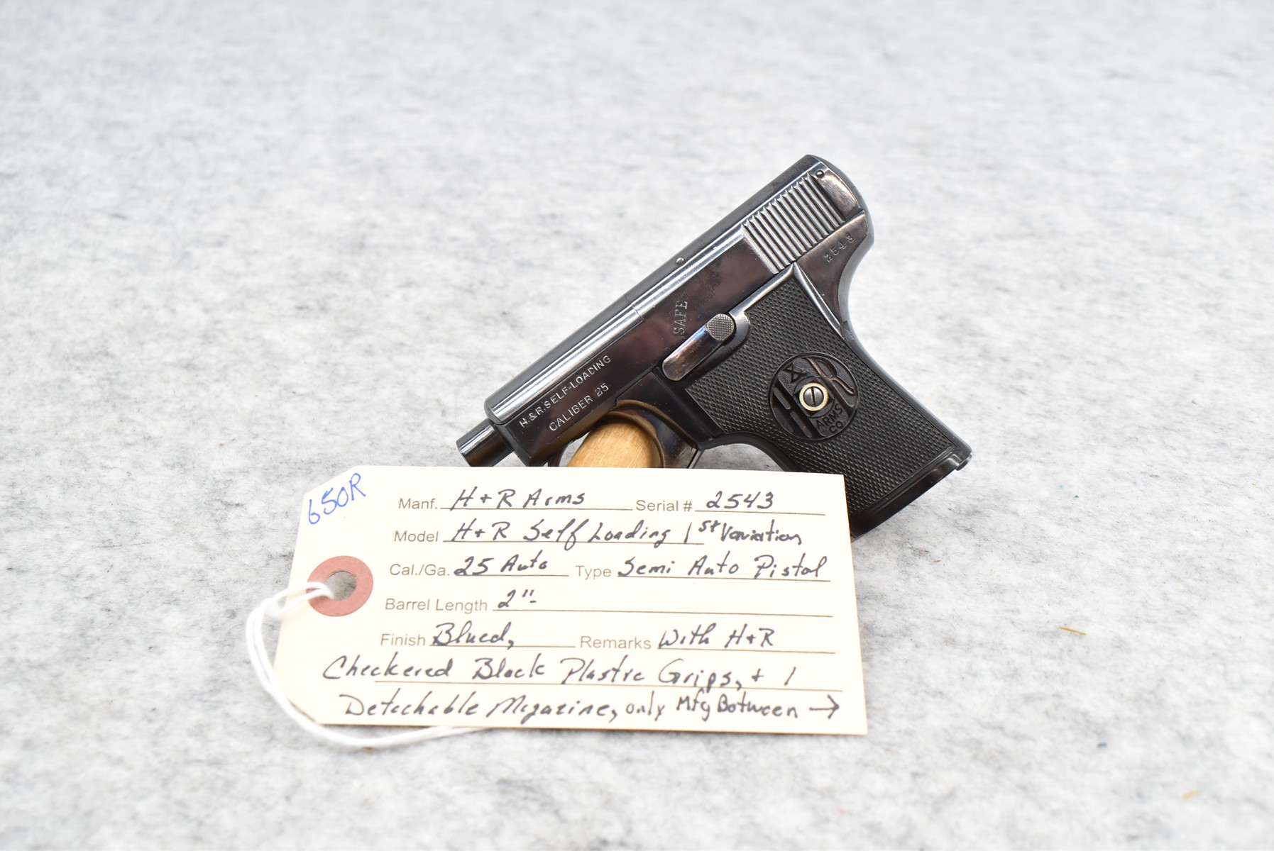 650R. H. & R. Arms – Mod. H&R Self Loading 1st Variation – 25 Auto Cal. Semi-Auto Pistol – w/2” Barrel – Blued Finish – w/H&R Checkered Black Plastic Grips – w/Detachable Magazine – Only Mfg. Between 1912-1920 – As New!