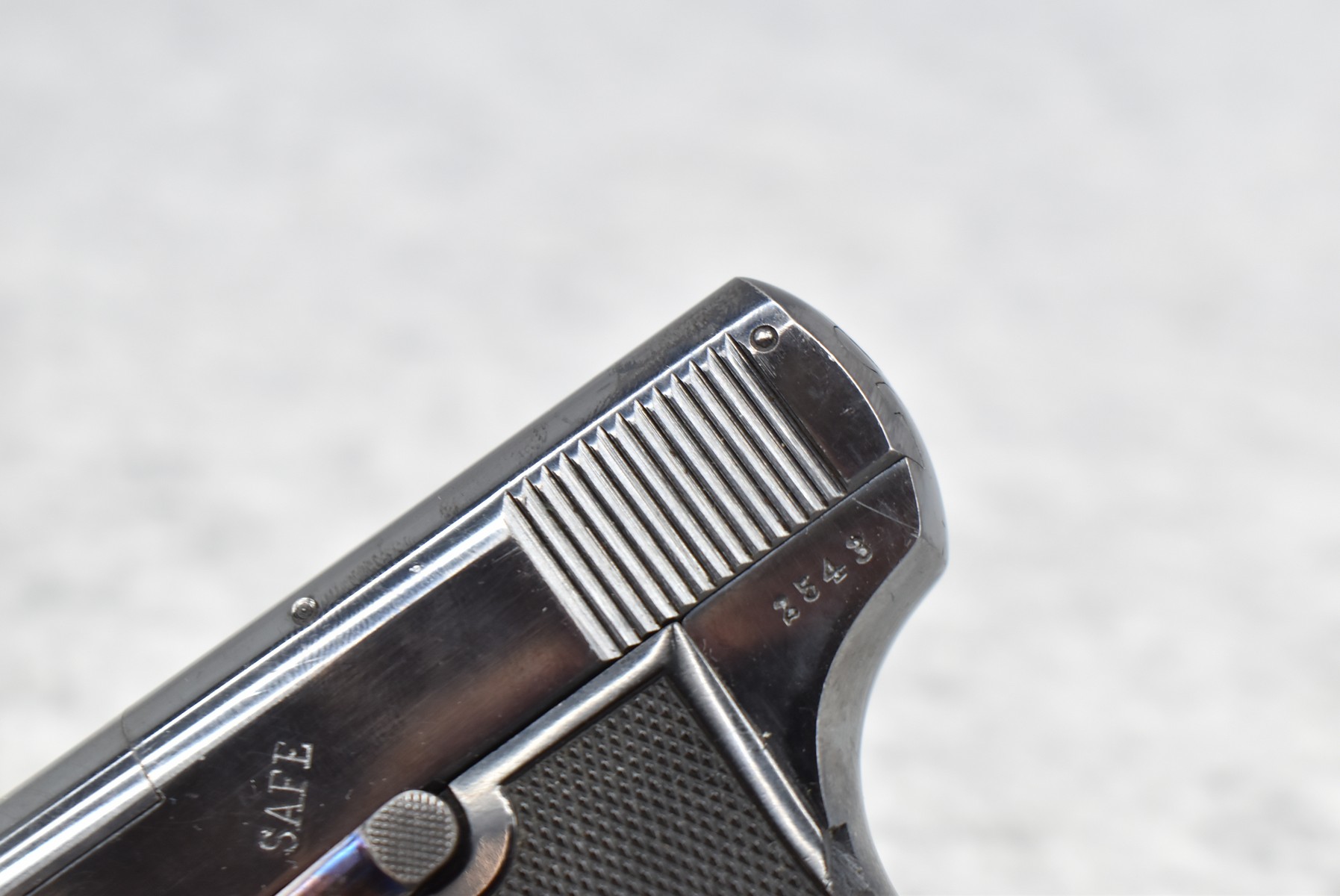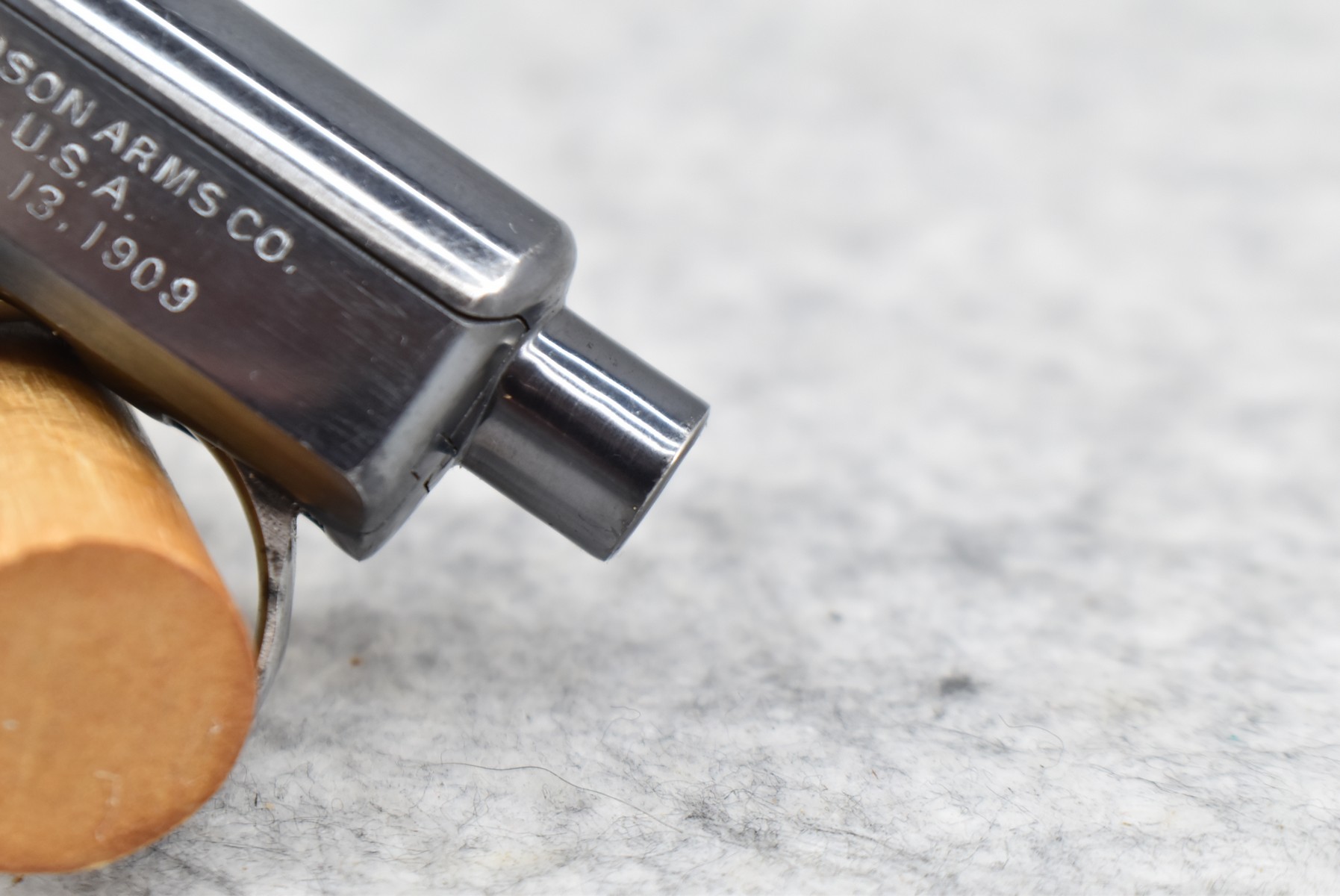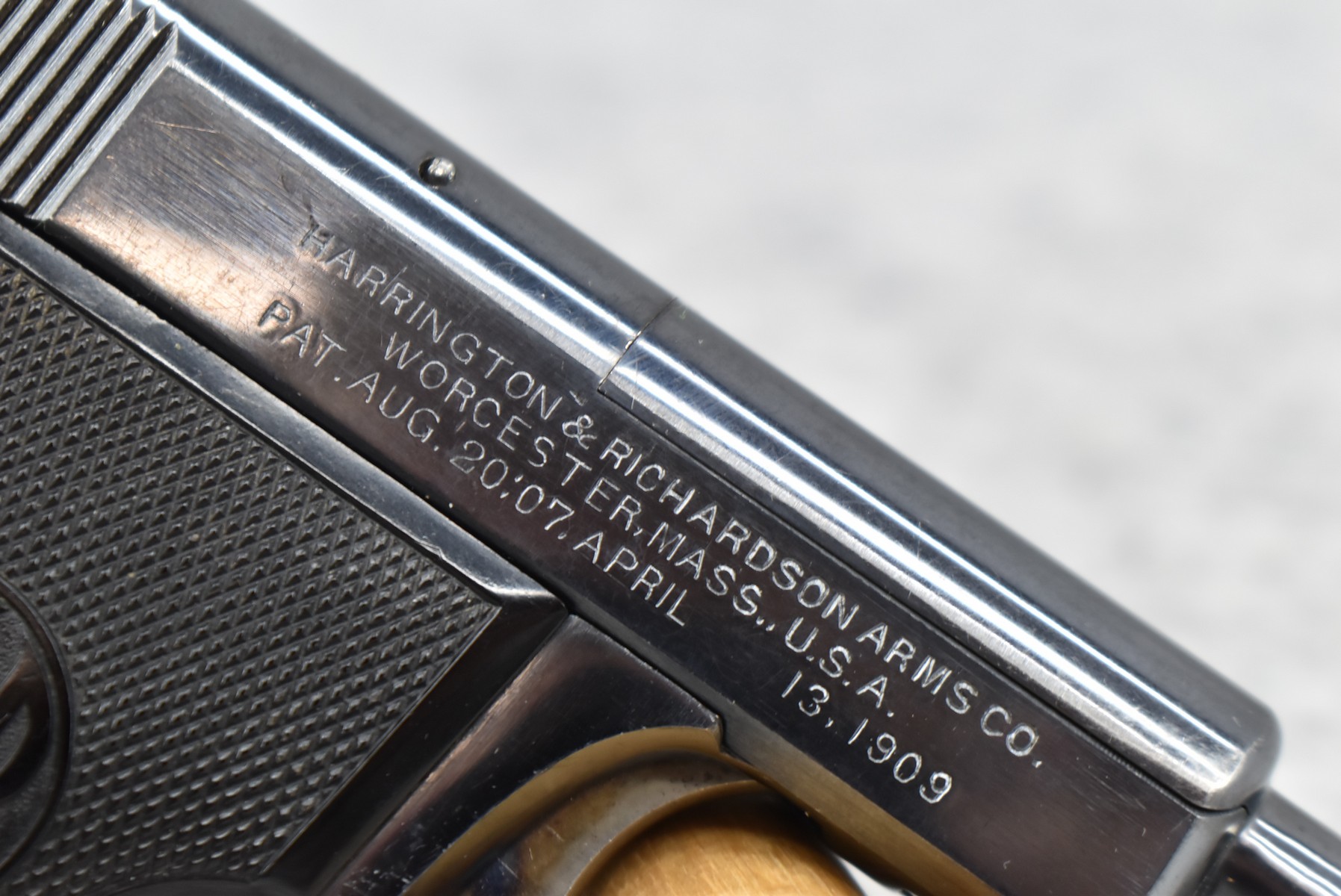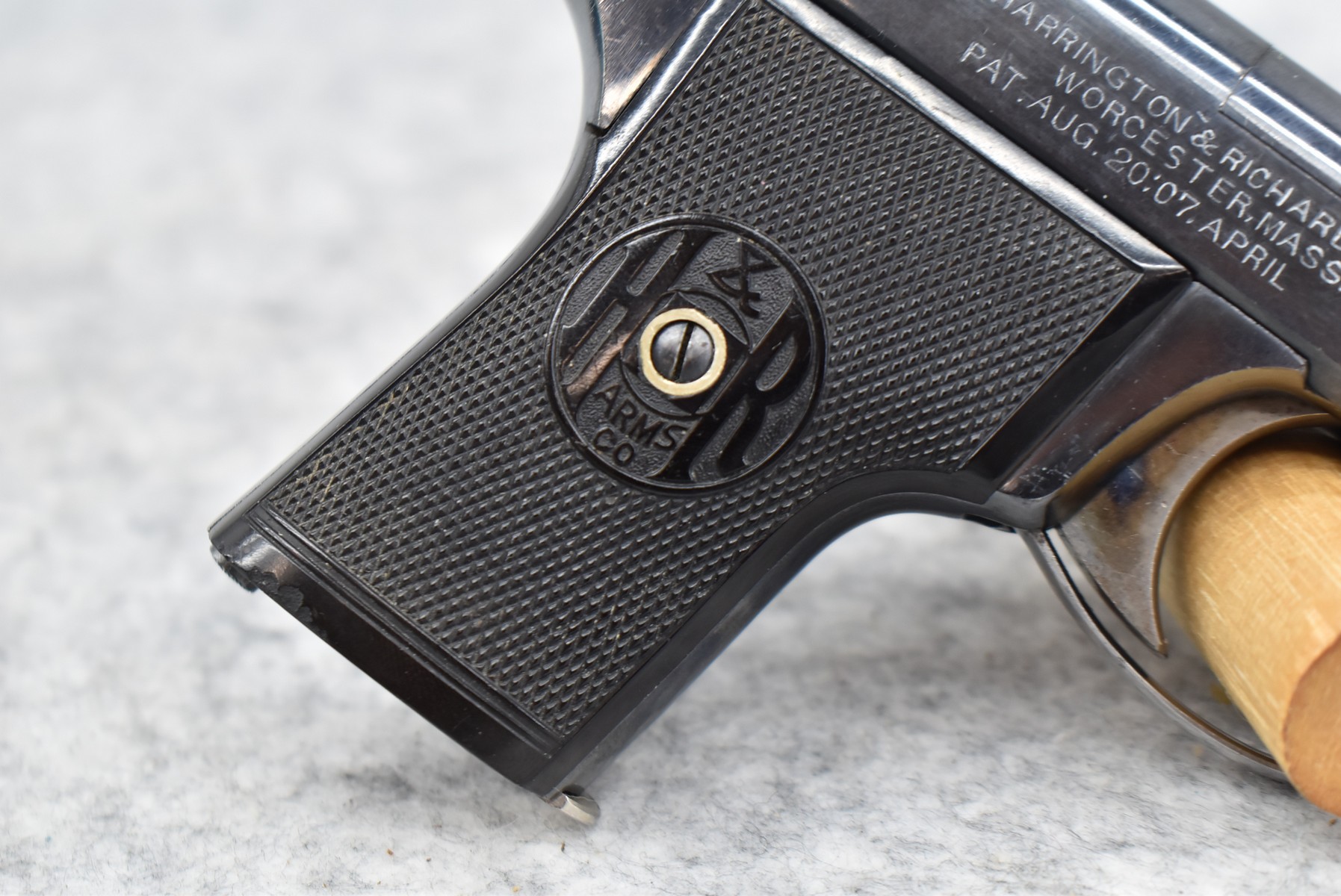 650R. H. & R. Arms – Mod. H&R Self Loading 1st Variation – 25 Auto Cal. Semi-Auto Pistol – w/2” Barrel – Blued Finish – w/H&R Checkered Black Plastic Grips – w/Detachable Magazine – Only Mfg. Between 1912-1920 – As New!