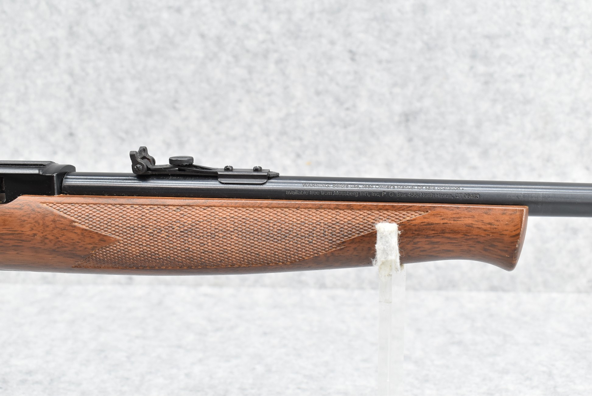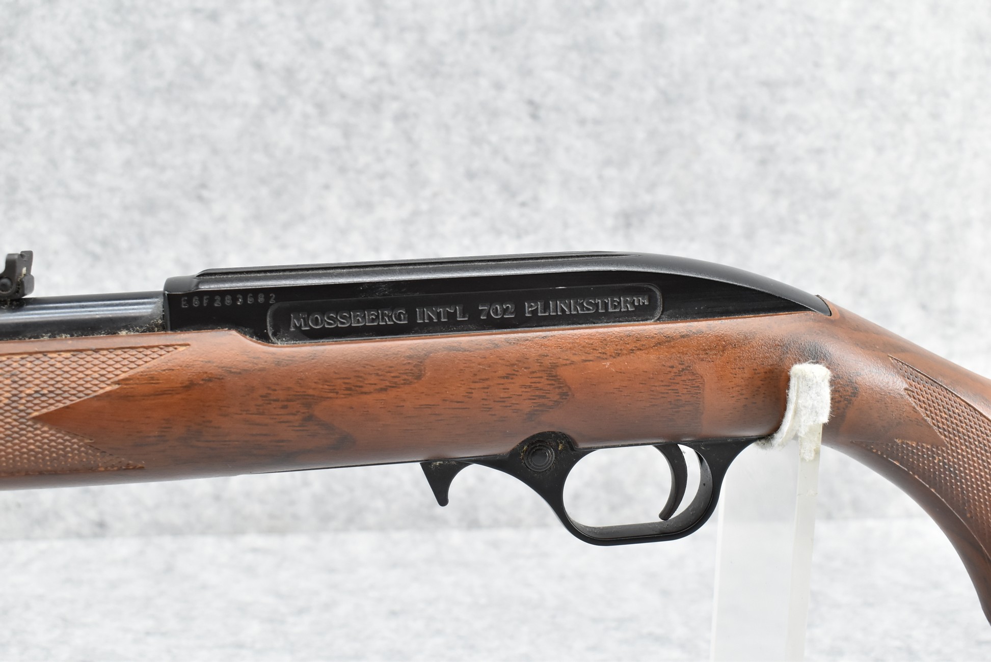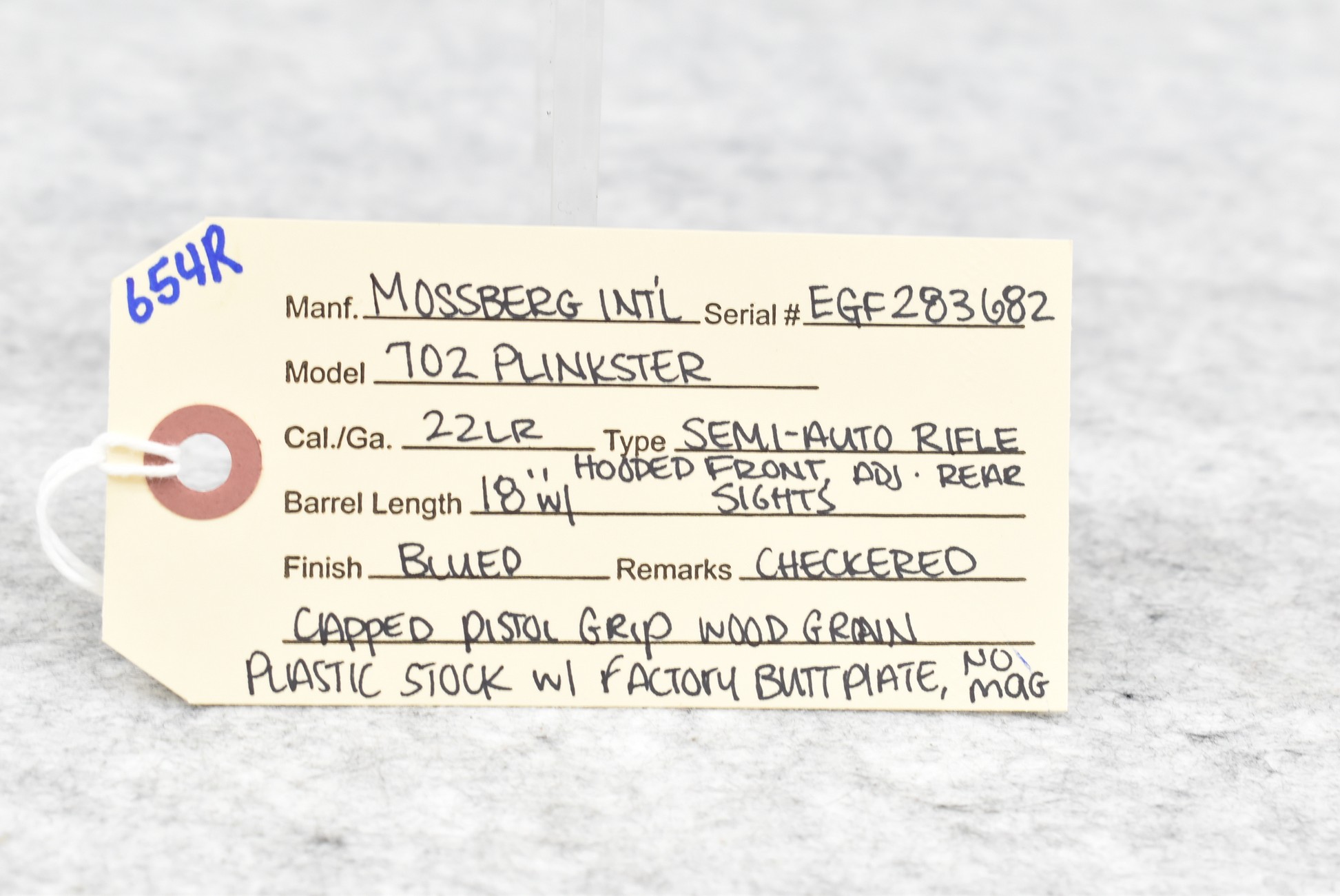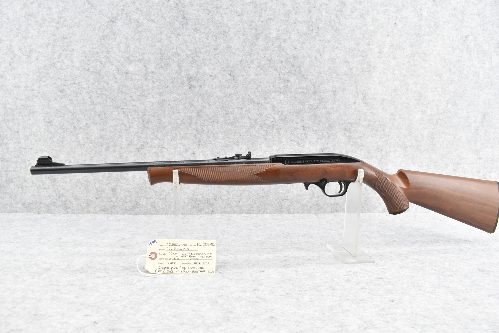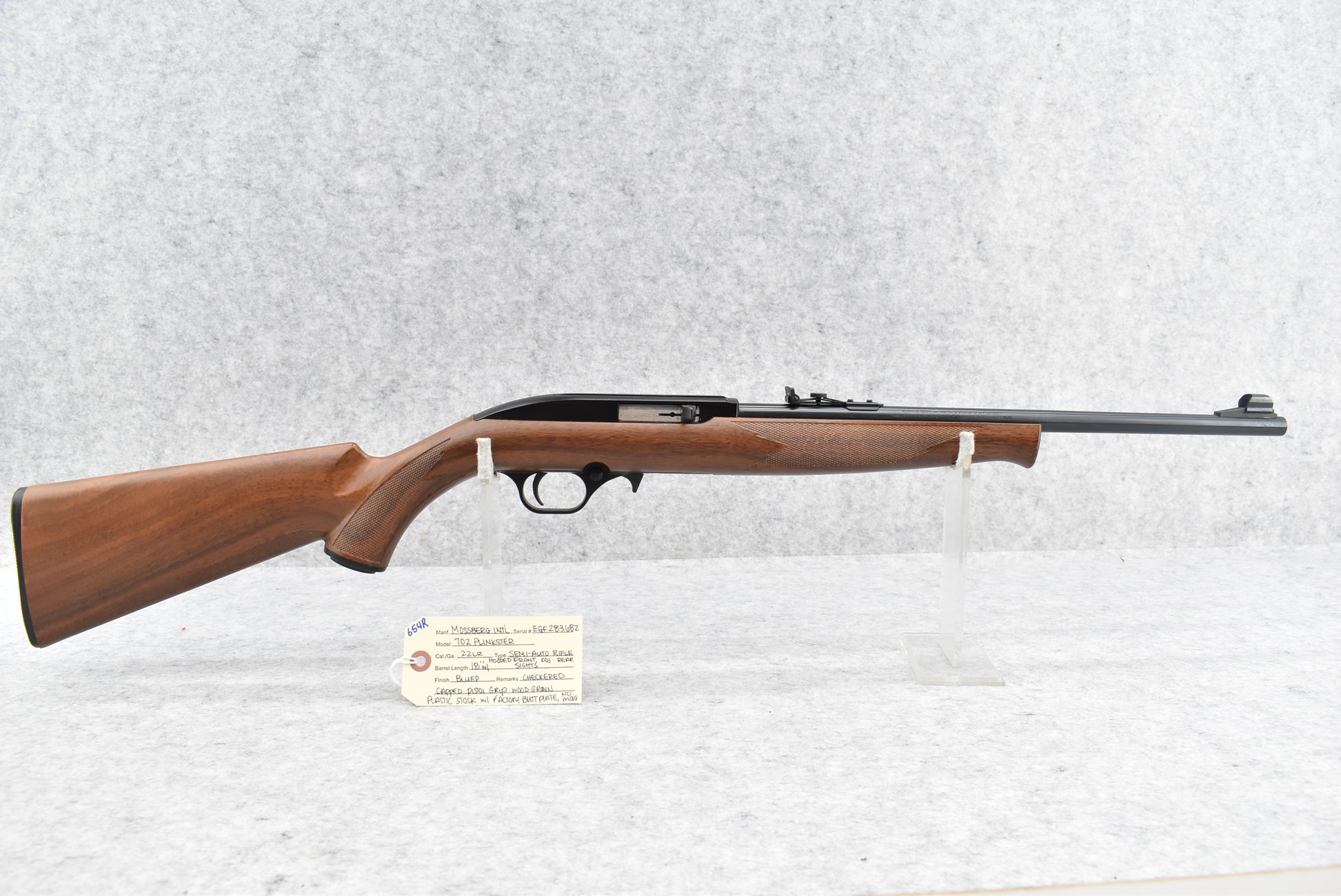 654R. Mossberg International – Mod. 702 Plinkster – 22LR Cal. Semi-Auto Rifle – w/18” Barrel w/Hooded Front and Adjustable Rear Sights – Blued Finish – w/Checkered Capped Pistol Grip Wood Grain Plastic Stock w/Factory Butt Plate – No Magazine