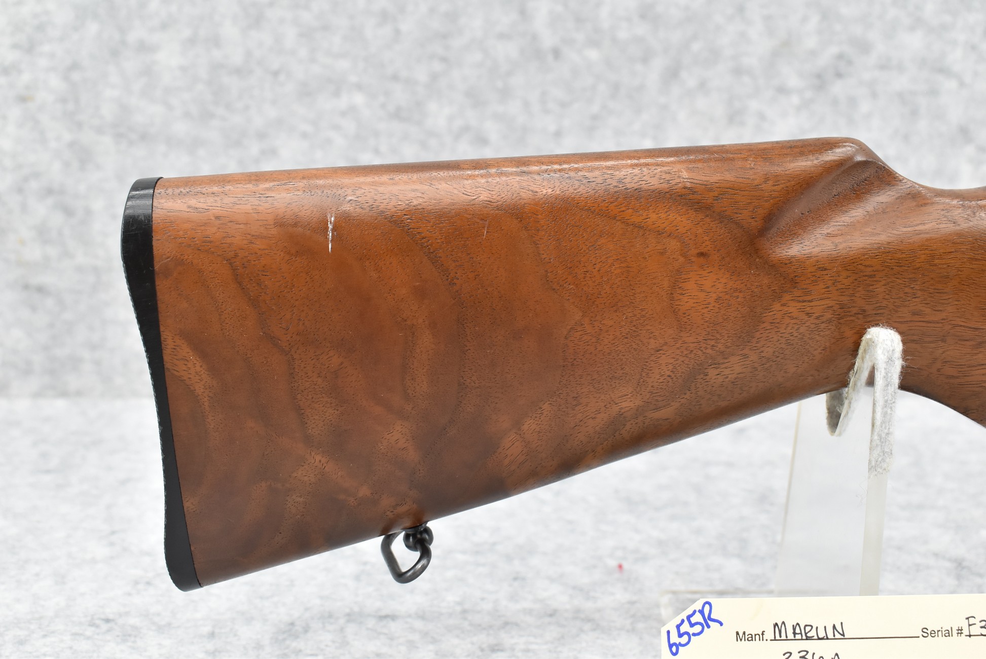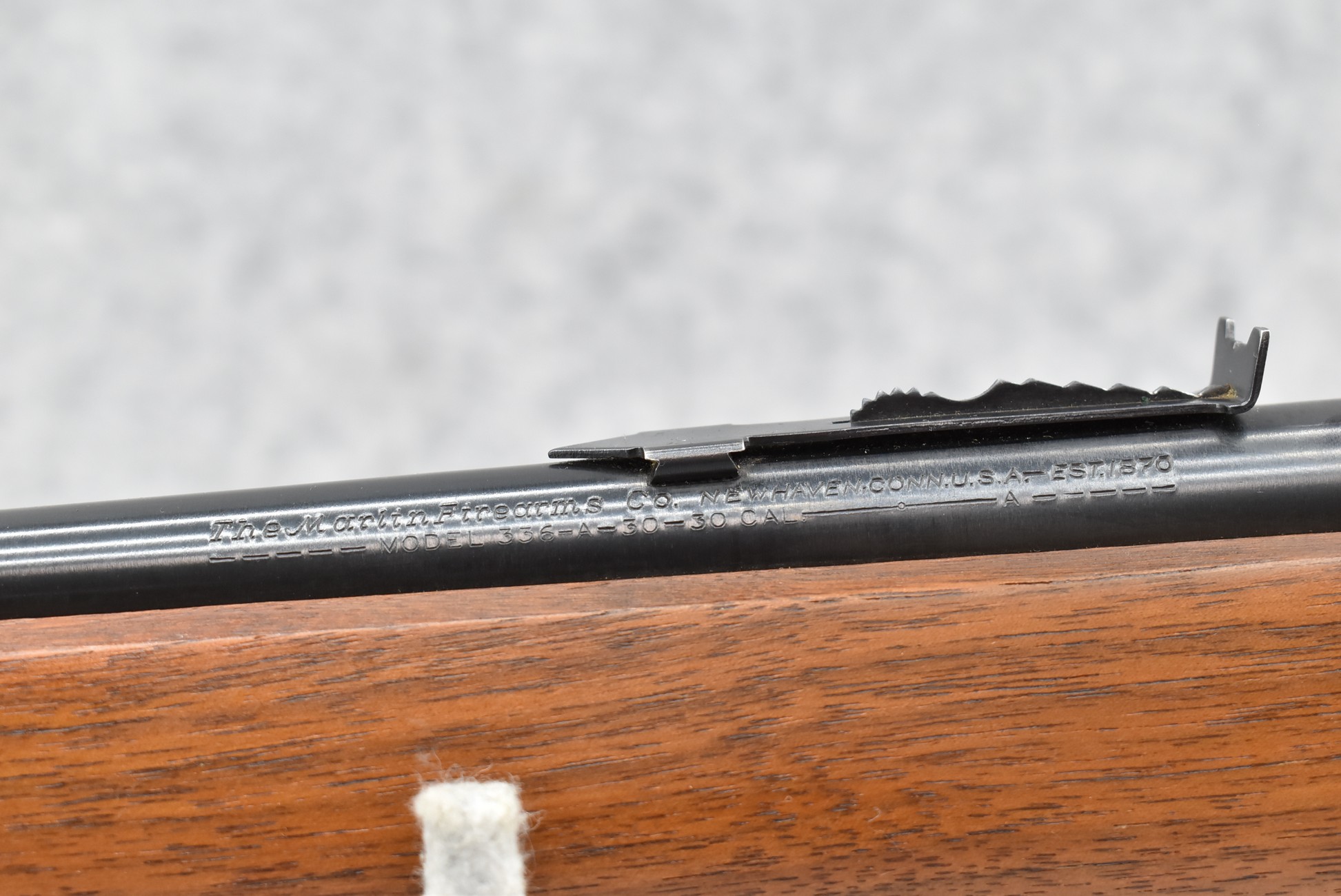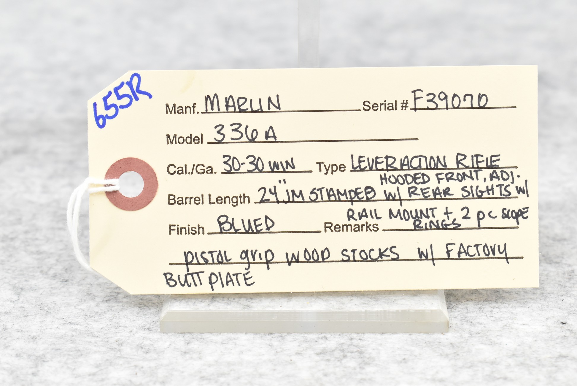 655R. Marlin – Mod. 336A – 30-30 Win. Cal. Lever Action Rifle – w/24” JM Stamped Barrel w/Hooded Front and Adjustable Rear Sights – Blued Finish – w/Pistol Grip Wood Stocks w/Factory Butt Plate – w/Rail Mount and 2-Piece Scope Rings