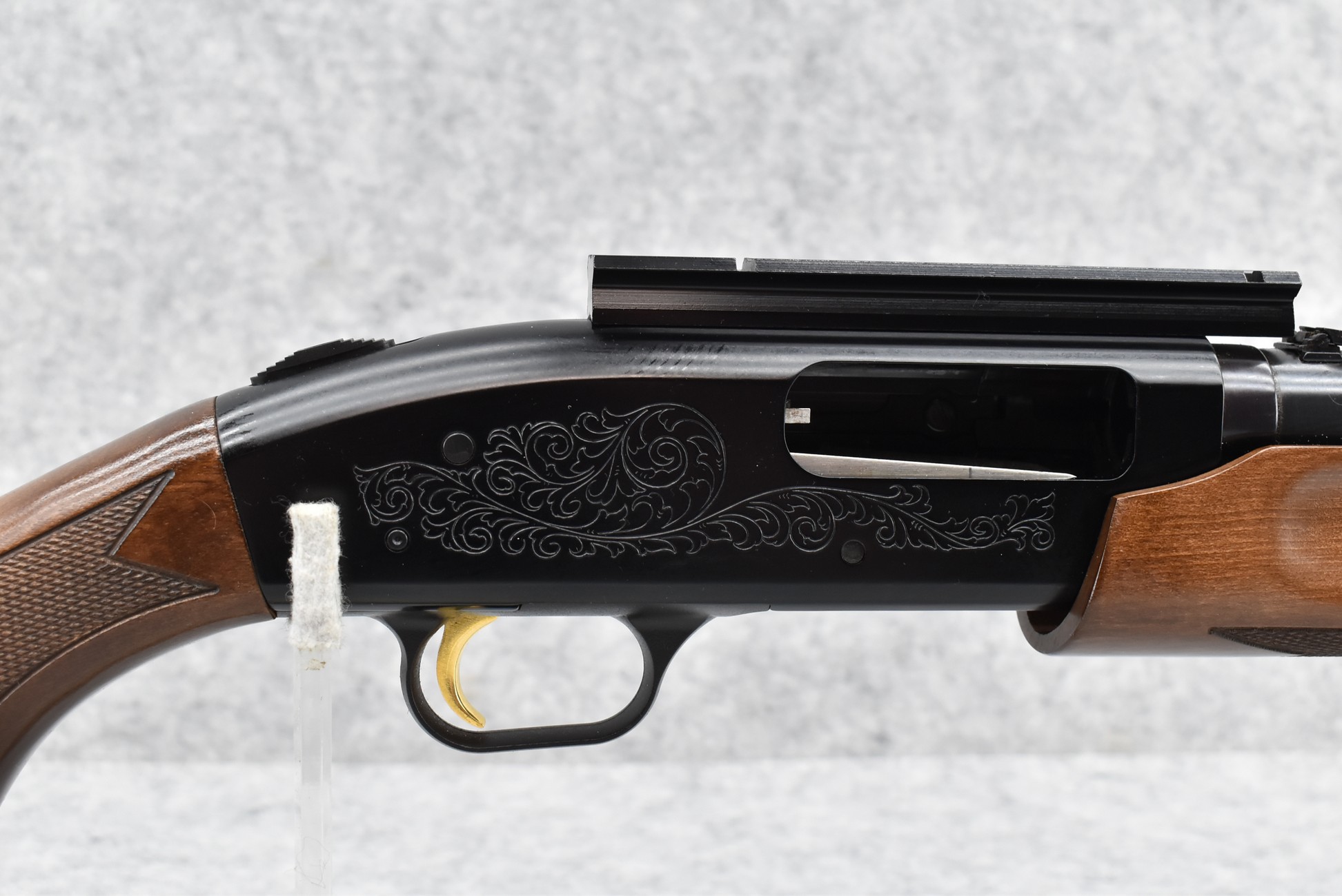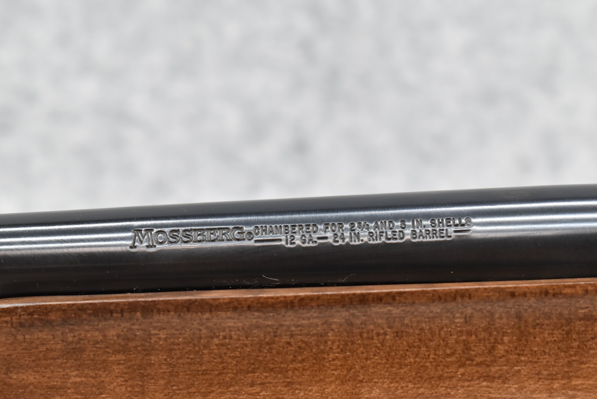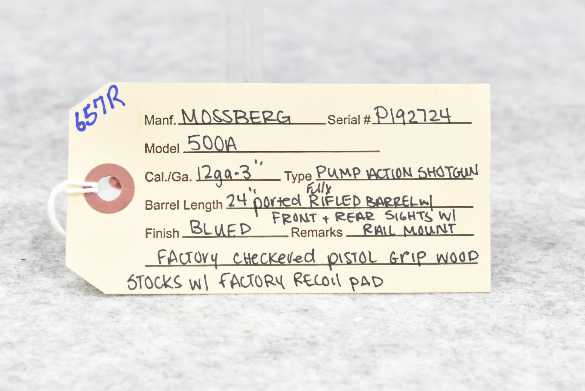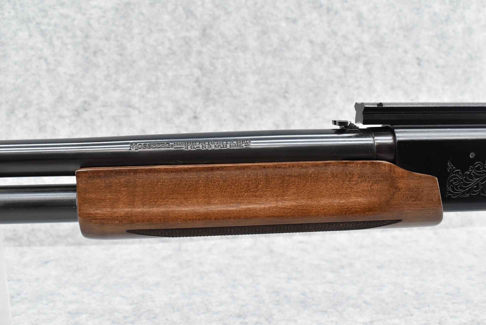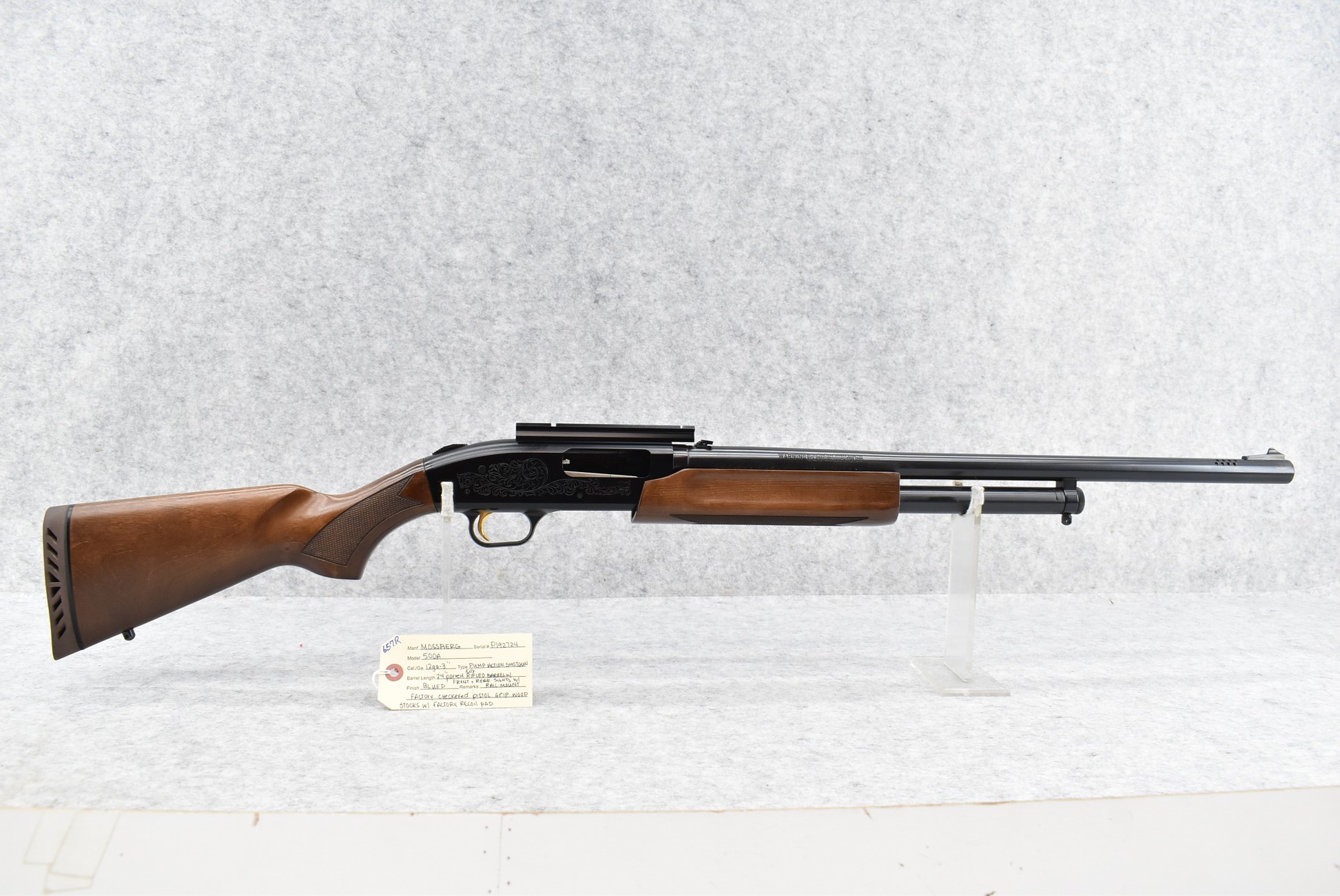 657R. Mossberg – Mod. 500A – 12ga. 3” Pump Action Shotgun – w/24” Ported, Fully Rifled Barrel w/Front and Rear Sights – Blued Finish – w/Factory Checkered Pistol Grip Wood Stocks w/Factory Recoil Pad – w/Rail Mount