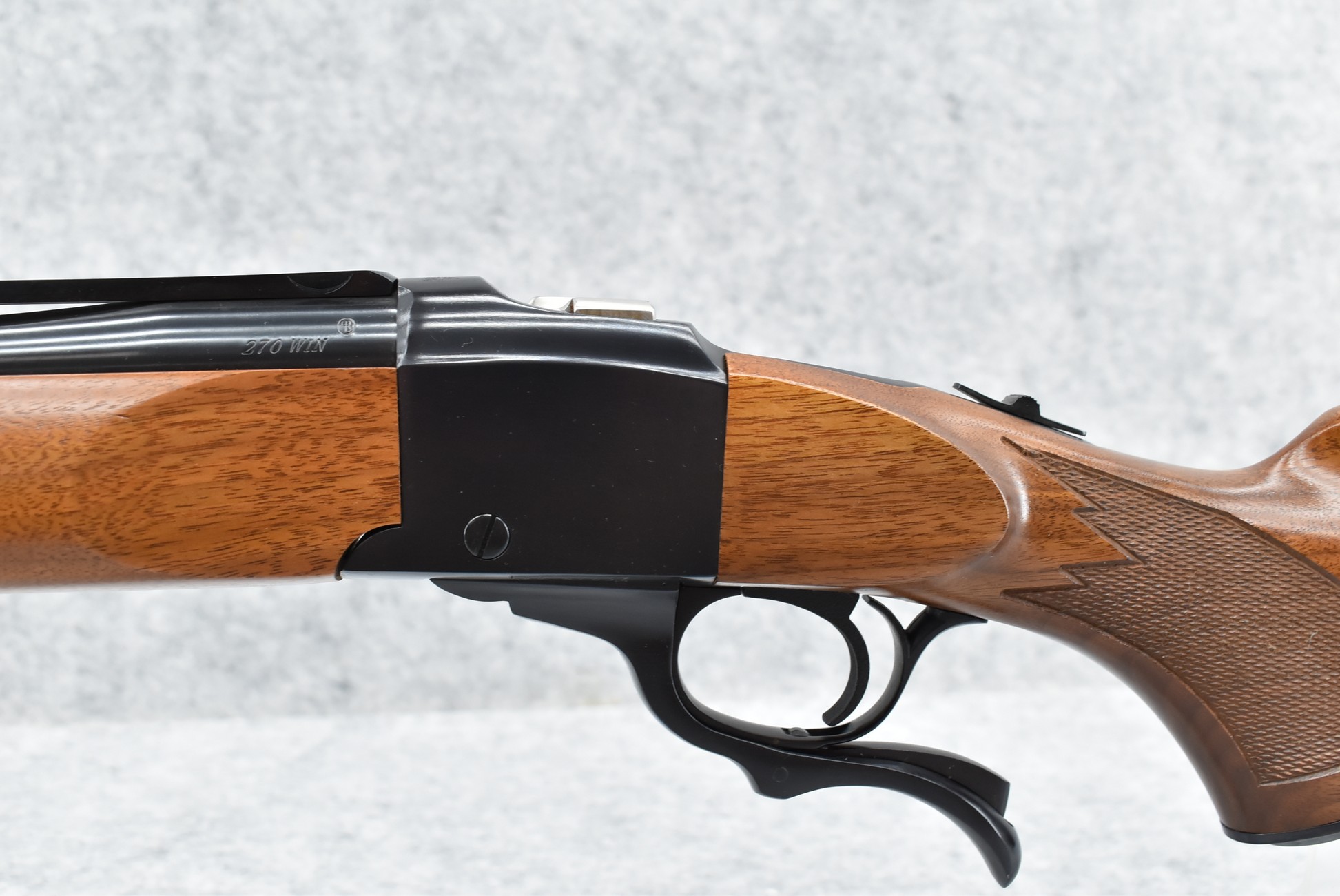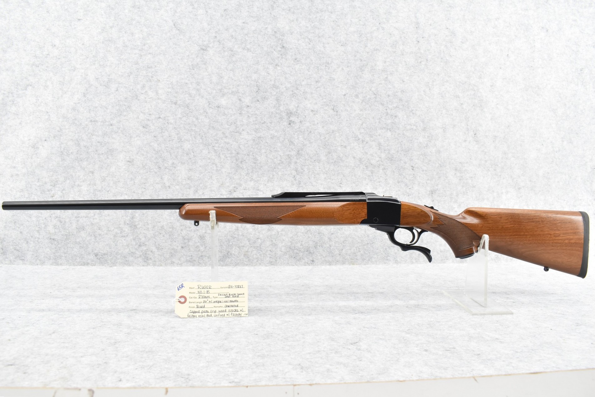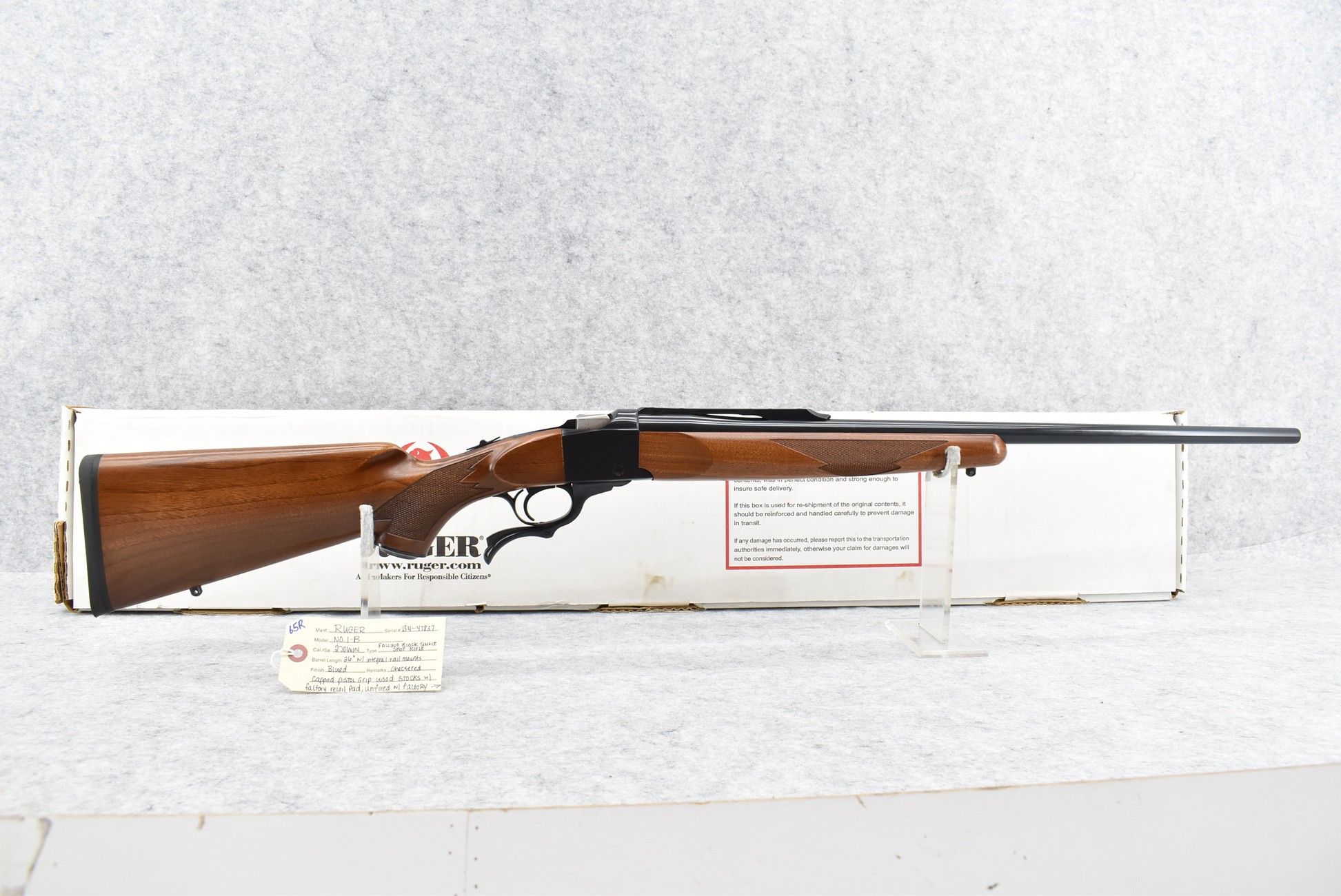 65R. Ruger – Mod. No. 1 B – 270 Win. Cal. Single Shot Falling Block Rifle – w/26” Barrel w/Integral Rail Mount – Blued Finish – w/Checkered Capped Pistol Grip Wood Stocks w/Factory Recoil Pad – Unfired w/Factory Box, Manual, and Factory Set of Rings