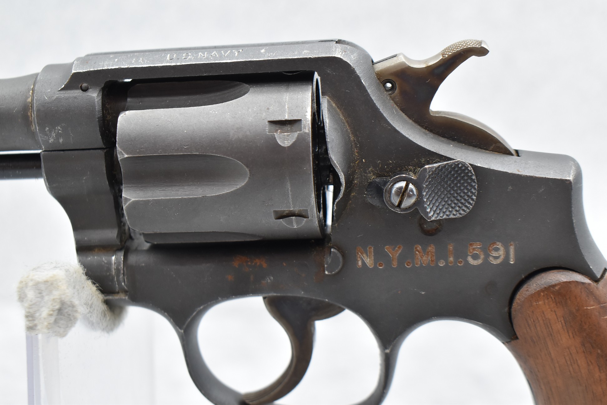 663R. Smith & Wesson – Victory Model (U.S. Navy) – 38 S&W Spl. Cal. Double Action Revolver – w/4” Barrel w/Round Blade Front & Groove Rear Sights – Parkerized Finish – w/Factory Plain Wood Grips – w/Lanyard Ring – “U.S. Navy” Marked on Top of Frame – Left Side of Frame Marked N.Y.M.I 591” for Naval Yard Mare Island, Rack #591