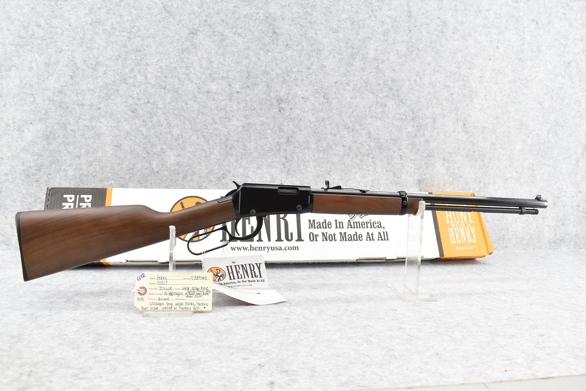 664R. Henry – Mod. H001T – 22 Cal. Lever Action Rifle – w/20” Octagon Barrel w/Blade Front and Adjustable Rear Semi-Buckhorn Sights – Blued Finish – w/Straight Grip Wood Stocks w/Factory Butt Plate – Unfired w/Factory Box Manual, and Hang Tag