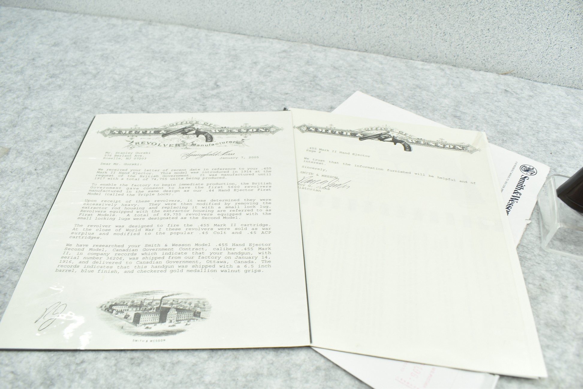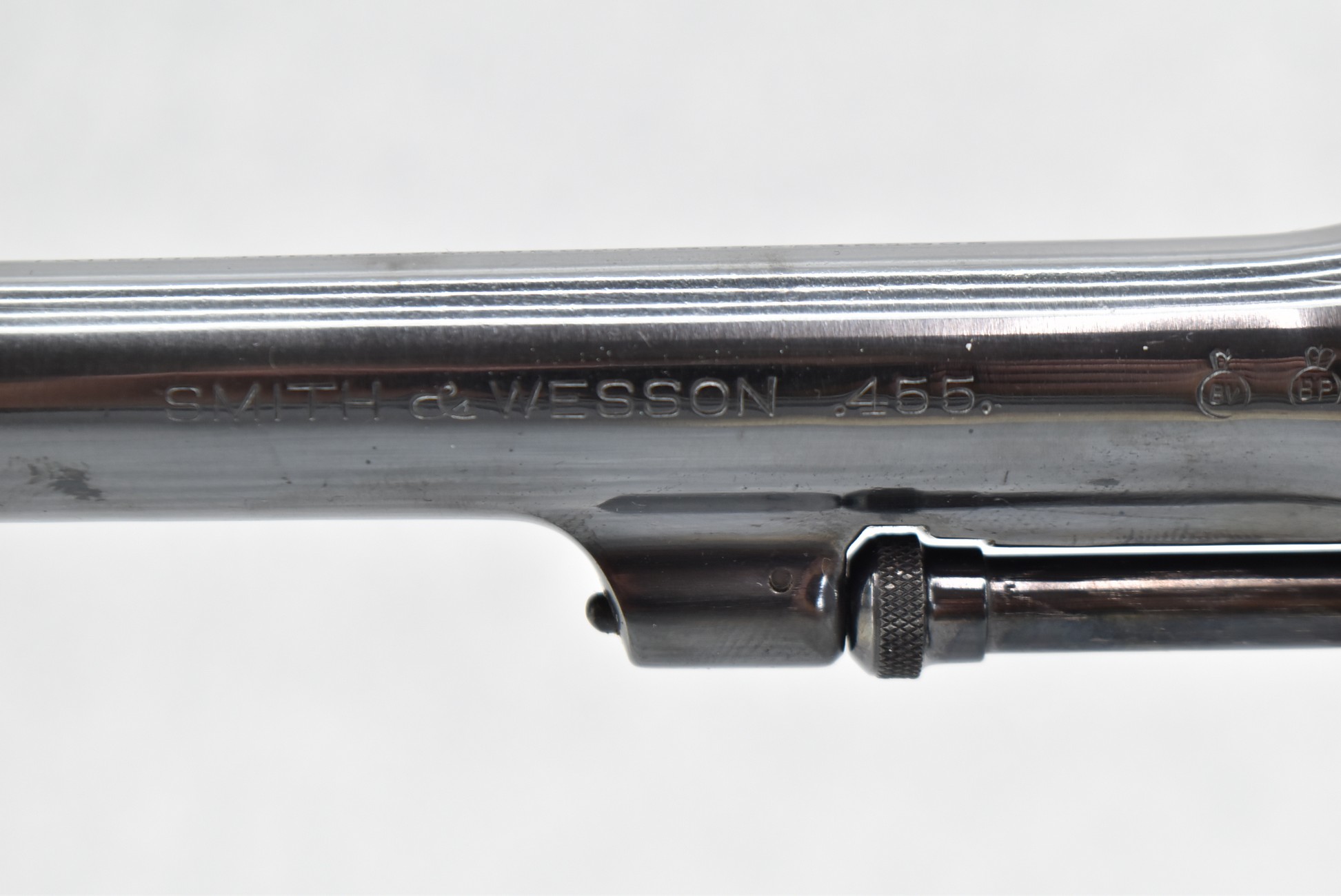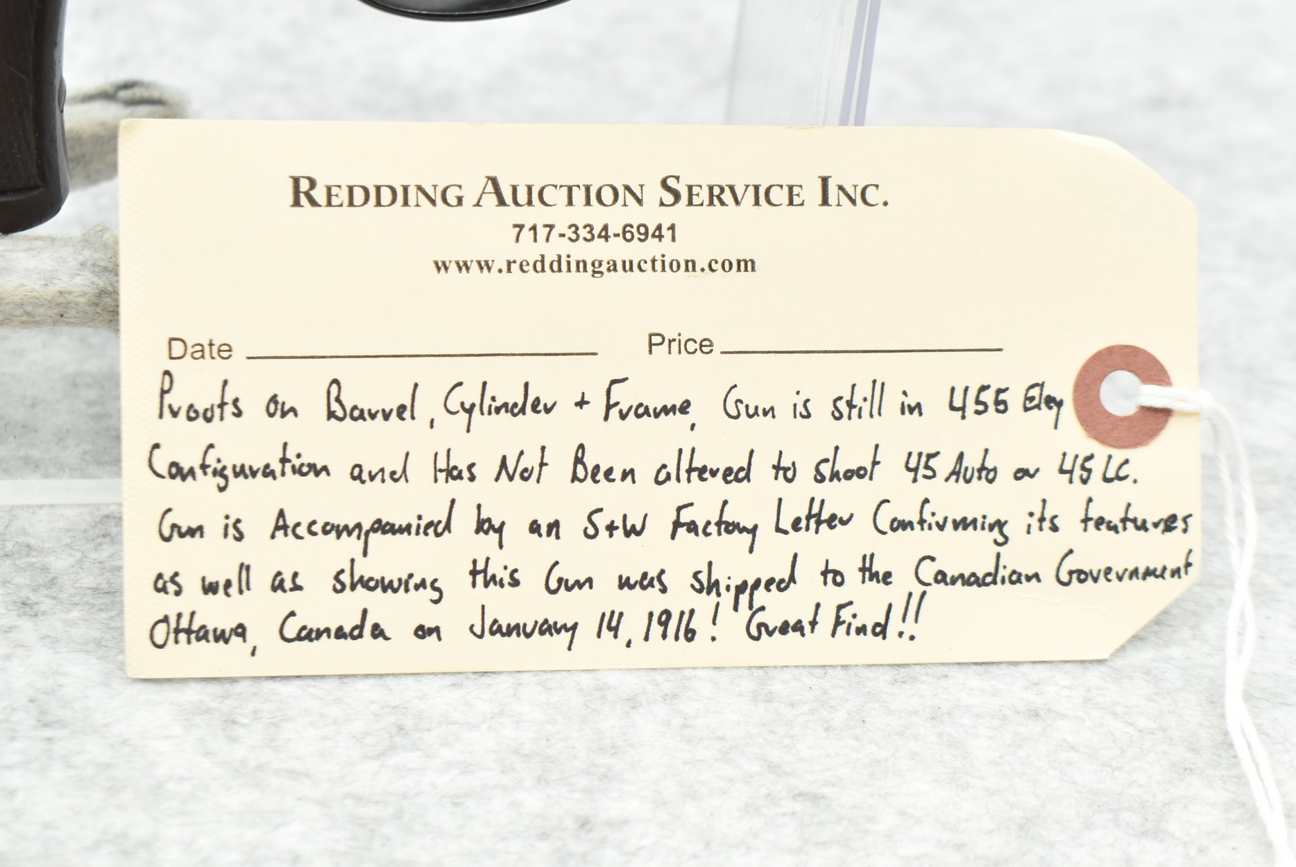 665R. Smith & Wesson – Mod. .455 Mark II Hand Ejector (Canadian Government Contract) – 455 Eley Cal. Double Action Revolver – w/6 ½” Barrel w/Round Blade Front & Groove Rear Sights – Re-Blued Finish – w/Factory Diamond Checkered Walnut Grips w/S&W Medallion – Underside of Barrel, Butt & Cylinder Numbers All Match! – w/Birmingham Proofs on Barrel, Cylinder & Frame – Gun is Still in 455 Eley Configuration & Has Not Been Altered to Shoot 45 Auto or 45LC – Gun is Accompanied by a S&W Factory Letter Confirming its Features As Well As Showing This Gun Was Shipped to the Canadian Government, Ottawa, Canada on January 14, 1916! – Great Find!!