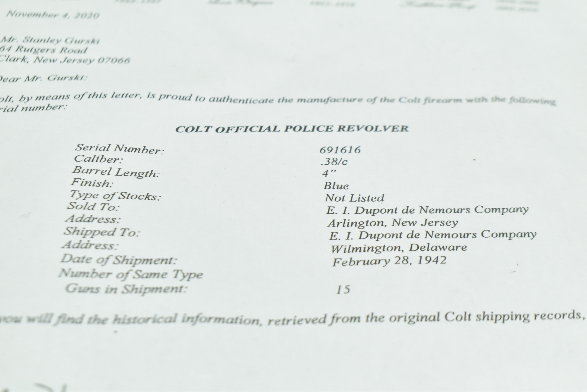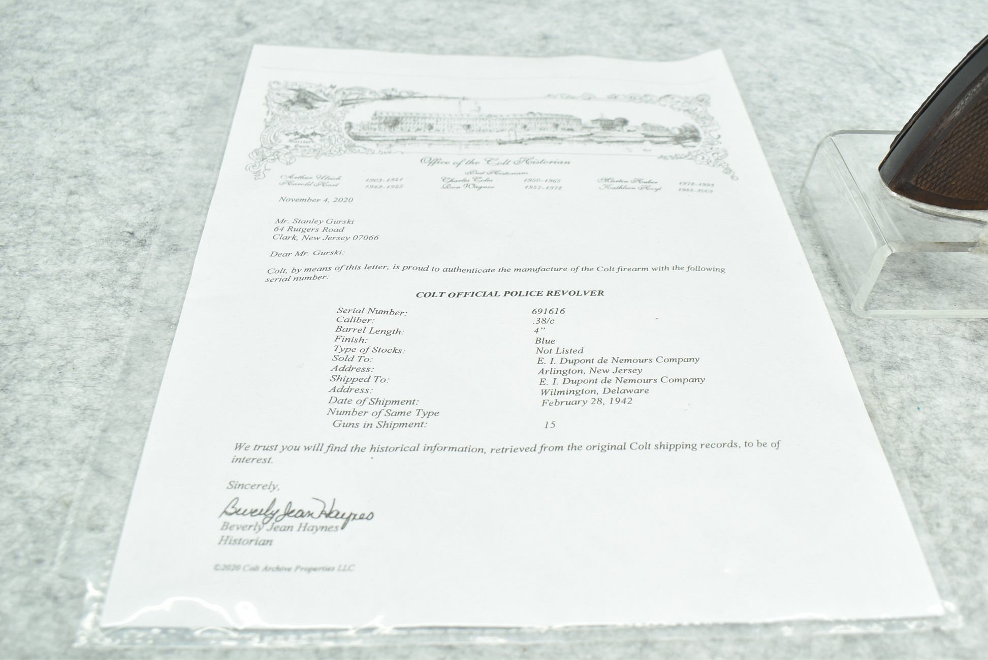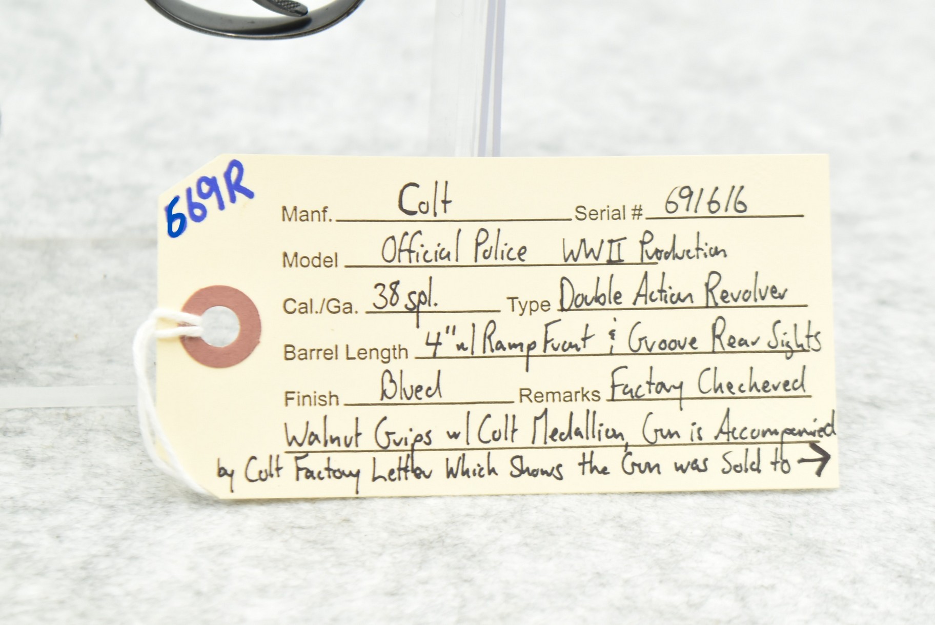 669R. Colt – Mod. Official Police (WWII Production) – 38 Spl. Cal. Double Action Revolver – w/4” Barrel w/Ramp Front & Groove Rear Sights – Blued Finish – w/Factory Checkered Walnut Grips w/Colt Medallion – Gun is Accompanied by Colt Factory Letter Which Shows the Gun Was Sold to E.I. DuPont de Nemours Co. & on February 28, 1942, it Was Shipped to E.I. DuPont in Wilmington, Delaware