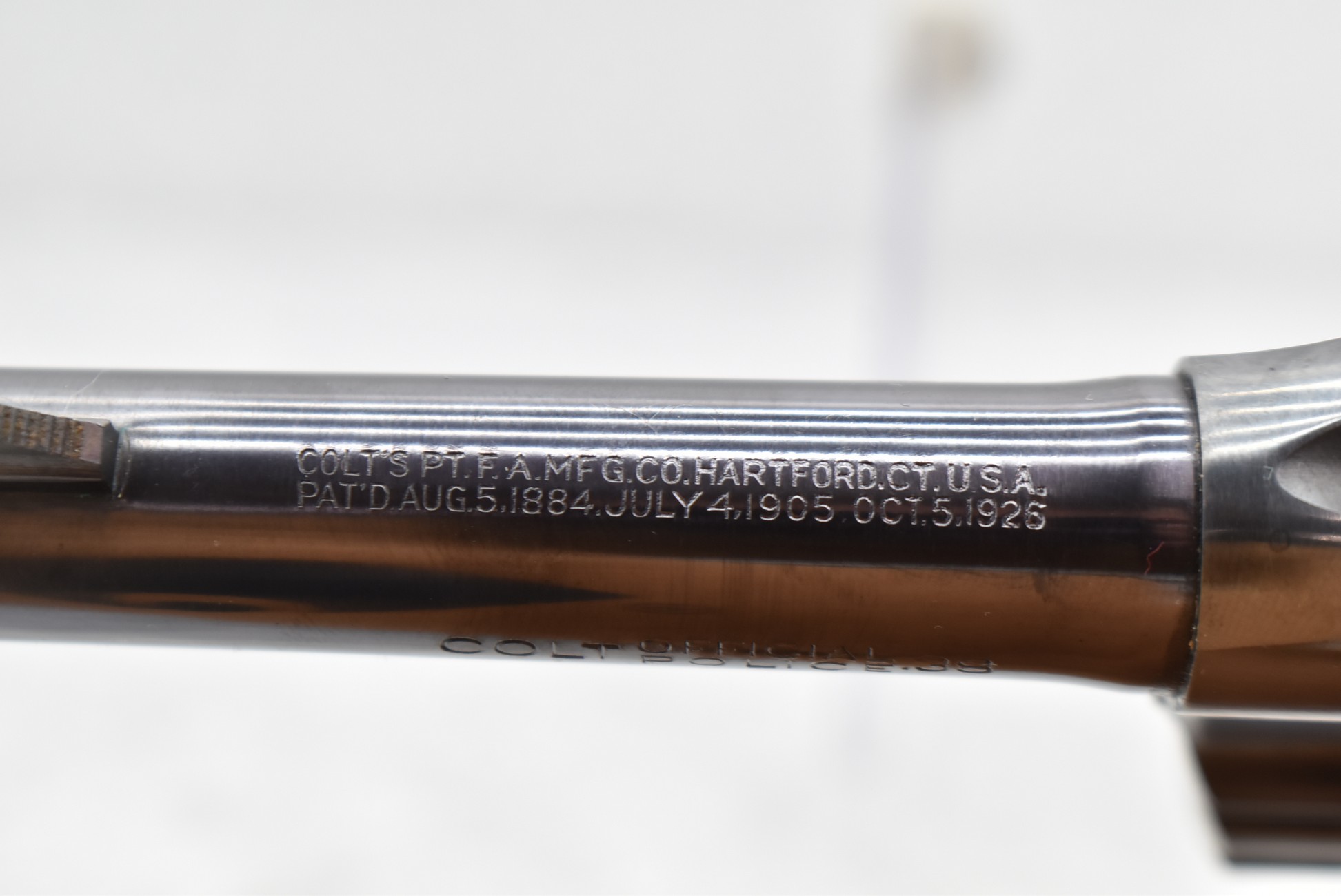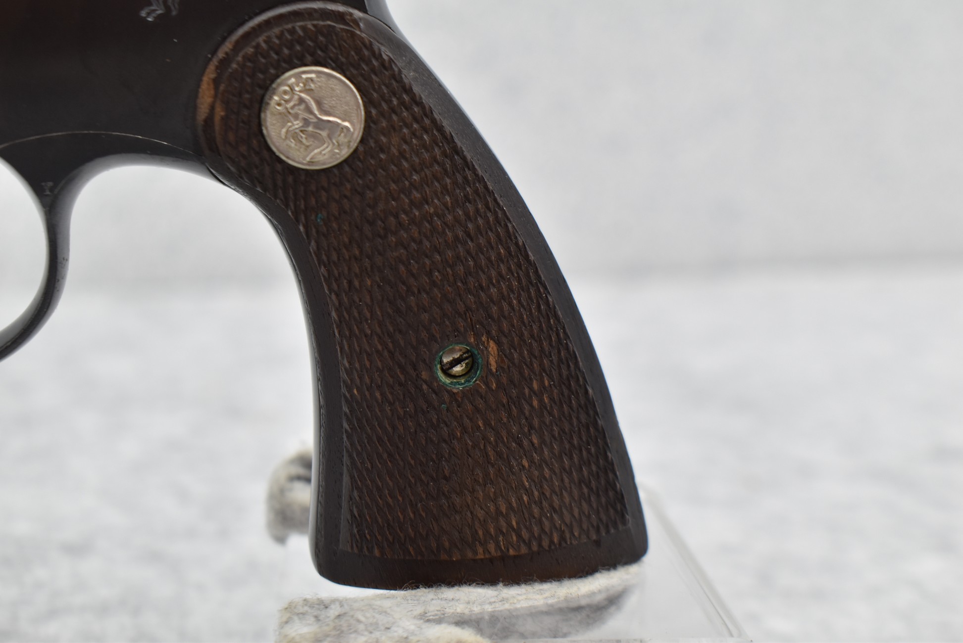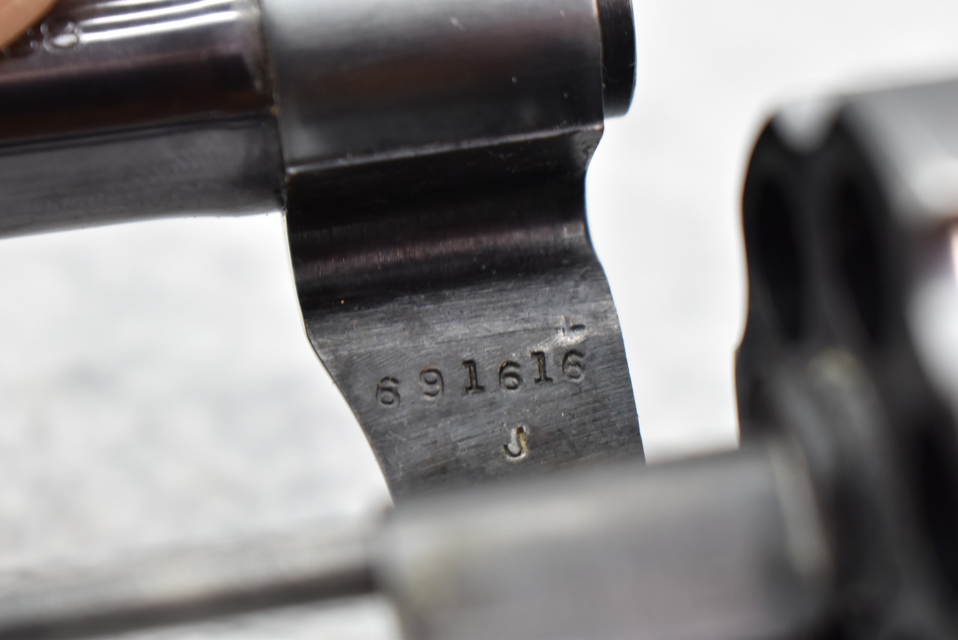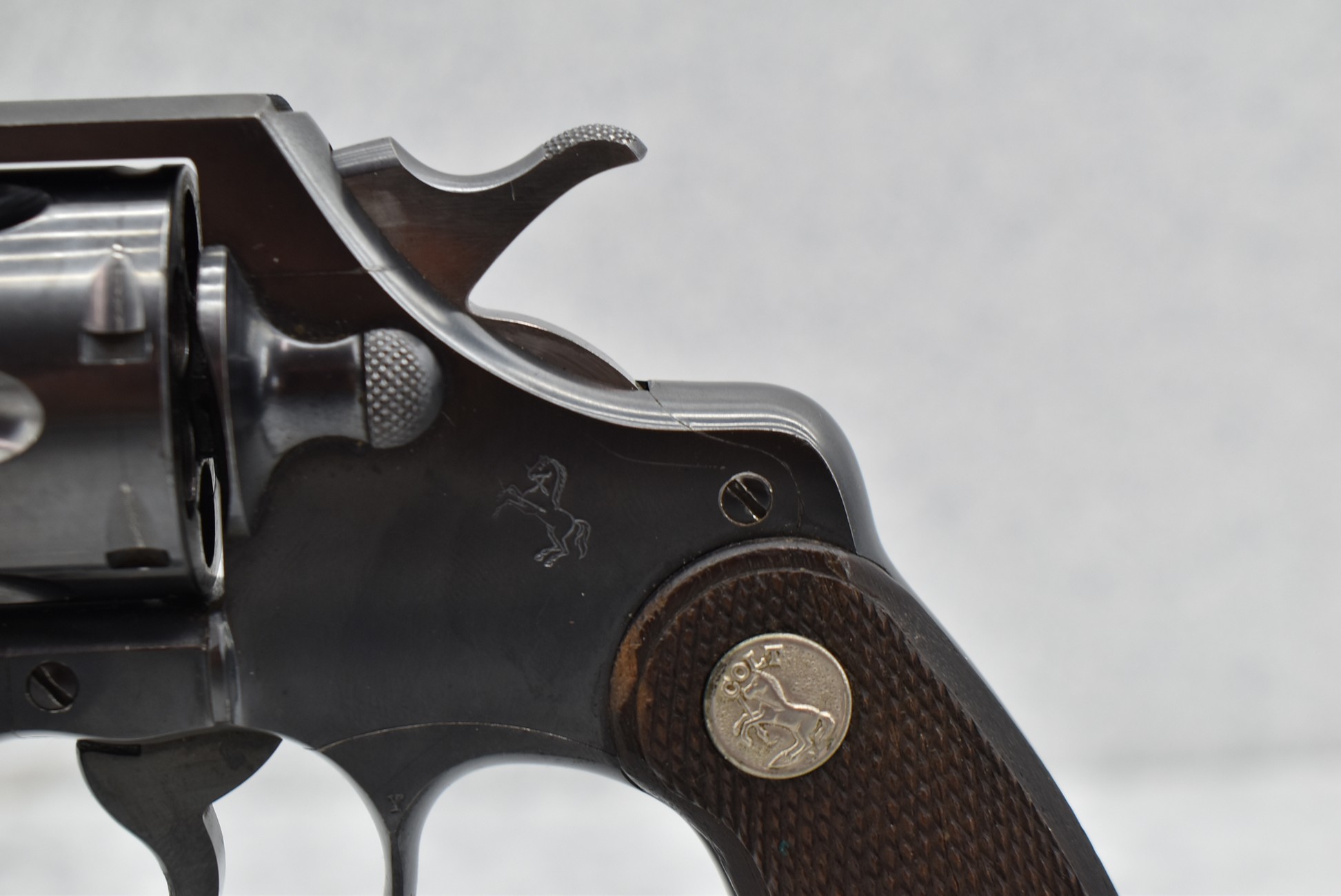 669R. Colt – Mod. Official Police (WWII Production) – 38 Spl. Cal. Double Action Revolver – w/4” Barrel w/Ramp Front & Groove Rear Sights – Blued Finish – w/Factory Checkered Walnut Grips w/Colt Medallion – Gun is Accompanied by Colt Factory Letter Which Shows the Gun Was Sold to E.I. DuPont de Nemours Co. & on February 28, 1942, it Was Shipped to E.I. DuPont in Wilmington, Delaware
