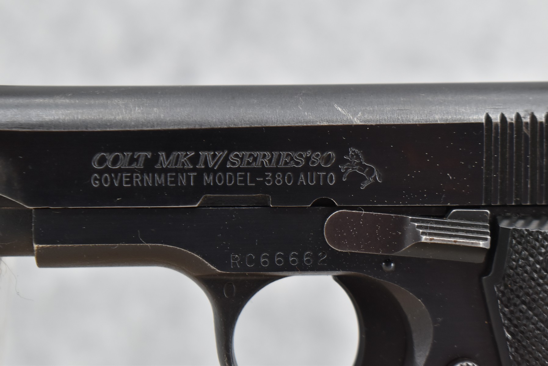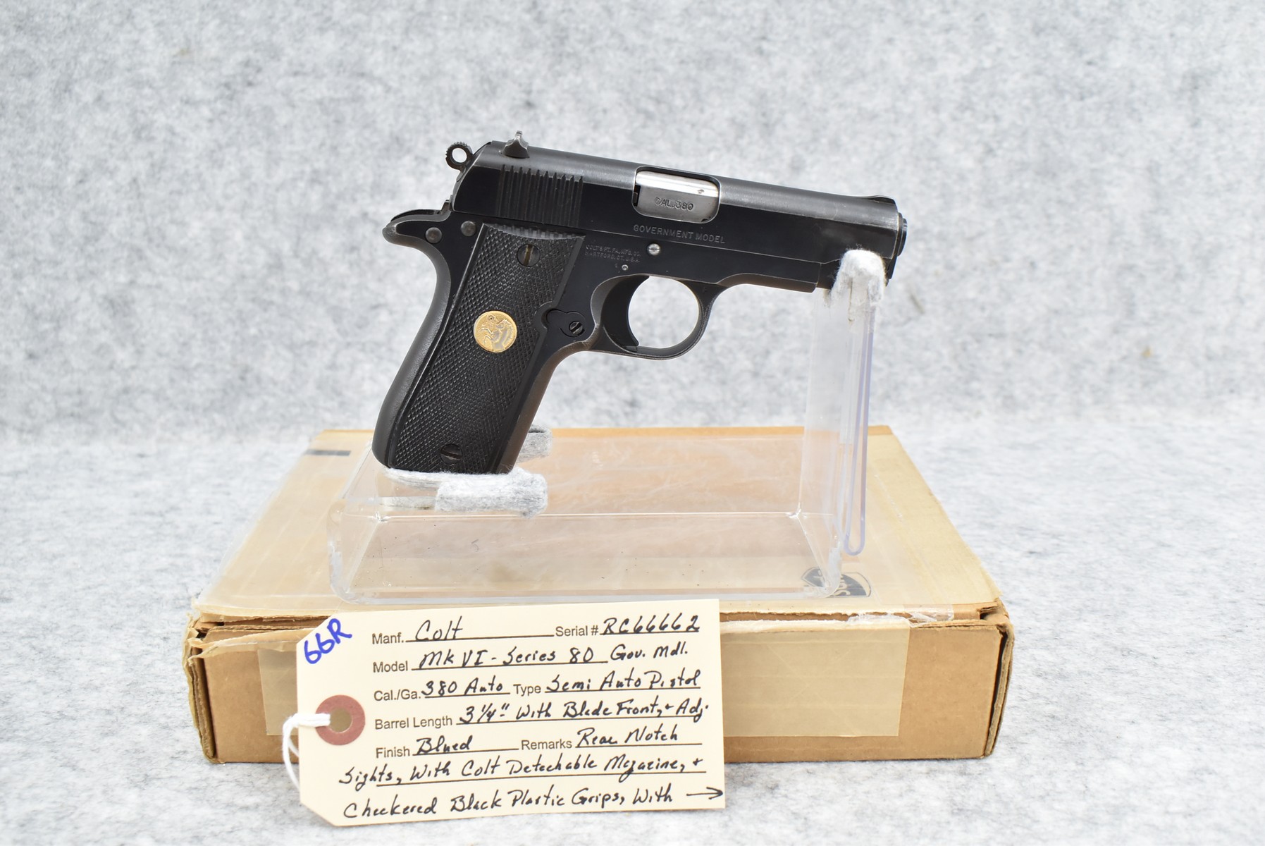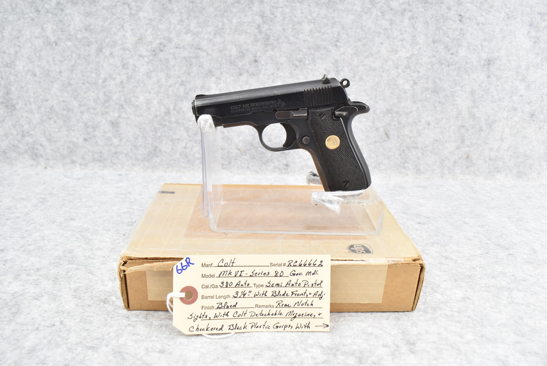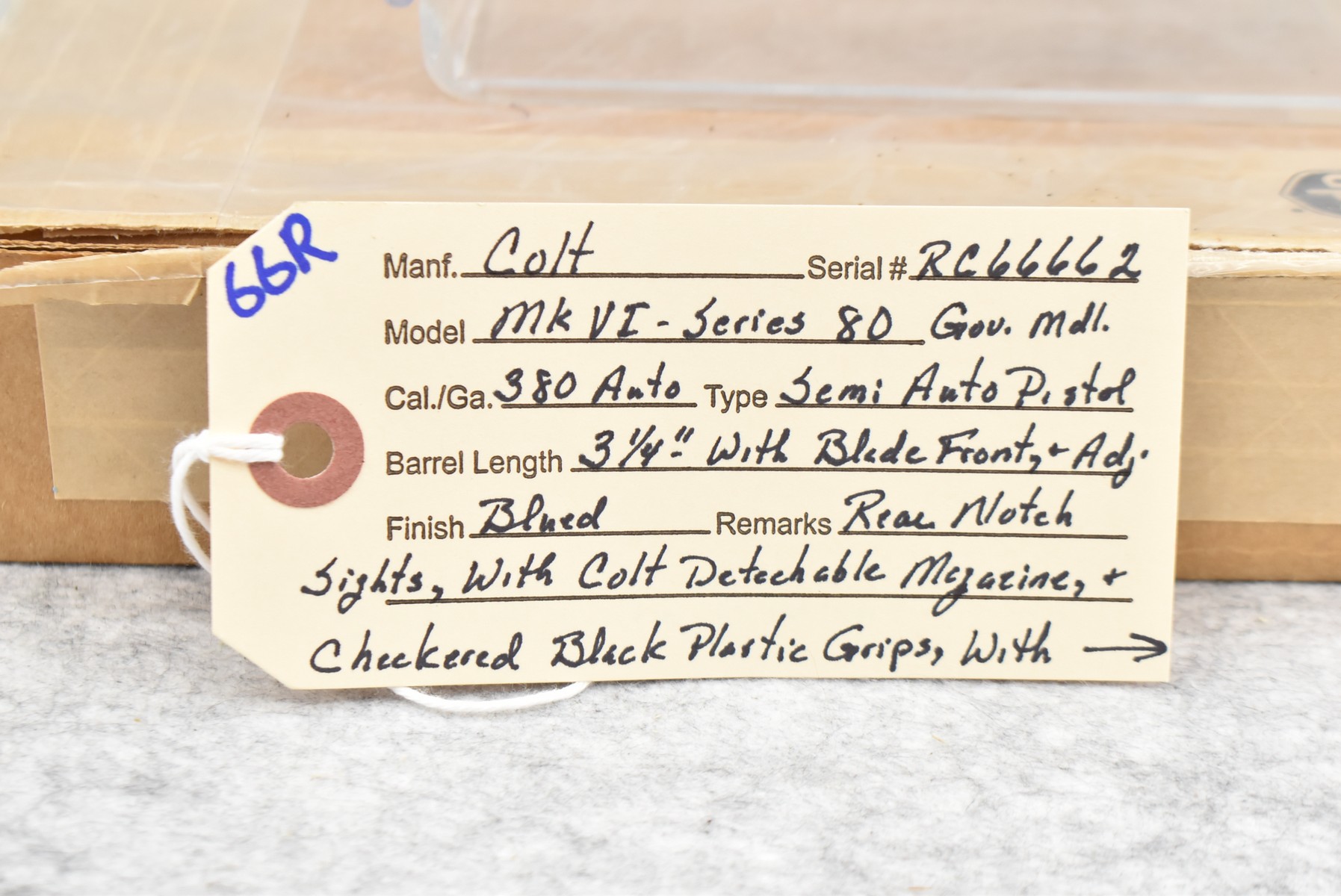 66R. Colt – Mod. MK VI -Series 80 Gov. Model – 380 Auto Cal. Semi-Auto Pistol – w/3 ¼” Barrel w/Blade Front & Adj. Rear Notch Sights – Blued Finish – w/Checkered Black Plastic Grips – w/Colt Detachable Magazine – w/UPS Shipping Box & Paperwork
