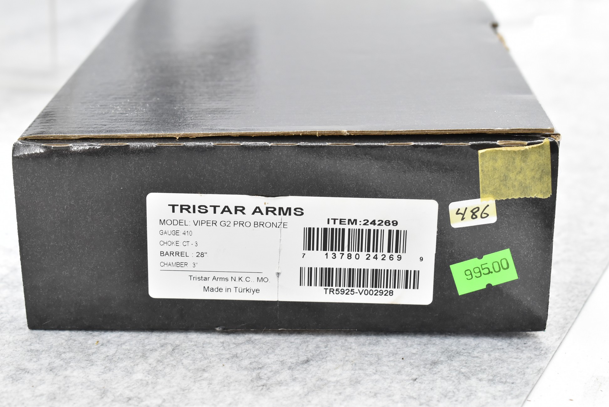 670R. Tri Star – Mod. Viper G2 Pro – 410ga. 3” Semi-Auto Shotgun – w/28” Vent Rib Barrel w/Fiber Optic Front Sight – Bronze Cerakote Finish w/Blued Barrel – w/Textured Pistol Grip Highly Figured Wood Stocks w/Factory Recoil Pad – As New w/Factory Box, Manual, and Factory Set of Chokes