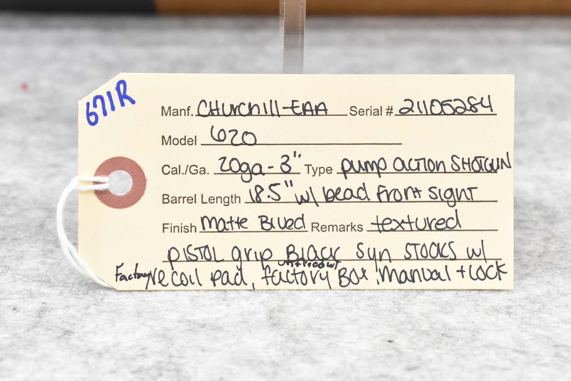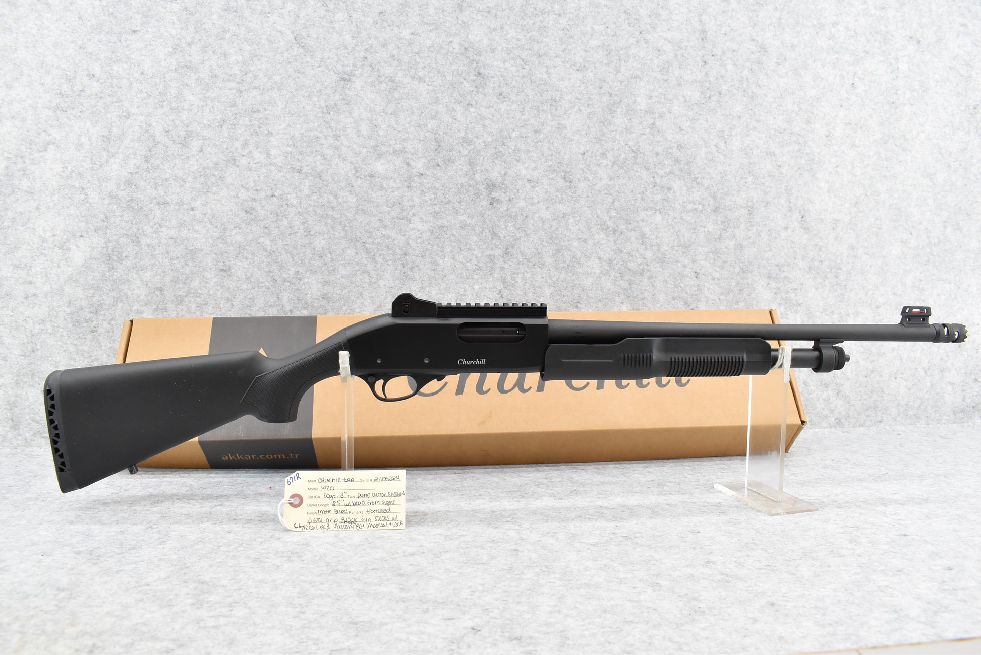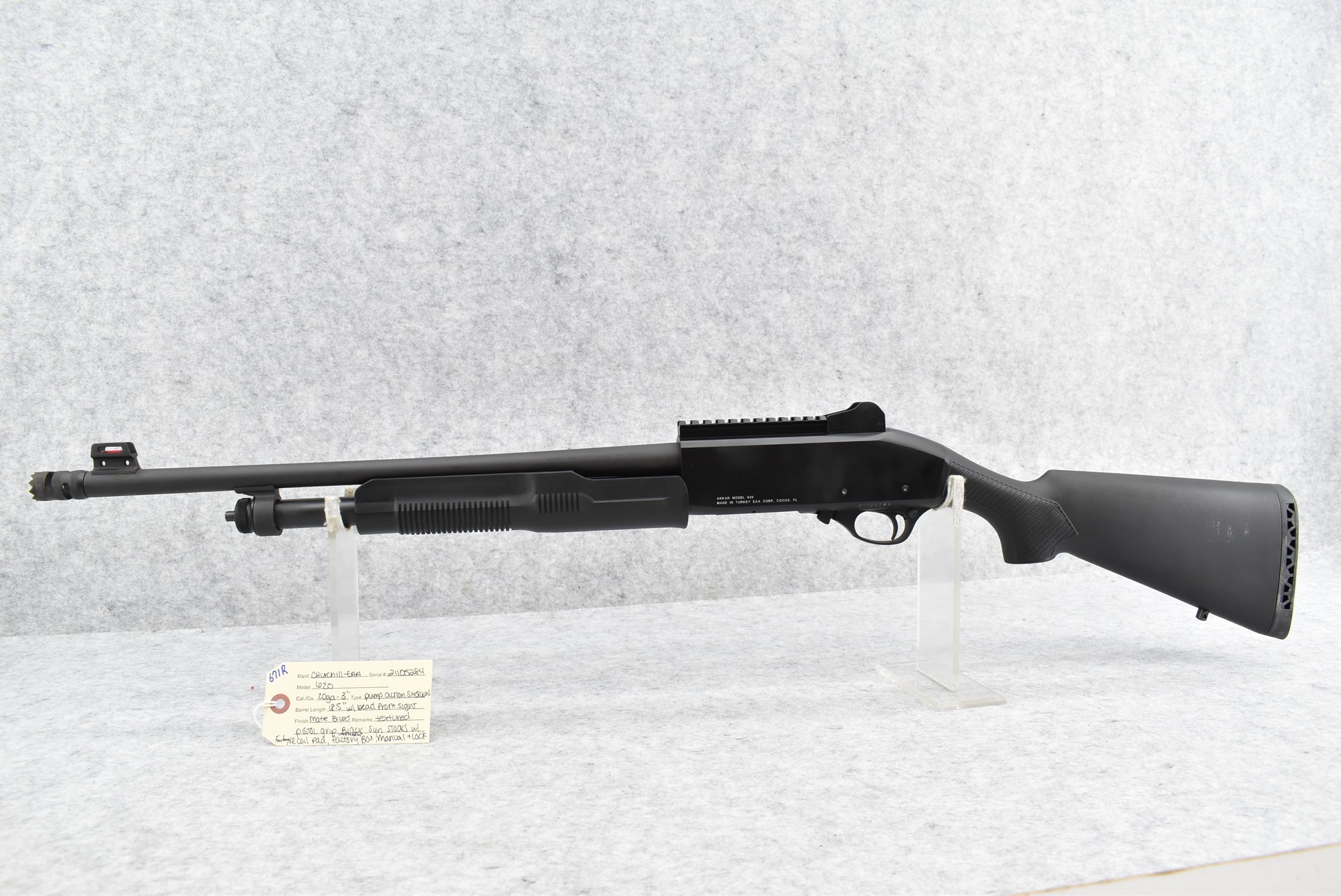 671R. Churchill-EAA – Mod. 620 – 20ga. 3” Pump Action Shotgun – w/18½” Barrel w/Beaded Front Sight – Matte Blued Finish – w/Checkered Pistol Grip Black Synthetic Stocks w/Factory Recoil Pad – Unfired w/Factory Box and Manual