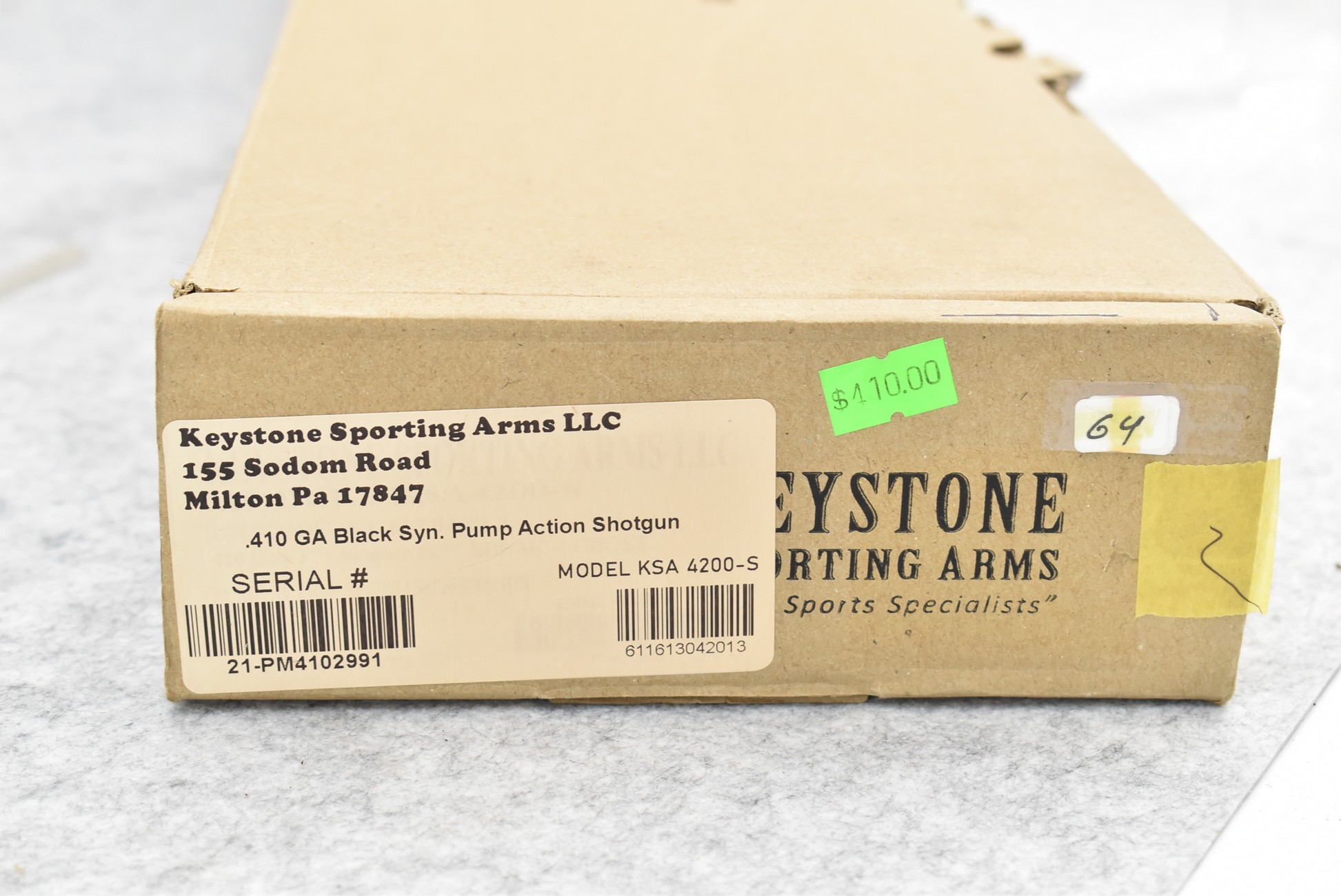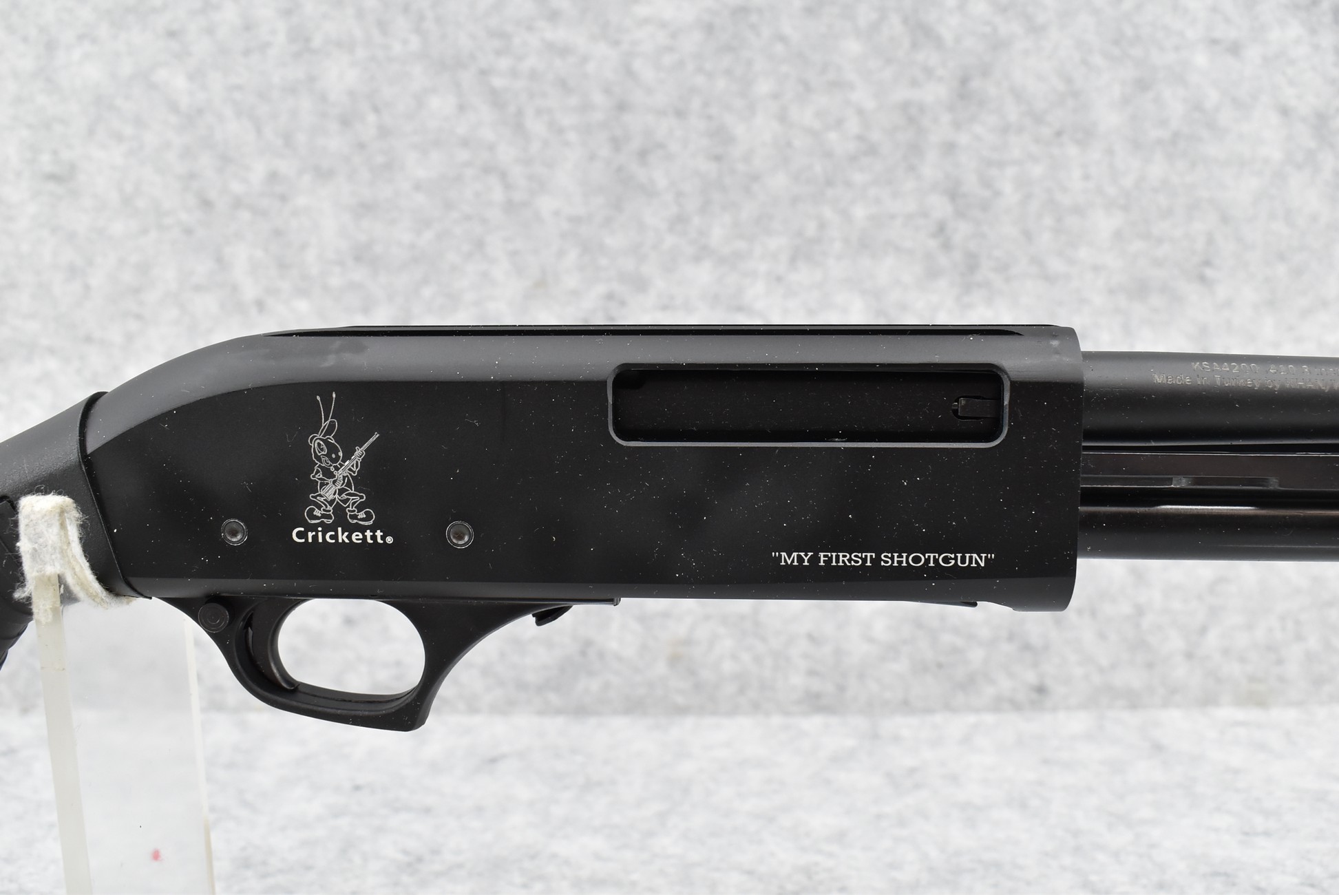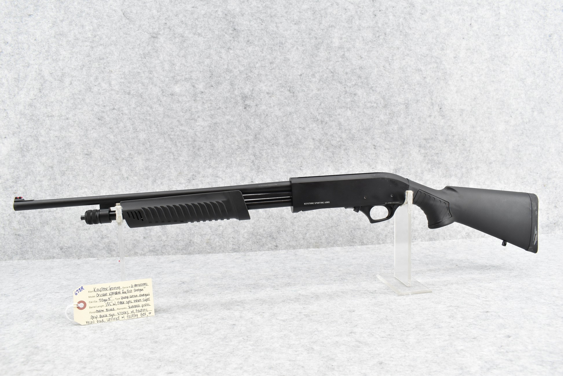 673R. Keystone Sporting – Mod. Crickett KSA4200 “My First Shotgun” – 410ga. 3” Pump Action Shotgun – w/18½” Barrel w/Fiber Optic Front Sight – Matte Blued Finish – w/Ribbed Pistol Grip Black Synthetic Stocks w/Factory Recoil Pad – w/Stock Extensions – Unfired w/Factory Box and Manual