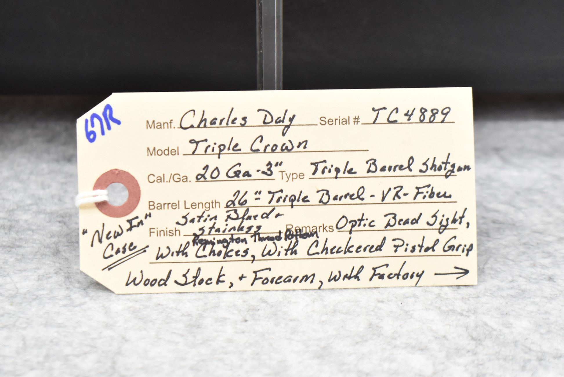 67R. Charles Daly – Mod. Triple Crown – 20ga. 3” Triple Barrel Shotgun – w/26” Vent-Rib Barrels w/Fiber Optic Bead Sight & Remington Thread Pattern Chokes – Satin Blued/Stainless Finish – w/Checkered Pistol Grip Wood Stocks w/Factory Butt Pad – New w/Factory Box, Hard Case, 2 Extra Chokes, Choke Wrench & Manual