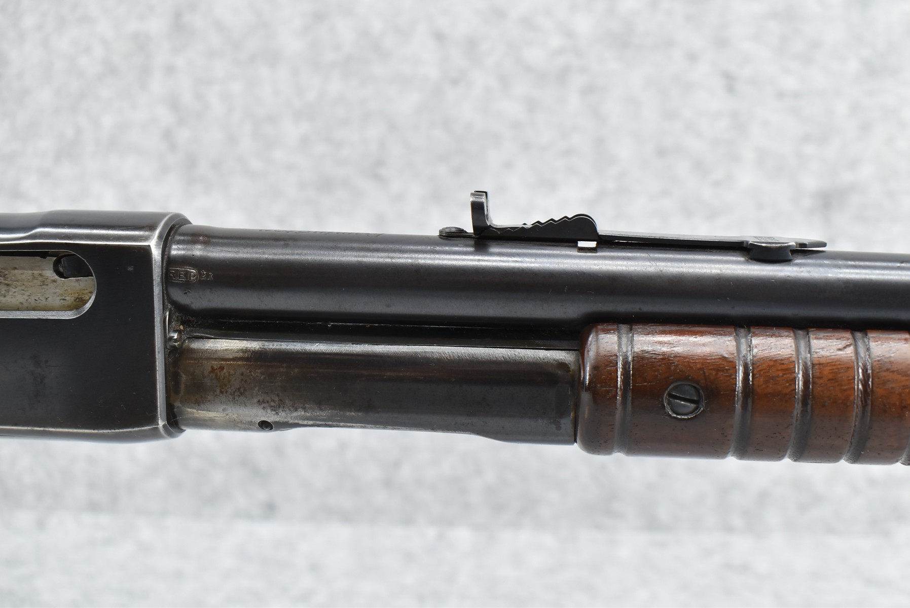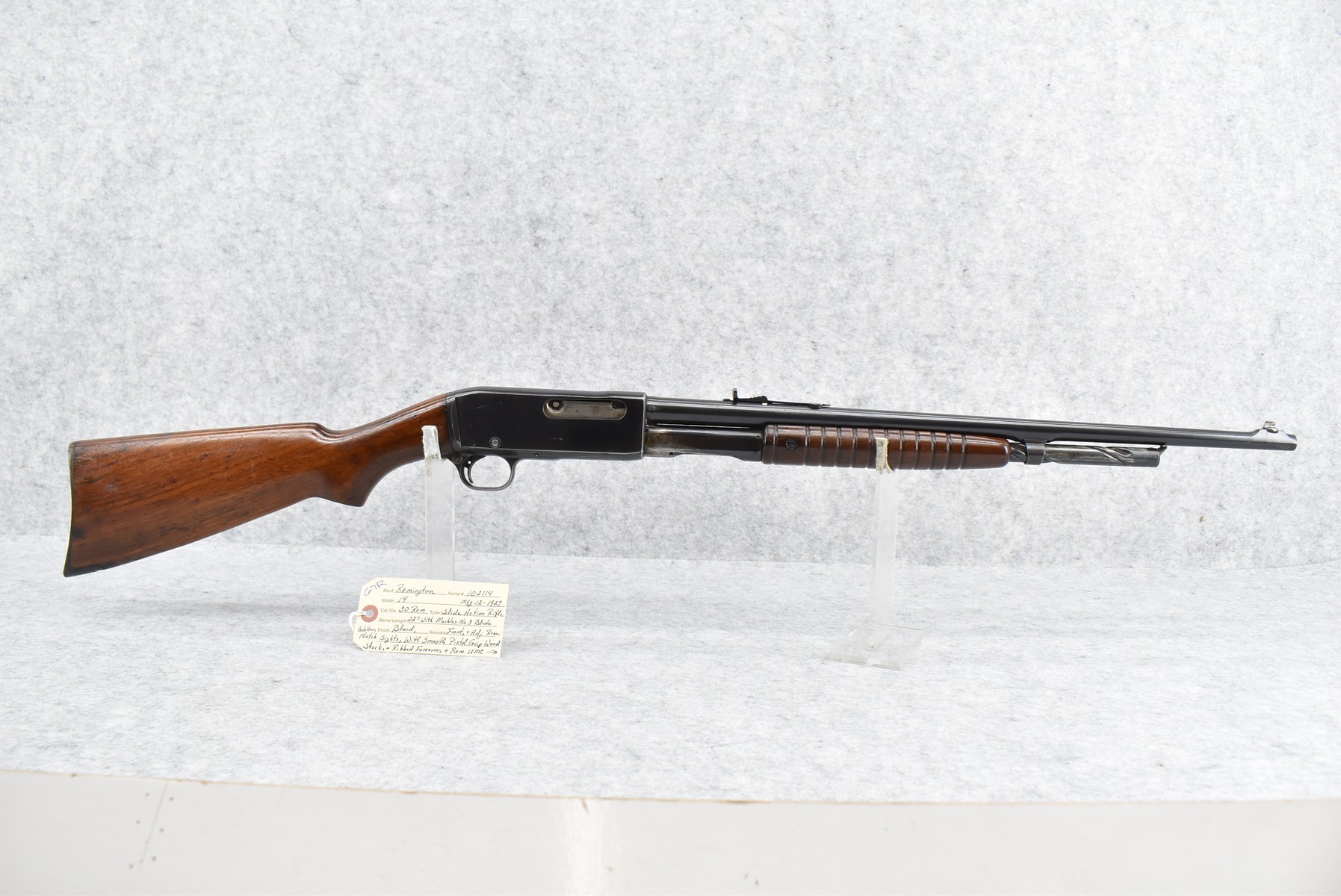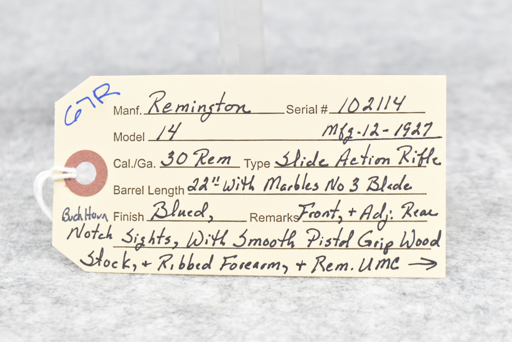67R. Remington – Mod. 14 – 30 Rem. Cal. Pump Action Rifle – w/22” Barrel w/Marbles No. 3 Blade Front & Adj. Rear High Buckhorn Sights – Blued Finish – w/Smooth Pistol Grip Wood Stock & Ribbed Forearm w/Rem-UMC Factory Metal Butt Plate – Mfg. 12/1927