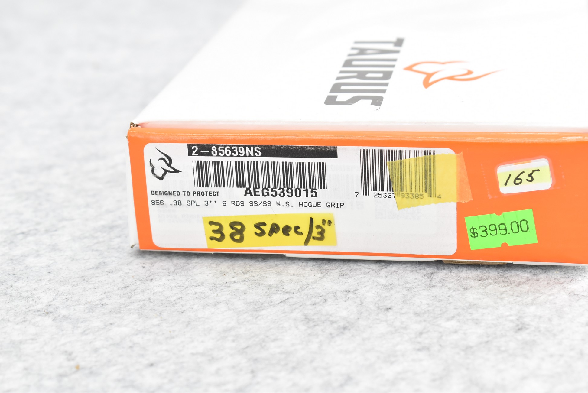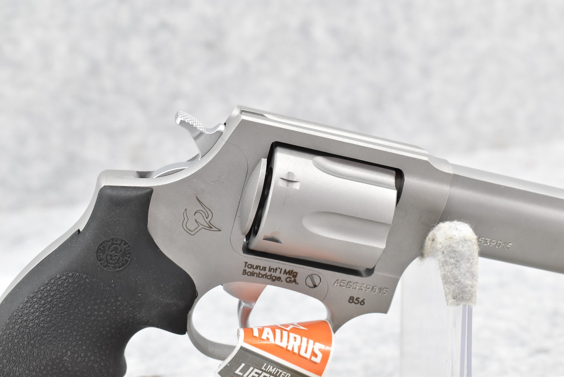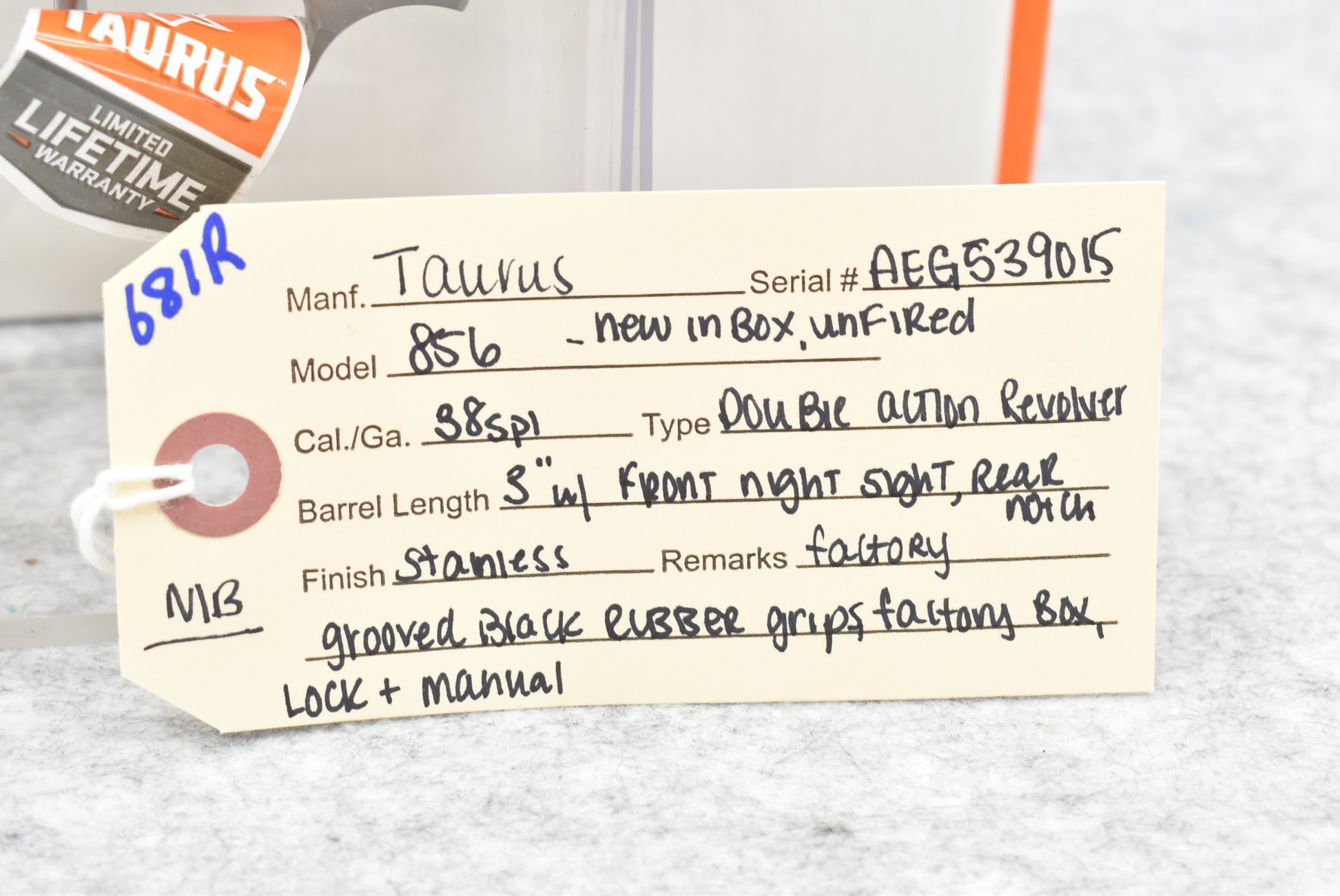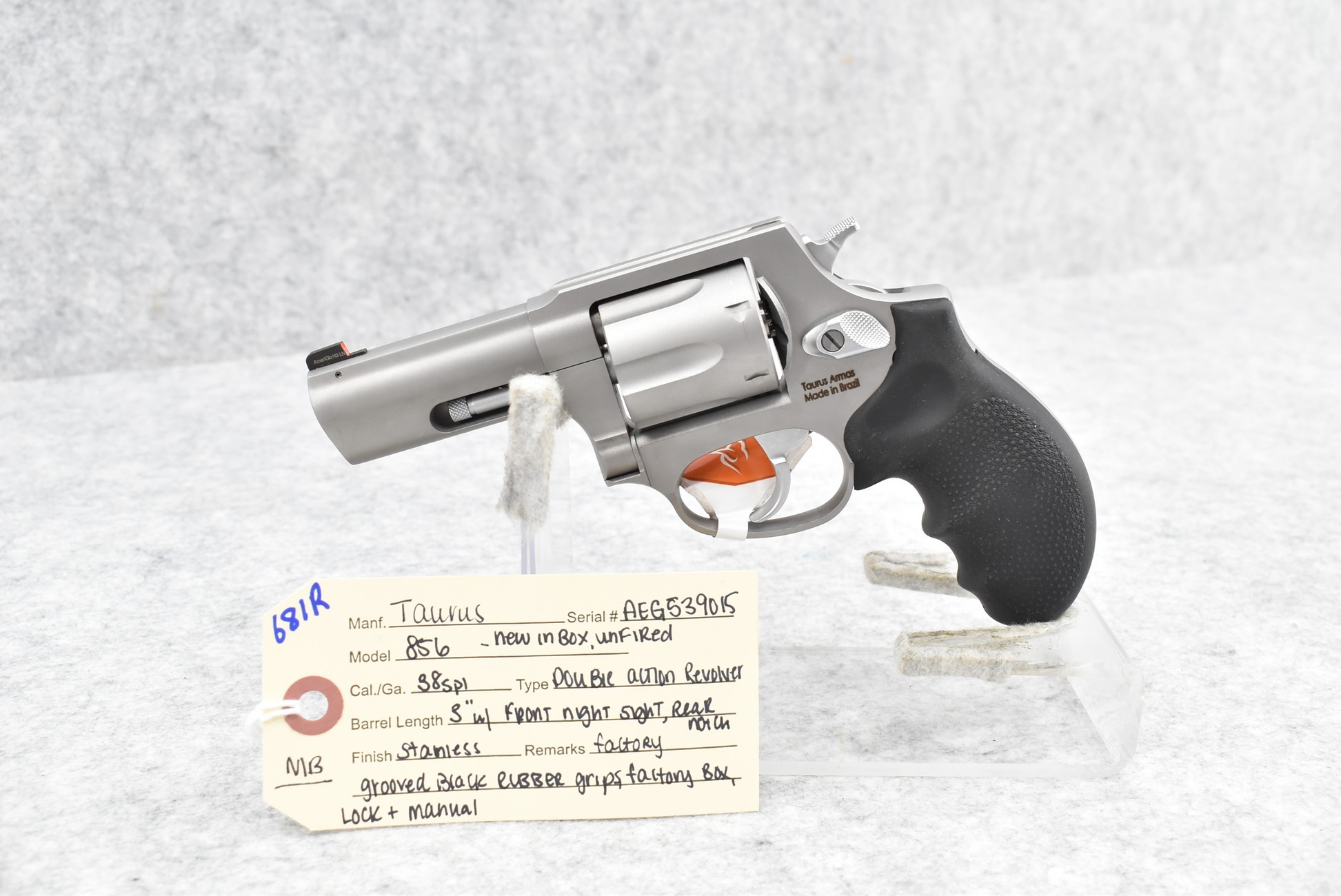 681R. Taurus – Mod. 856 – 38 Spl. Cal. Double Action Revolver – w/3” Barrel w/Front Night and Rear Notch Sights – Stainless Finish – w/Factory Grooved Black Rubber Grips – Unfired w/Factory Box and Manual