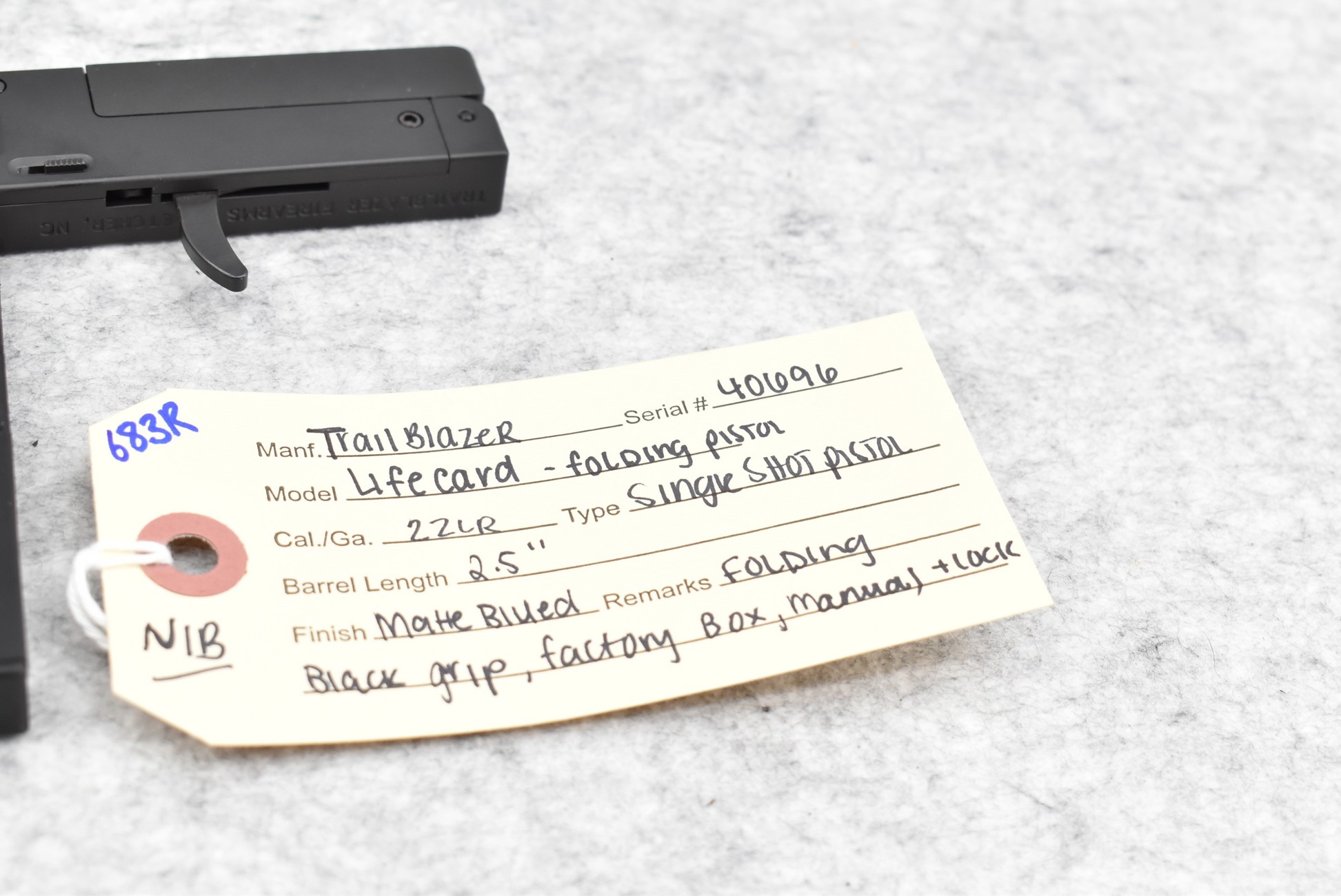 683R. Trailblazer – Mod. Lifecard Folding Pistol – 22LR Cal. Single Shot Pistol – w/2½” Barrel – Matte Blued Finish – w/Folding Black Grip – Unfired w/Factory Box and Manual (CANNOT GO TO MARYLAND!)