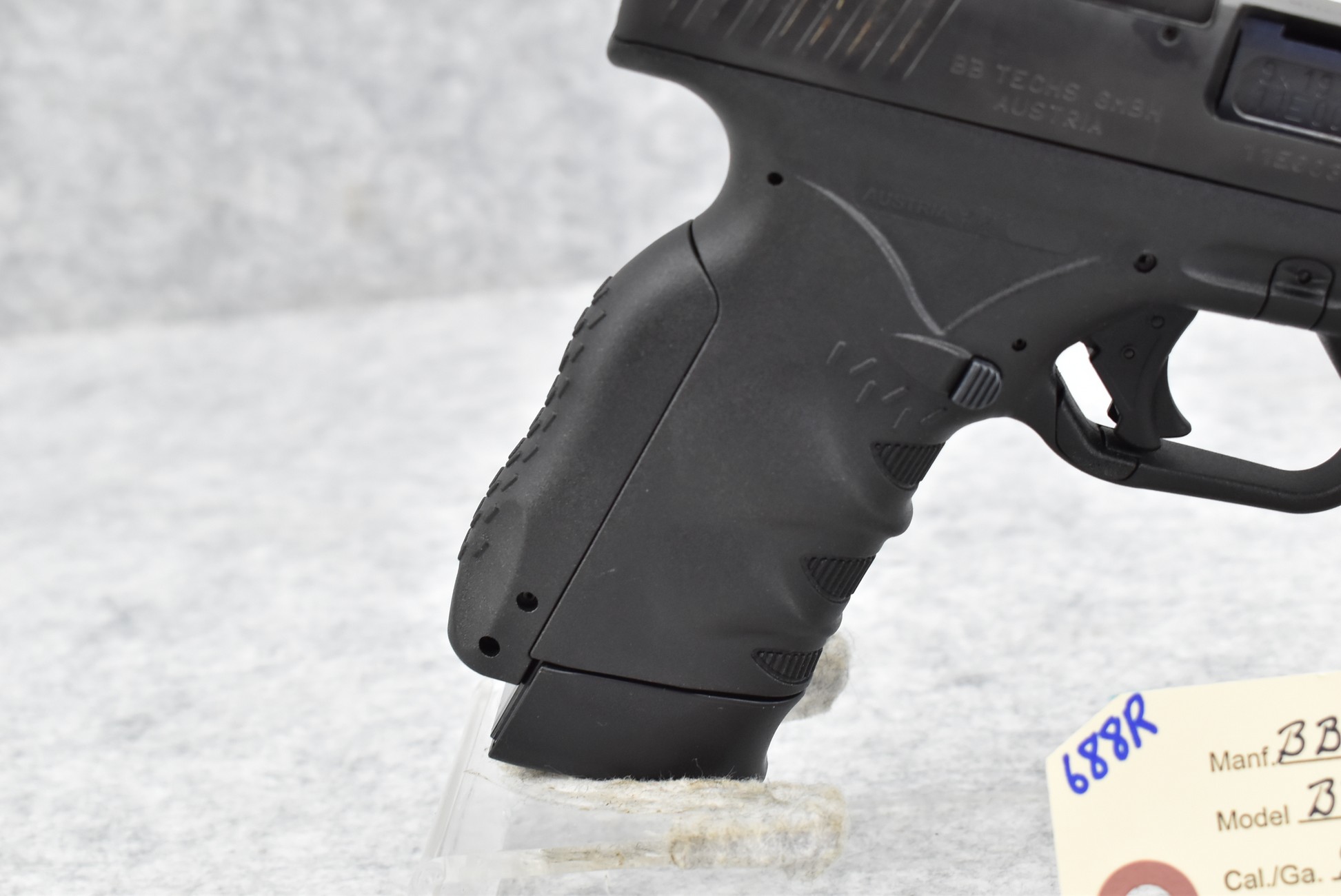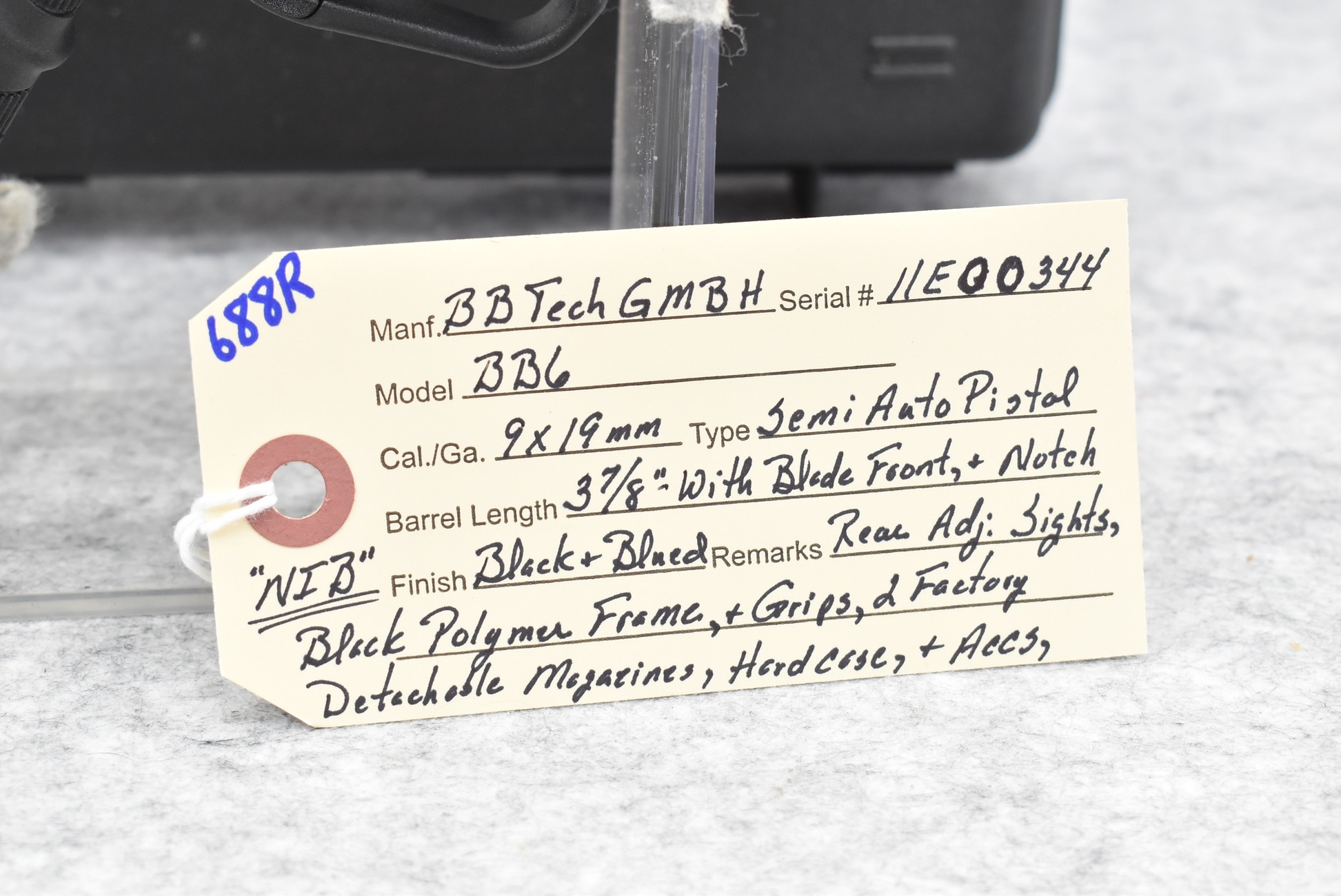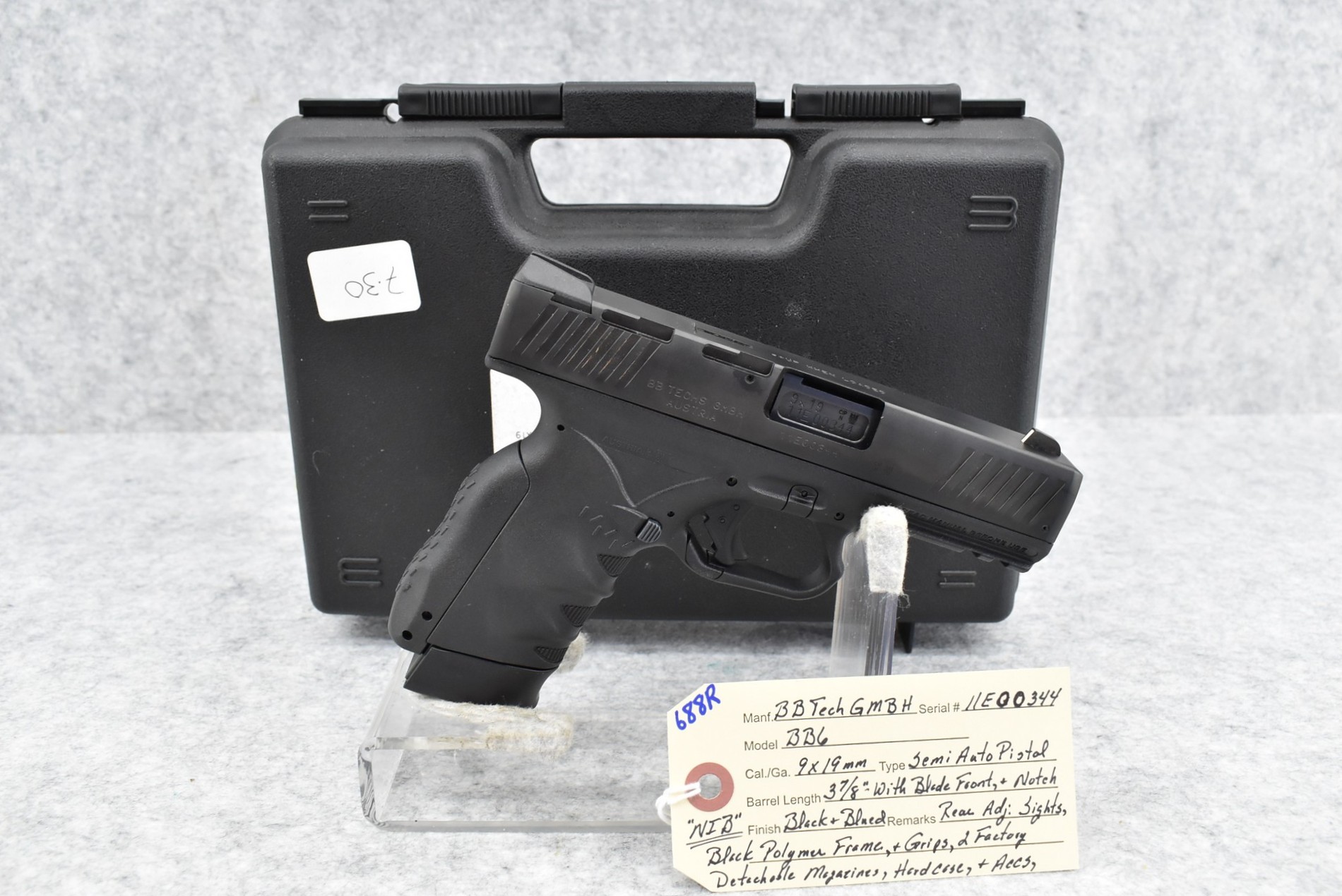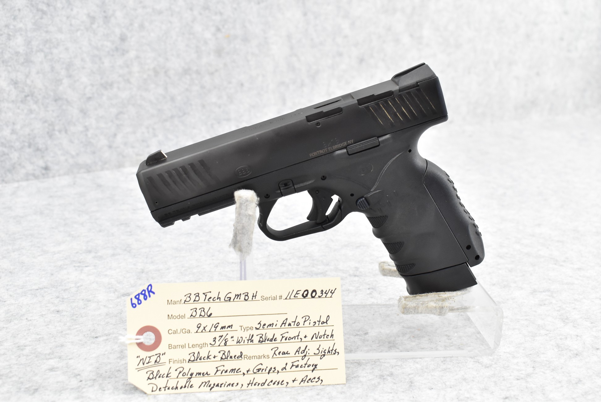688R. BB Tech GMBH – Mod. BB6 – 9mm Cal. Semi-Auto Pistol – w/3 7/8” Barrel w/Blade Front and Adjustable Rear Notch Sights – Blued Finish – w/Black Polymer Frame and Grips – w/2 Factory Detachable Magazines – Unfired w/Hard Case